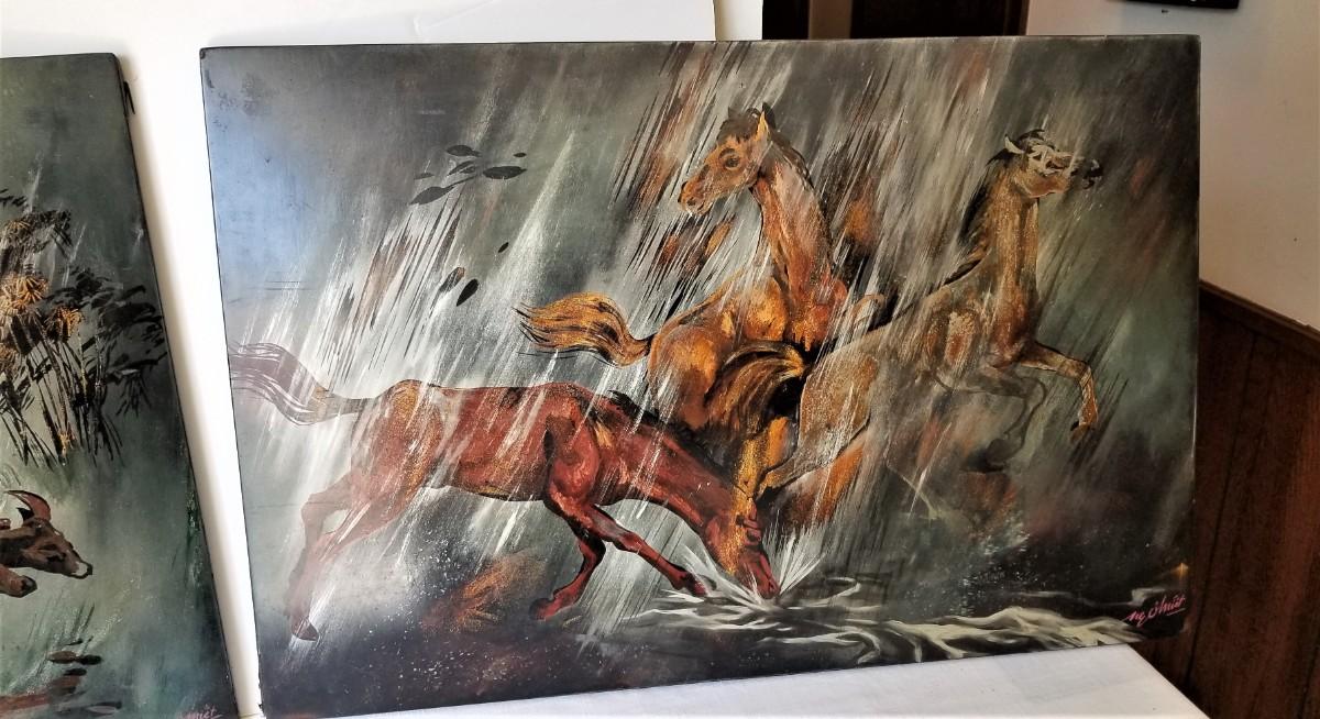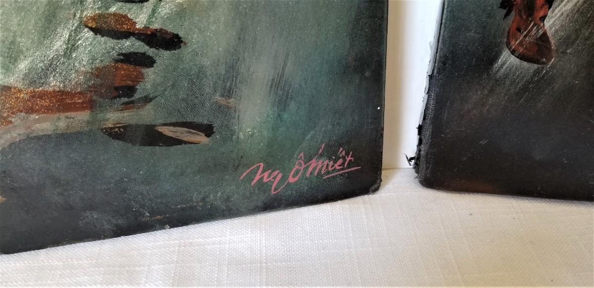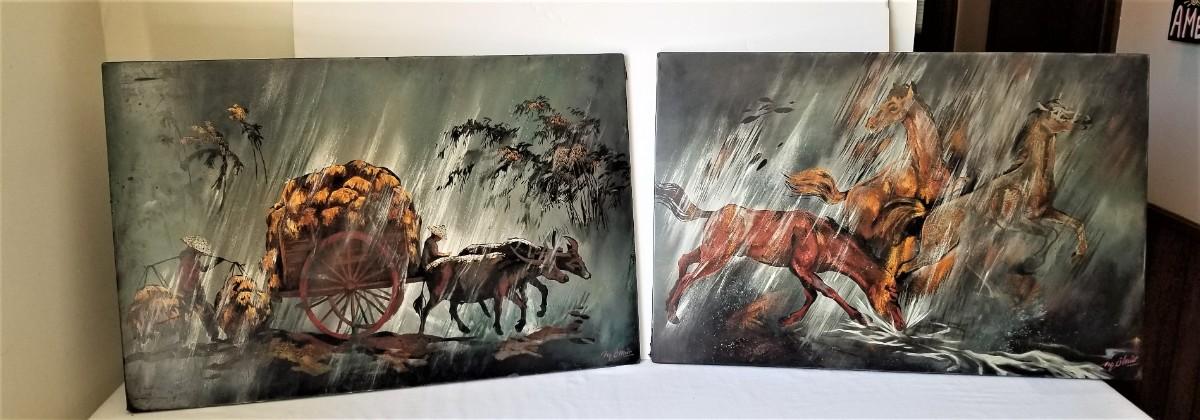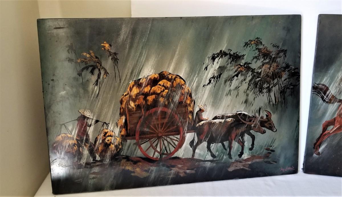 These two paintings were obtained in Southeast Asia during the Vietnam War era - signed "Ng Omiet." Both well executed - each measures 23.75" across and 15.75" tall. You get both paintings.