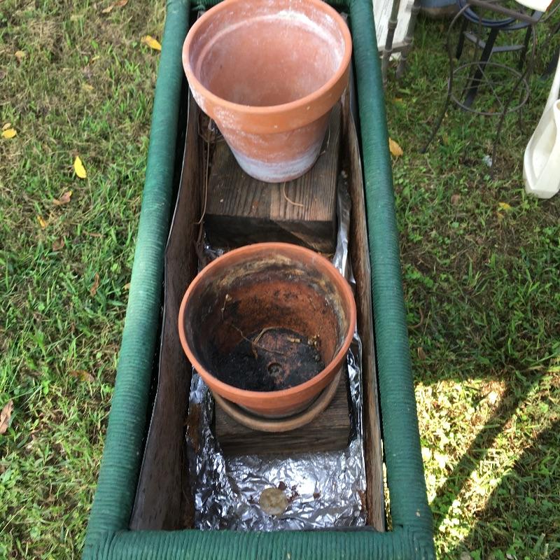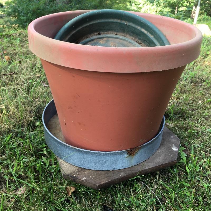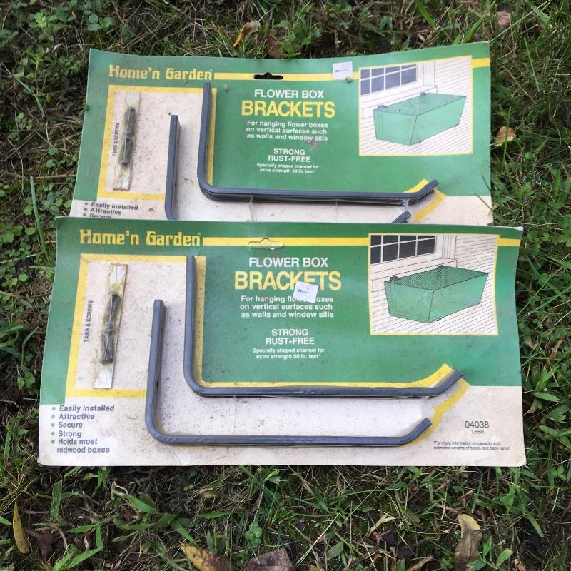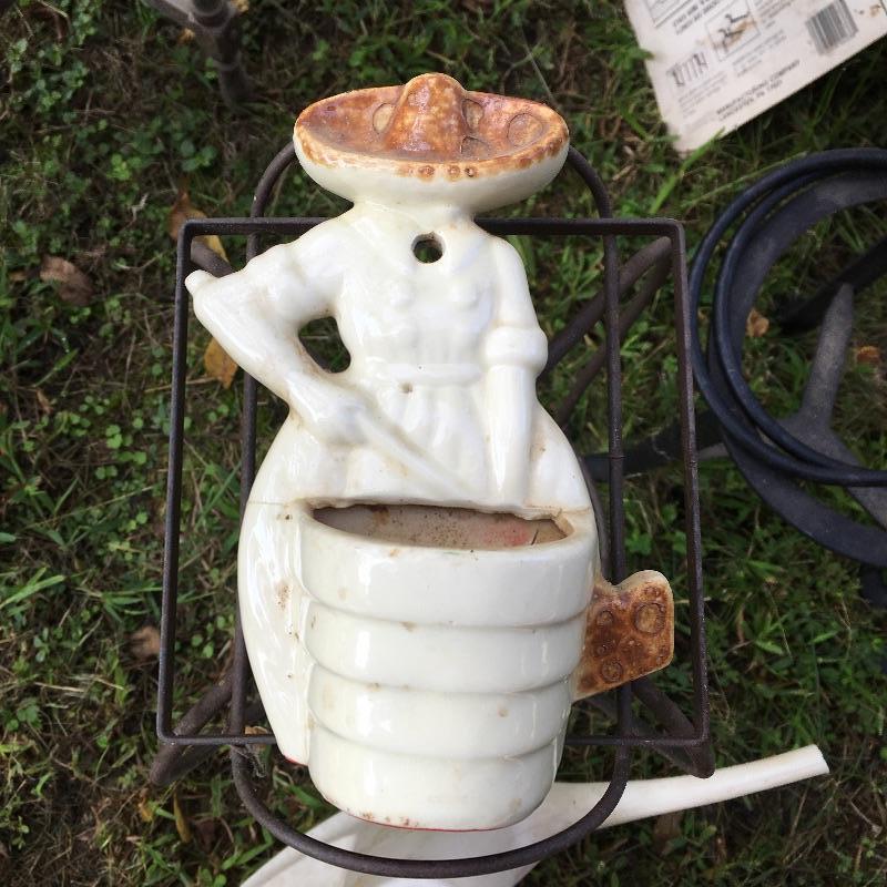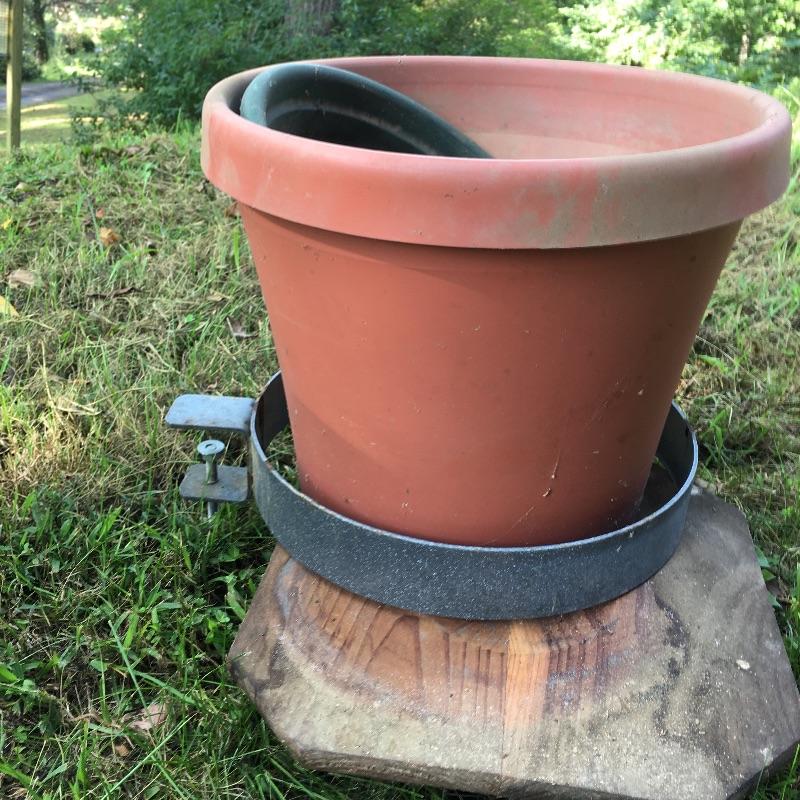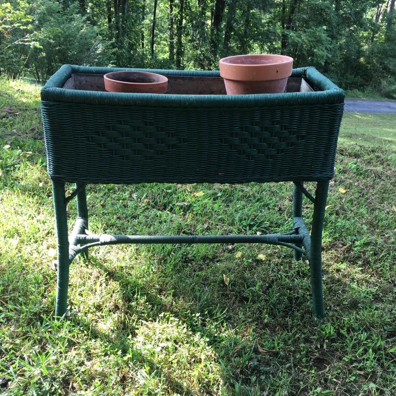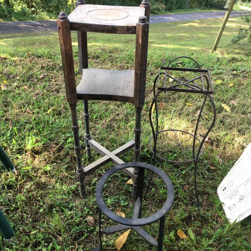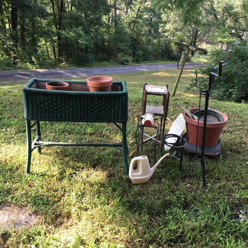 Lots of plant pots and stands options for you here with this array that includes a woven green tall planter, three metal stands, a wooden stand, two terracotta pots, one larger plastic pot with metal holder and wooden base with wheels. Planter brackets and more are included. The beautiful ceramic white plant pot that depicts an image of a lady tending to her garden is free-standing, but can be hung with a nail or something of the sort.