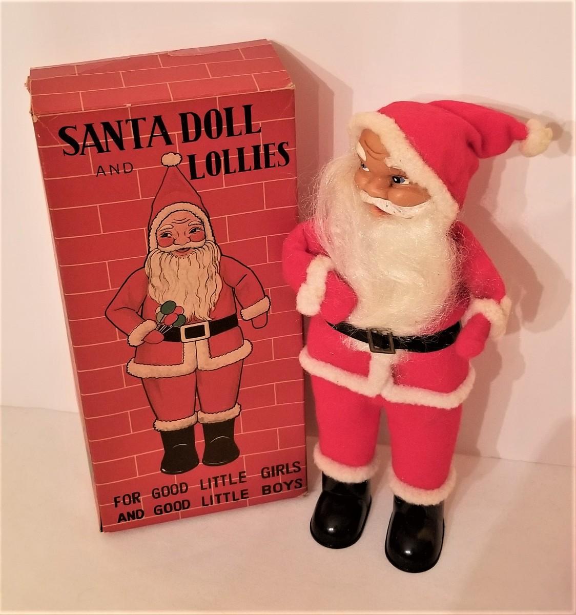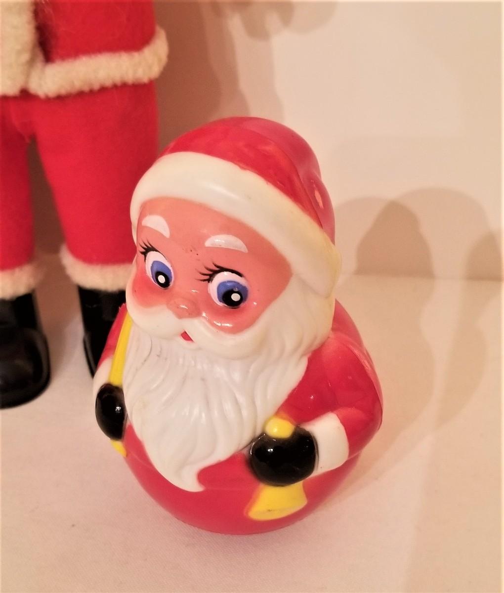 Two very cute vintage Santas - the smaller a roly-poly with chimes (Kiddie Products Inc - 1970's) - the other a stand up with original box (the lollipops that came with it, of course, are long gone). Box is 9" x 4.5". Good vintage condition.
