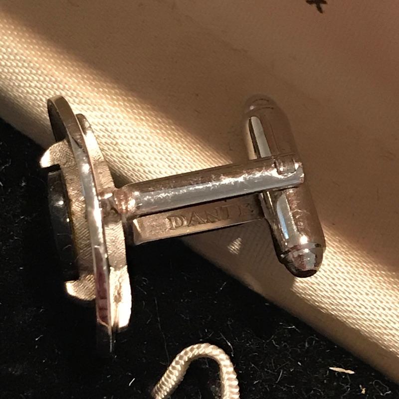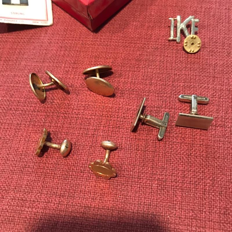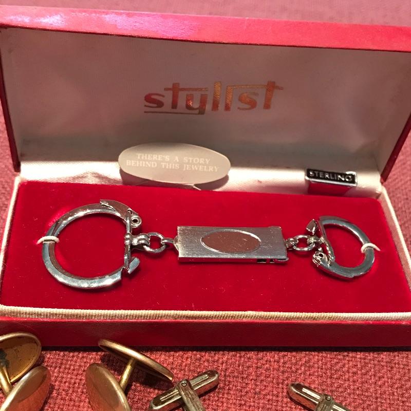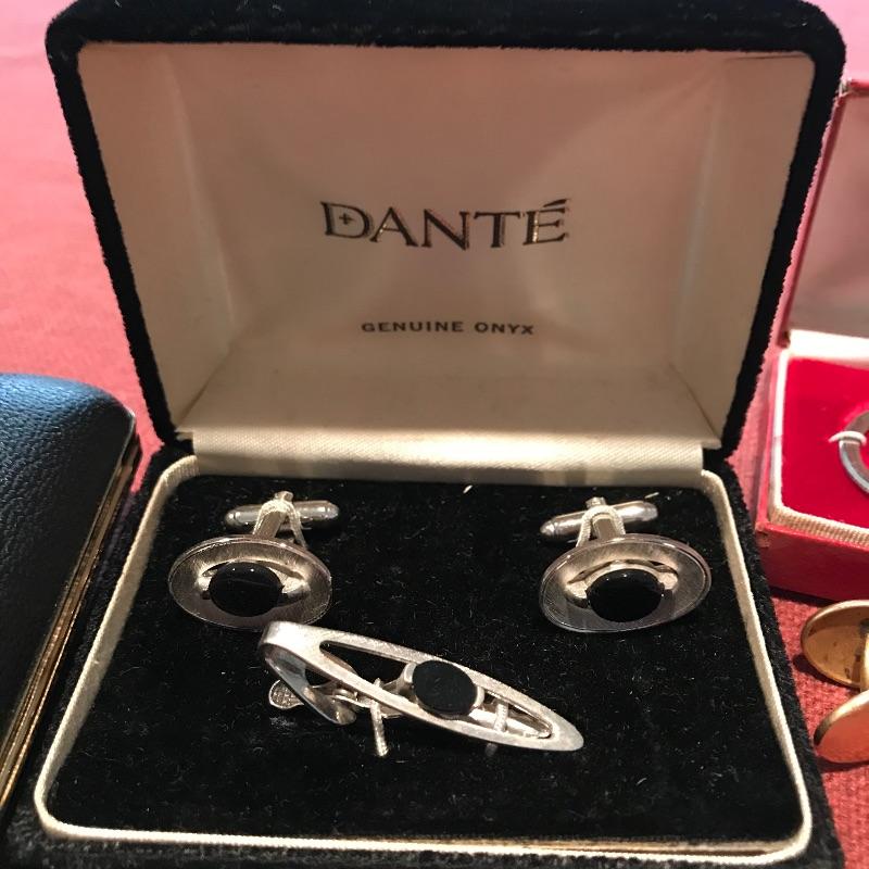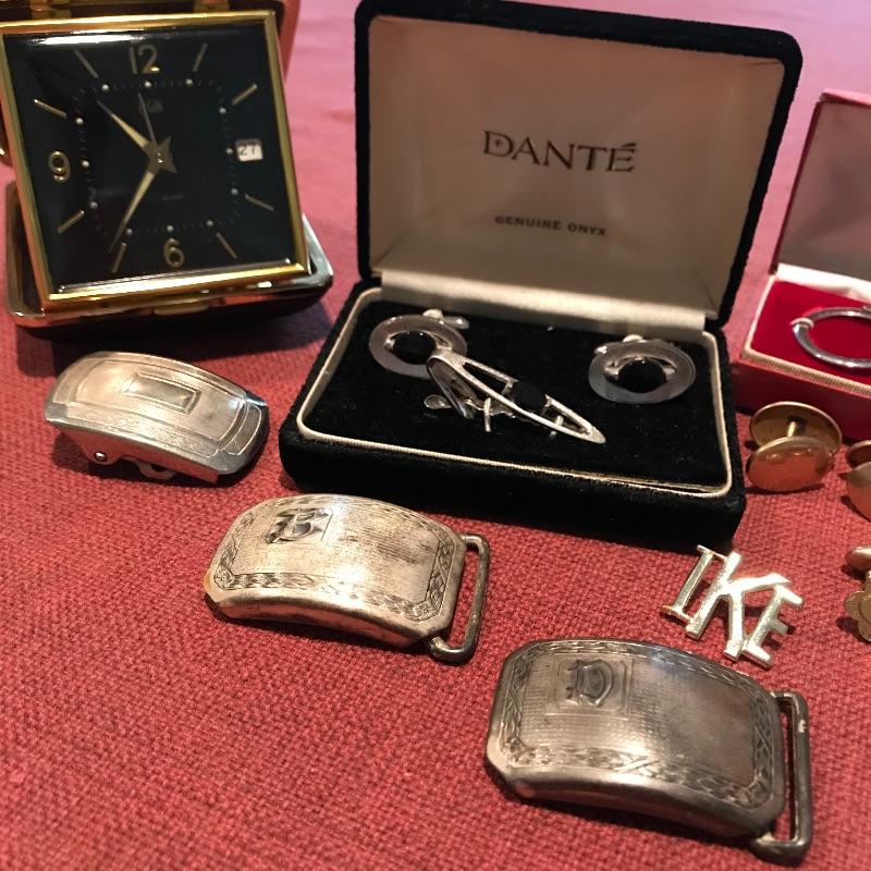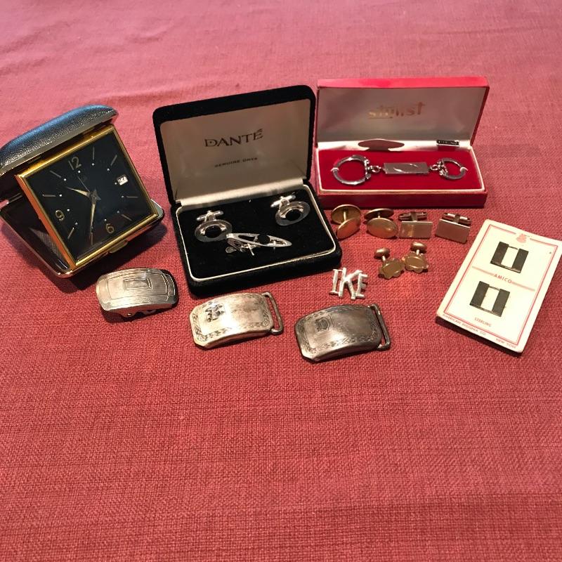 Vintage men’s collection of cufflinks including an onyx set by Dante with a tie clip. Lot contains three belt buckles, two with Asian style letters by Hickok and a third with no known markings. Lot contains two pins in paper “packaging” marked Sterling and a Stylist sterling keychain. Lastly, a travel alarm clock by Elgin in very fine shape. See photos. Shipping available.