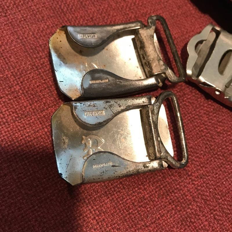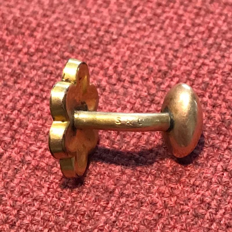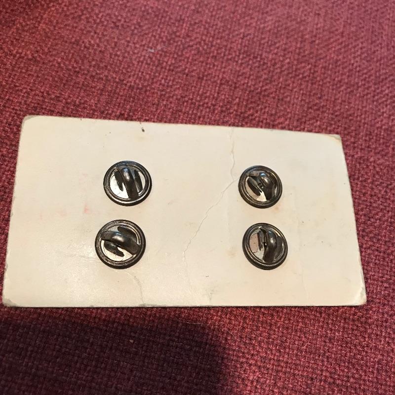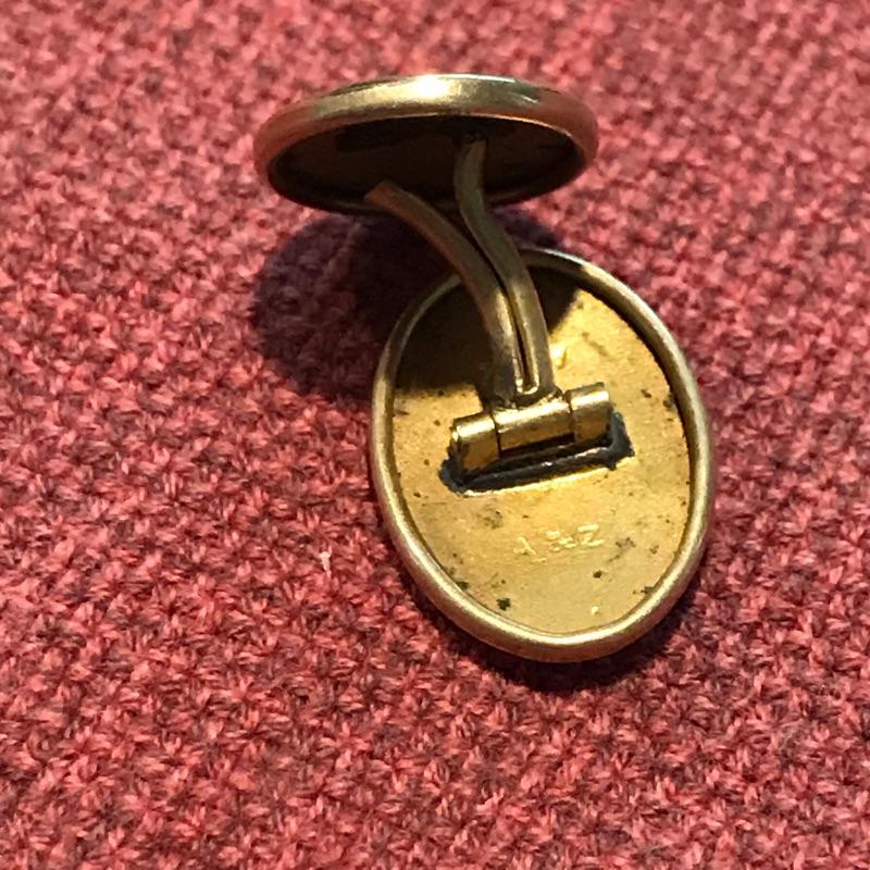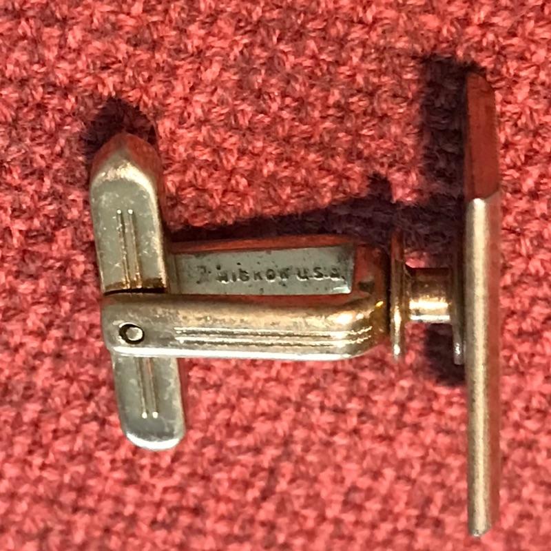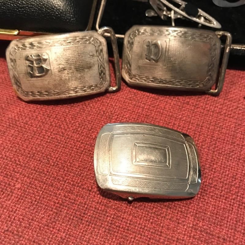 Vintage men’s collection of cufflinks including an onyx set by Dante with a tie clip. Lot contains three belt buckles, two with Asian style letters by Hickok and a third with no known markings. Lot contains two pins in paper “packaging” marked Sterling and a Stylist sterling keychain. Lastly, a travel alarm clock by Elgin in very fine shape. See photos. Shipping available.