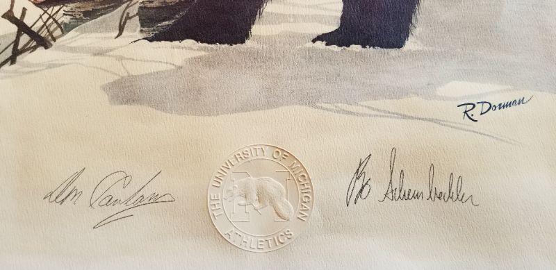 Lot 2-471: Vintage Raised Seal 1970's Official UNIVERSITY OF MICHIGAN Wolverine FINE ART PRINT Signed by HEAD COACH Bo Schenbeckler