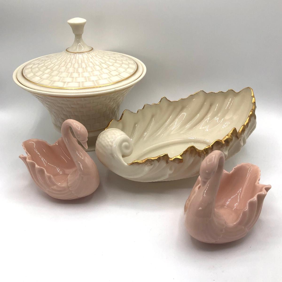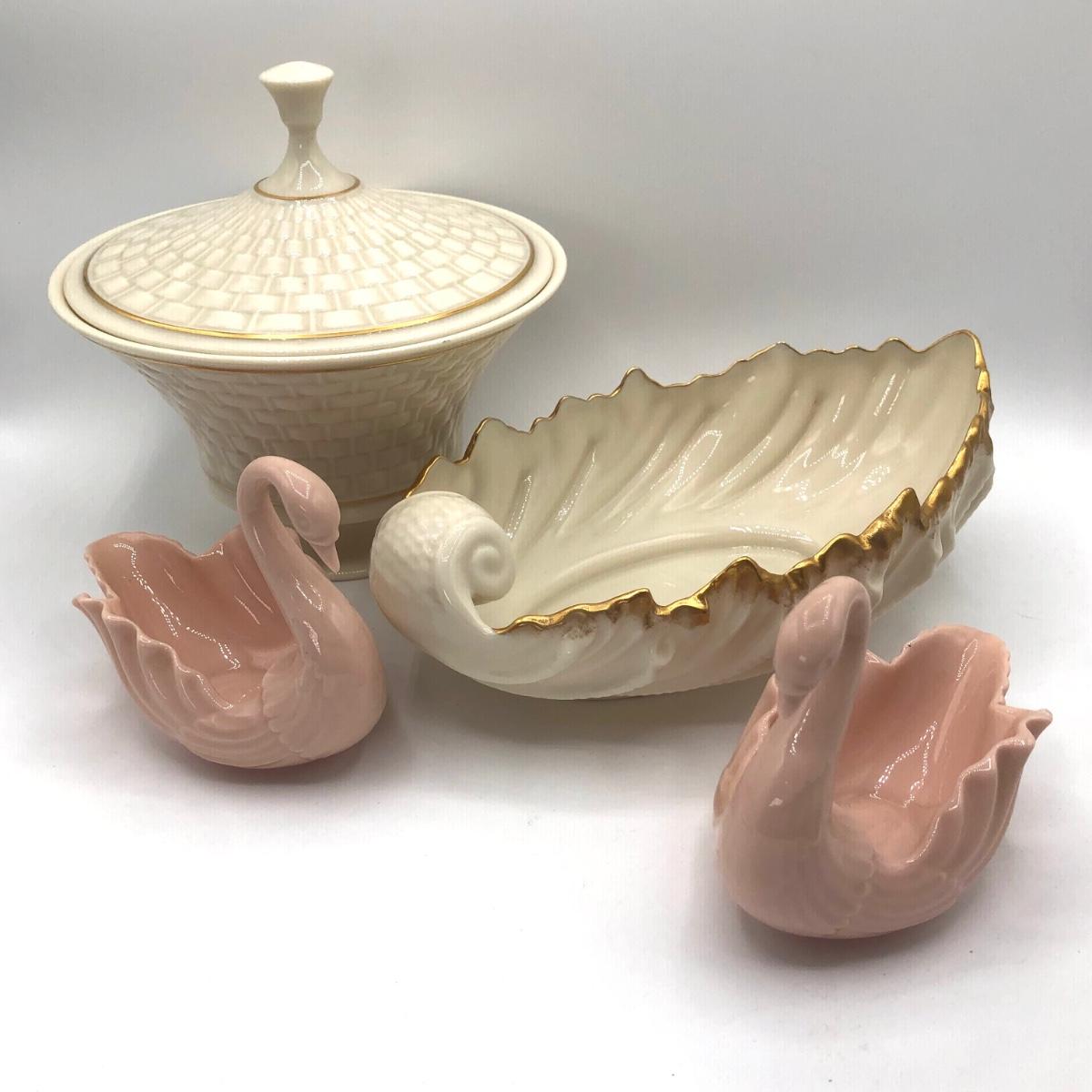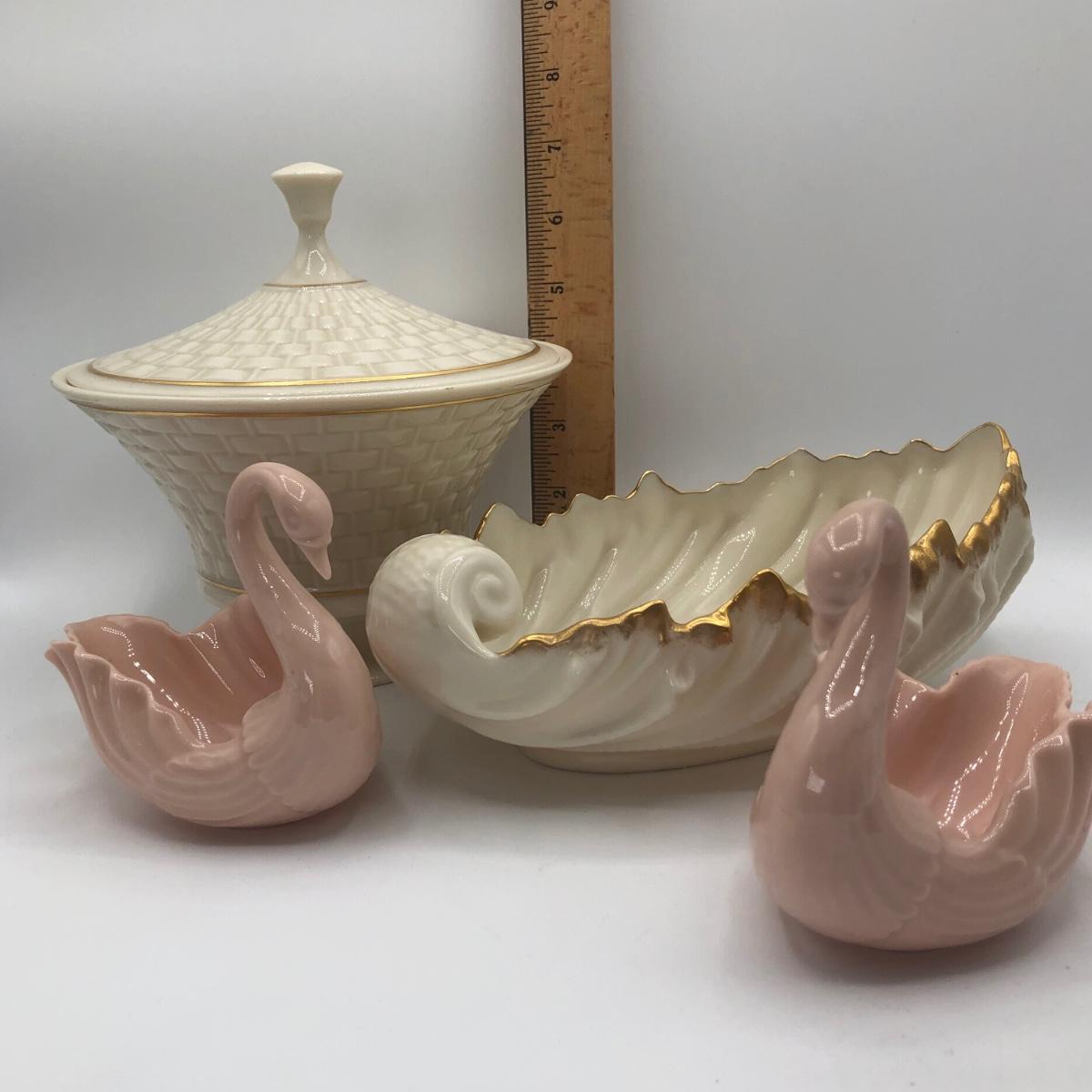 LOT 247F: Lenox Collection - Woven Basket Lidded Dish, Pink Swans & Wave Dish