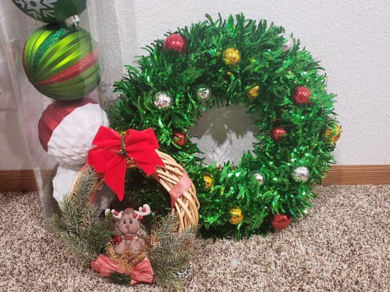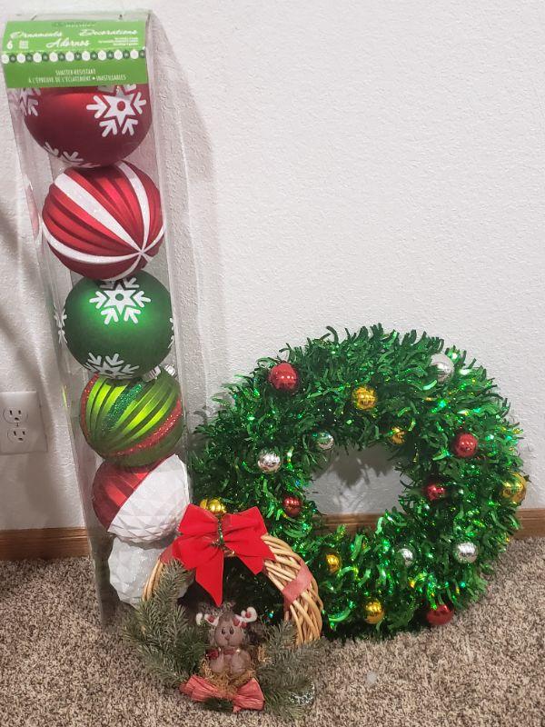 Lot 248: Large Christmas Ornaments & 2 Wreaths