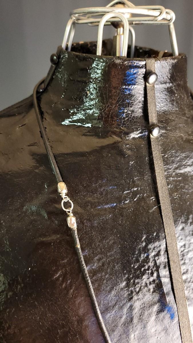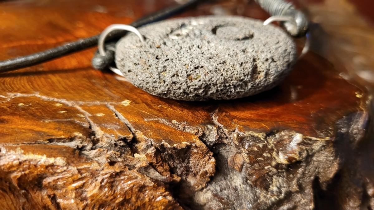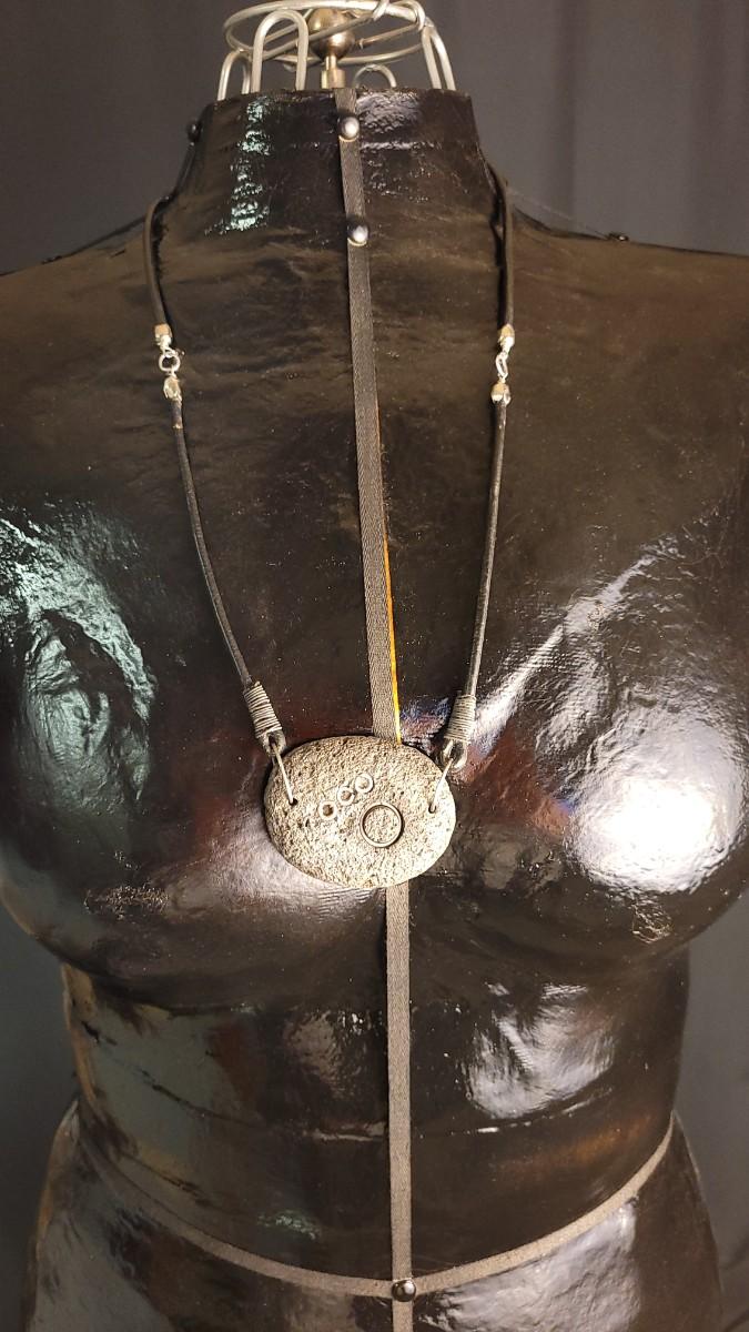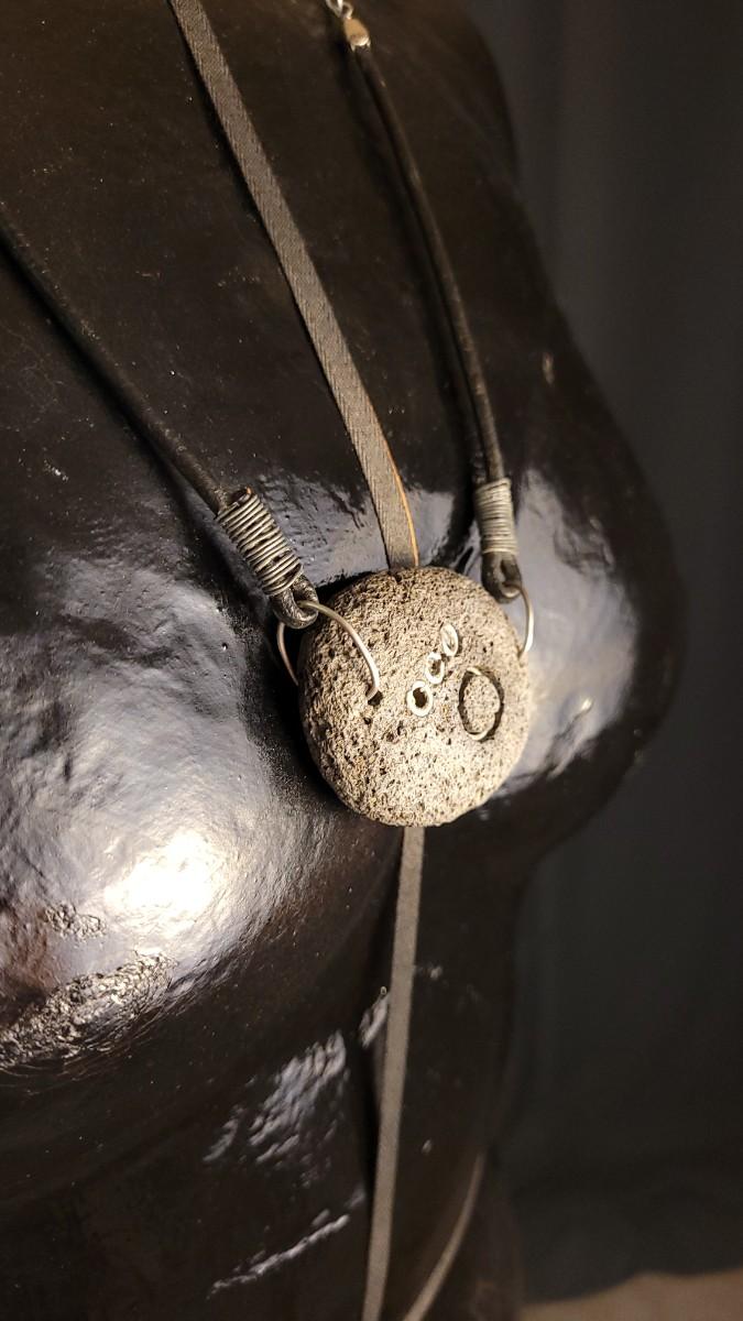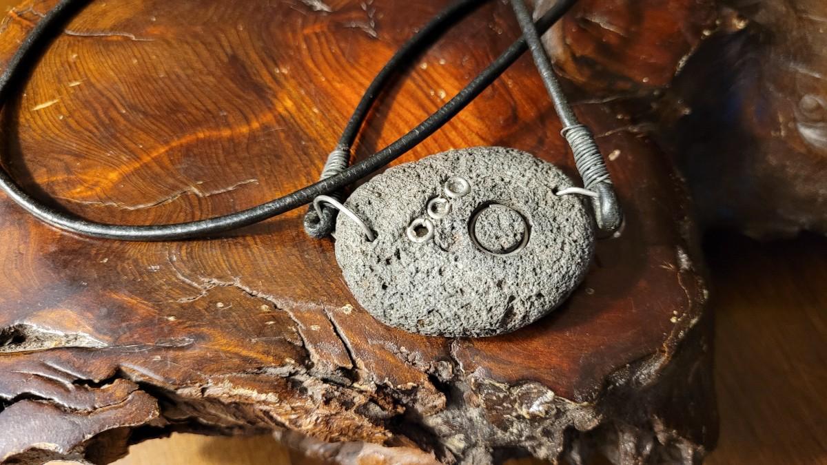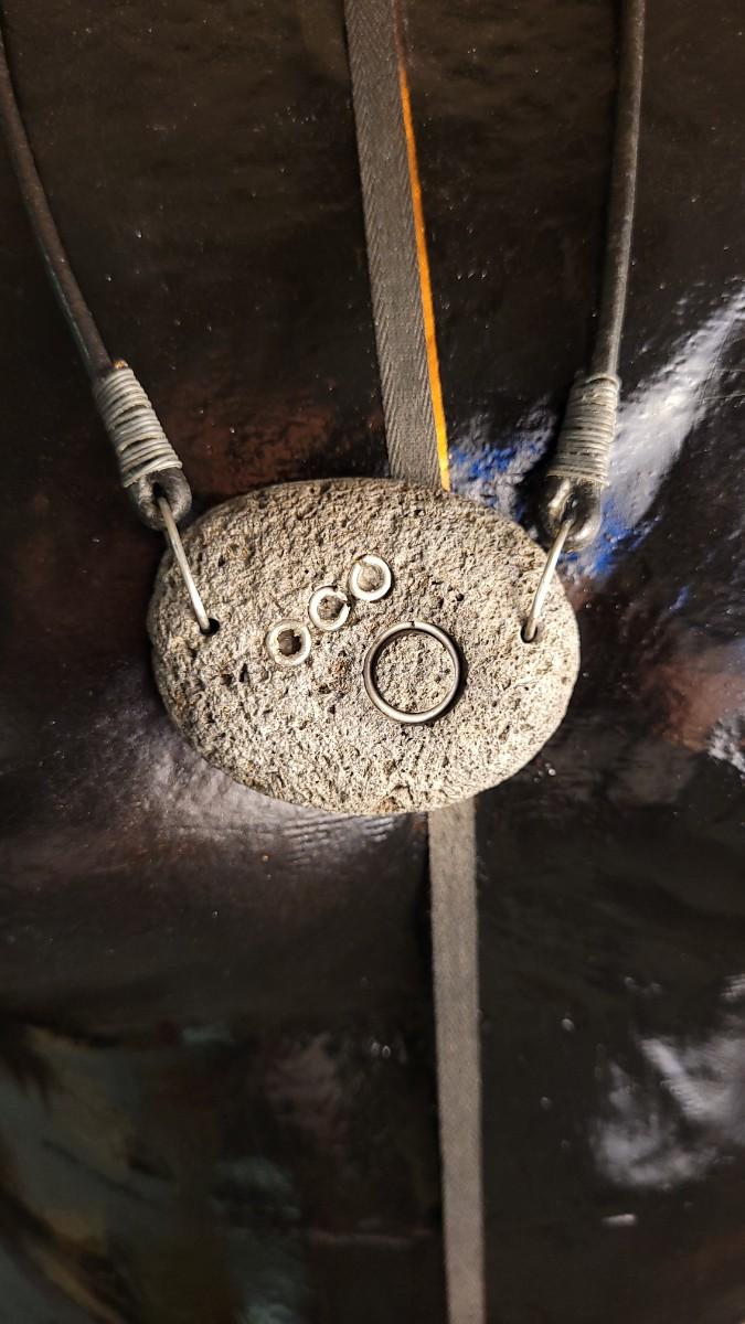 This lot features a Vintage Artist stone Pendant necklace. About an 11.5" Drop is visible. Pendant is about 2" Wide. There are metal circles inside the stone.