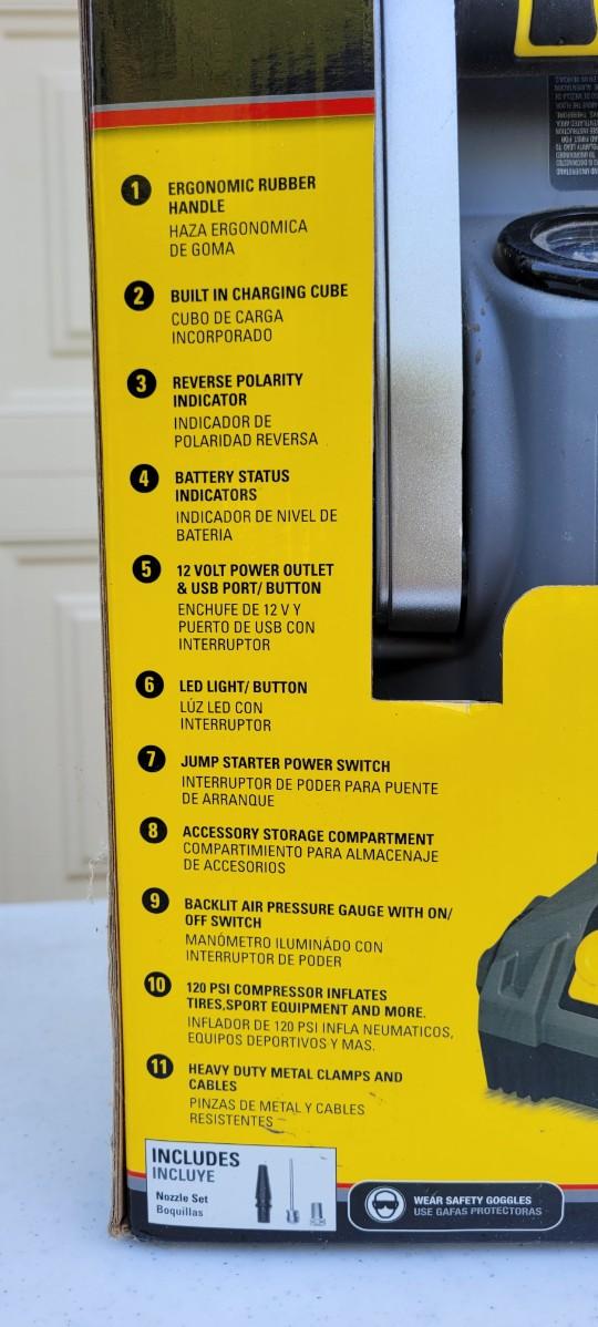 New in Box and Never Used. We did notice a bit of dry rotting of the air hose line but that doesn't affect the ability of the unit to Jumpstart a vehicle.