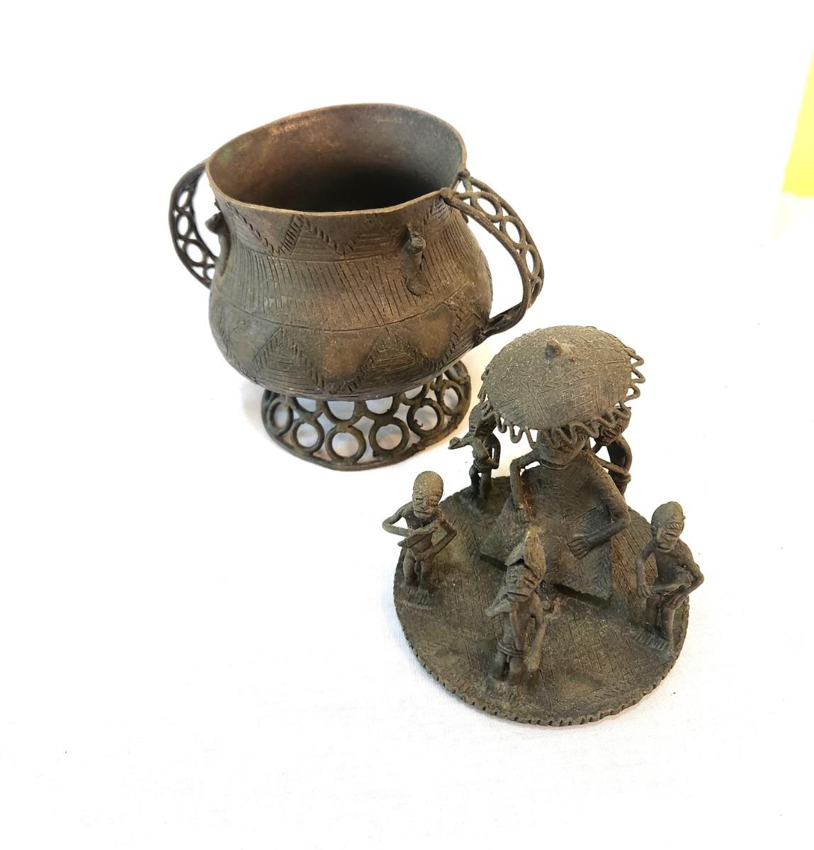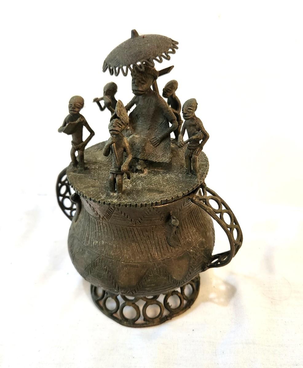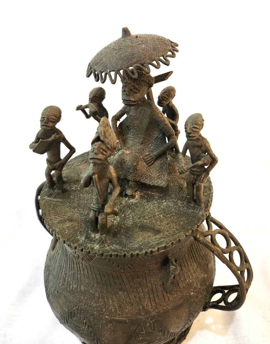 An Ashanti Tribe box for storing Gold, obtained in the Korhogo region of Ghana - covered box with figures, made of brass, 8.5" tall - valued at $350.00 in the 70's.