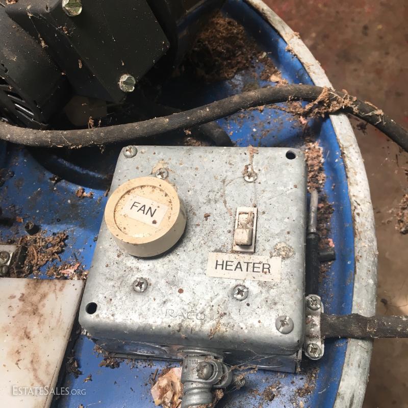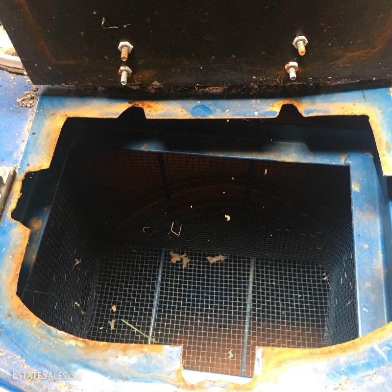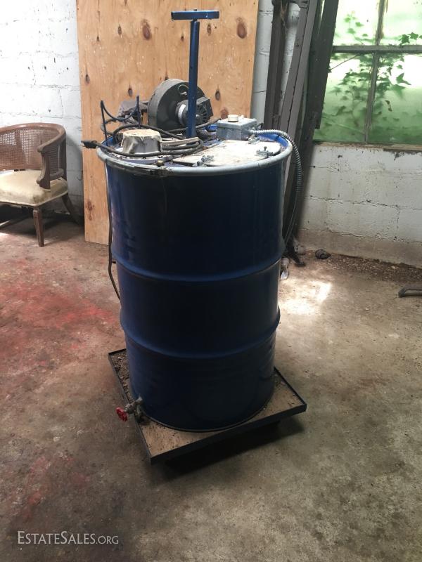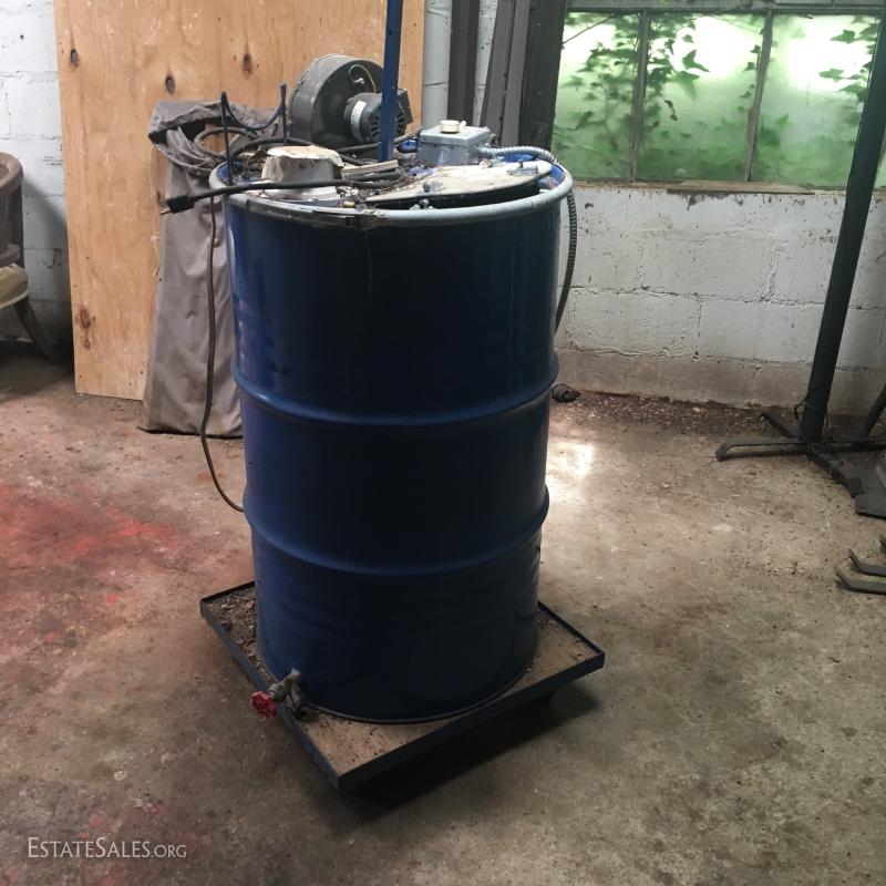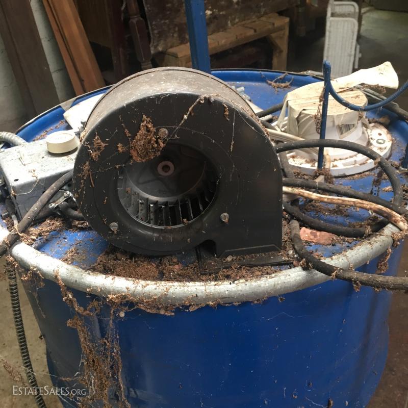 Large blue drum on wheels measures 37"tall. Likely 55 gallons or more. Motor and fan attached to top. Can not verify anything about this Lot. Please attend preview to inspect.