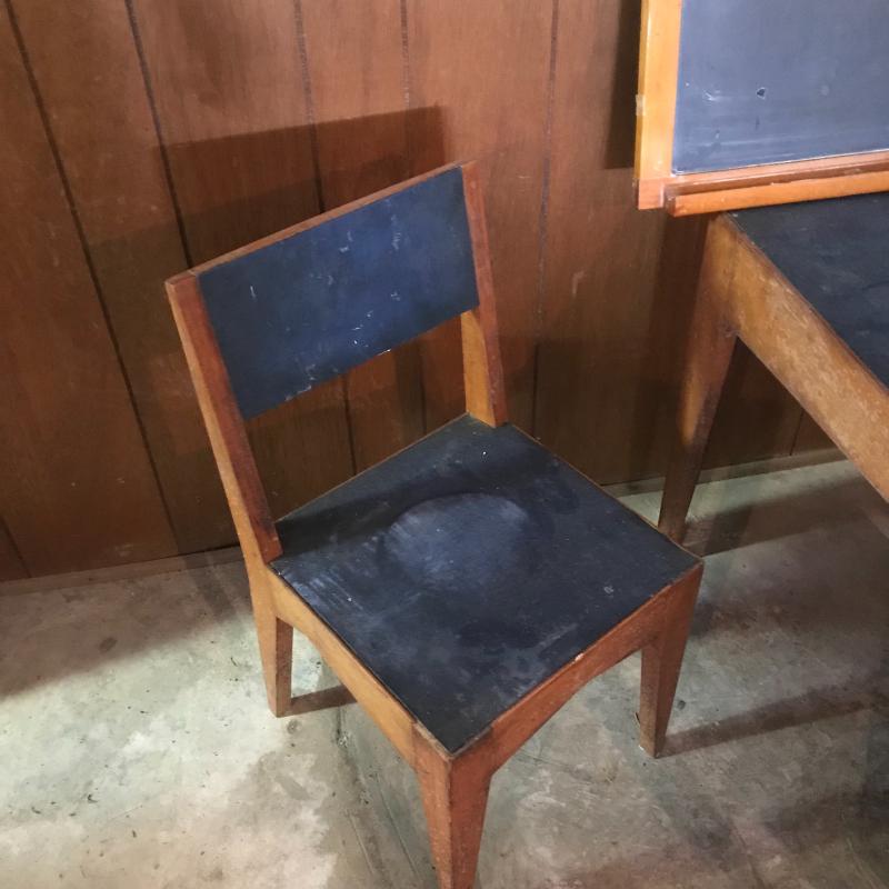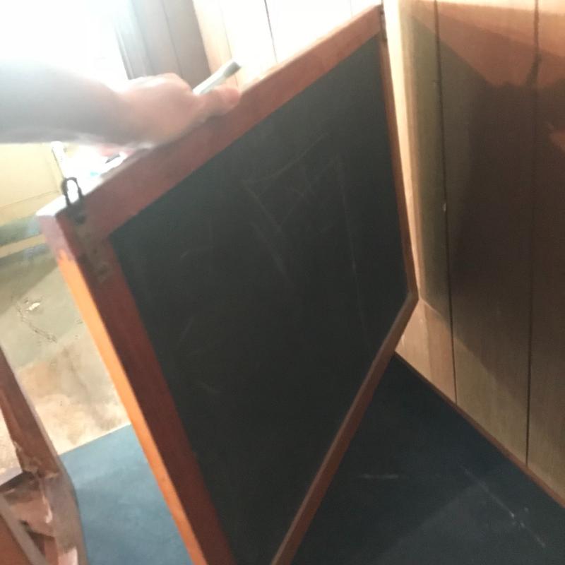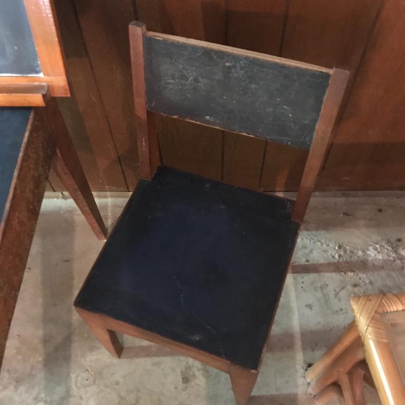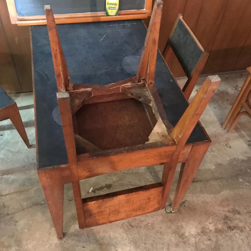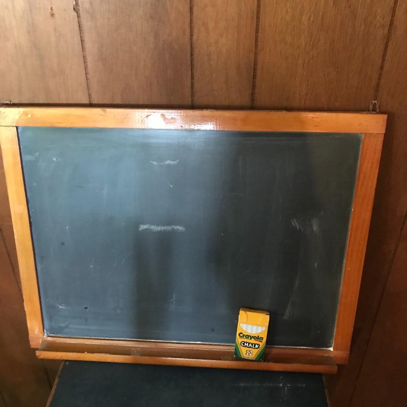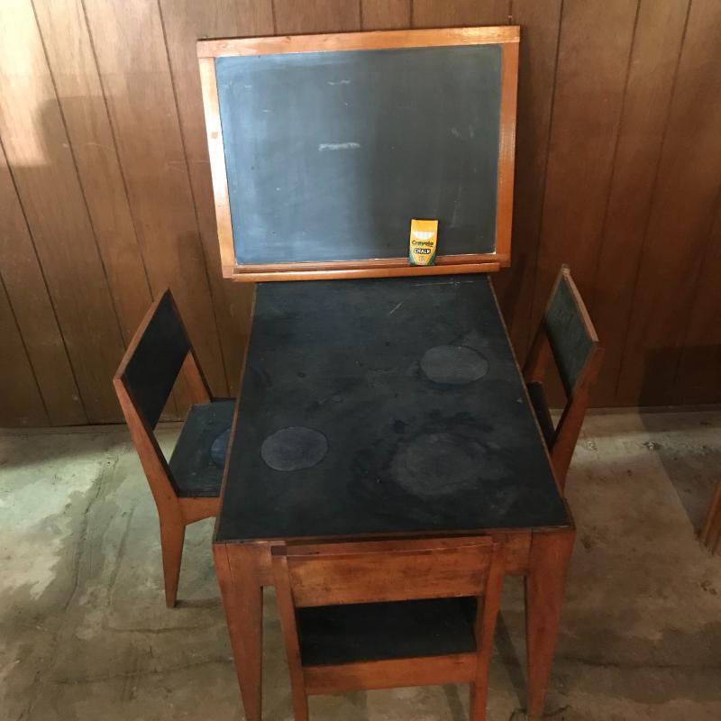 Vintage all wood table, three chairs and chalkboard to hang on wall. Table measures 31.5” x21” x21”. Chairs and table have a black chalkboard like surface and all need cleaning as were stored in basement. Chalkboard is real slate and wood framed with chalk tray. Piece measures 26” x20”. Local pick up only.