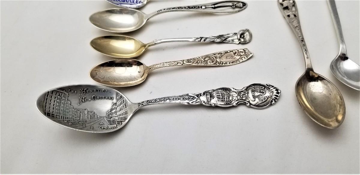 You get all you see here - nice group of vintage souvenir sterling silver spoons - one nice large NEW ORLEANS spoon, with depictions of Canal Street, the Lee Monument, the Cotton Exchange and the Cathedral. Minimum bid is about 10% about the scrap value.