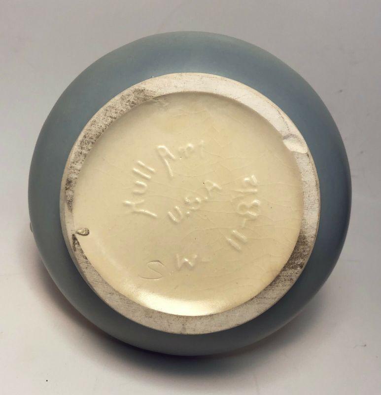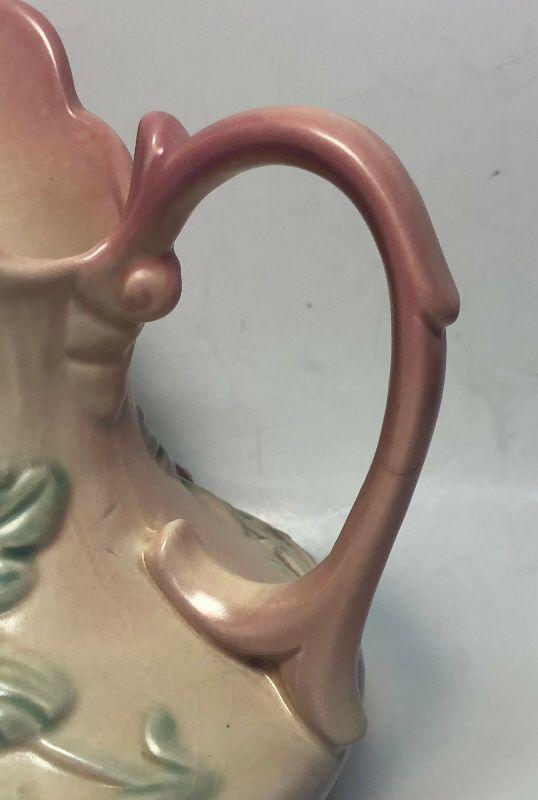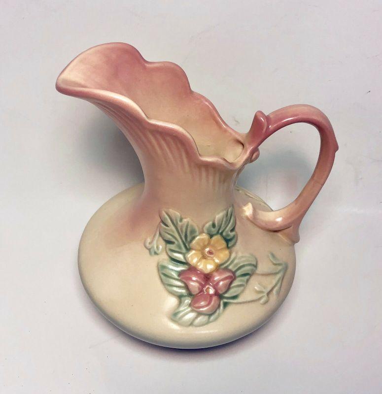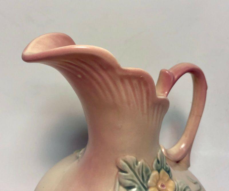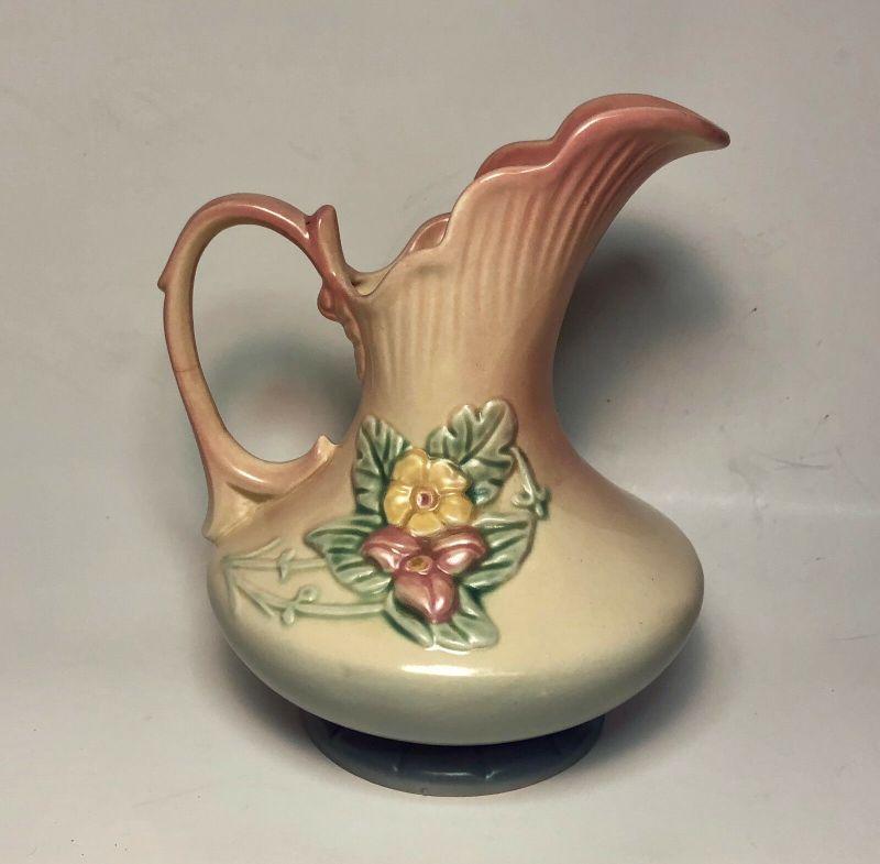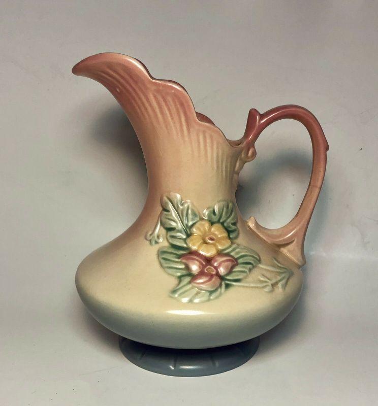 Here is a 9" tall ewer from the Hull Pottery. The postwar production of this beautiful art pottery pattern...Wildflower...Mold # W 11-8 1/2"...Circa 1946-49...No chips but I did find a hairline in the middle of the stylized handle...Doesn't really effect display but there...otherwise great shape on this piece from Ohio...Pink and blue pastel...