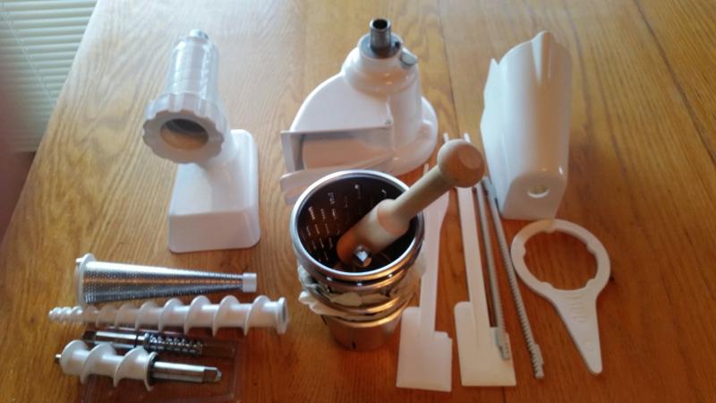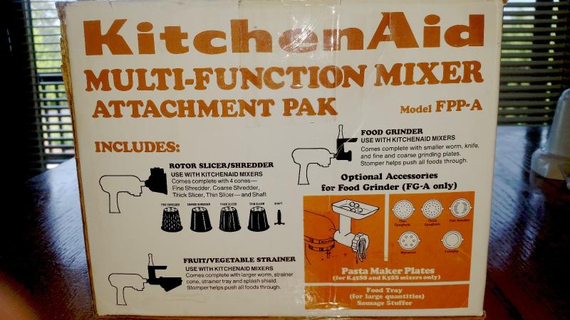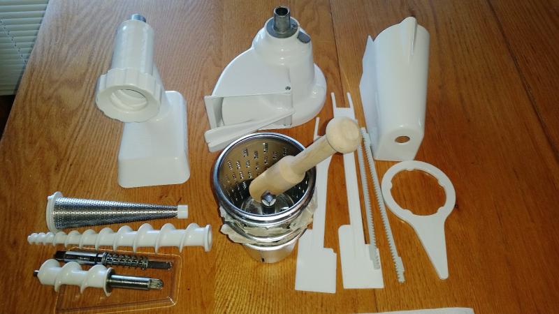 Model FPP-A with pasta maker plates; fruit and vegetable strainer; rotor slicer shredder; food tray; sausage stuffer. Has original instructional manual. In excleent condition with part of the box.