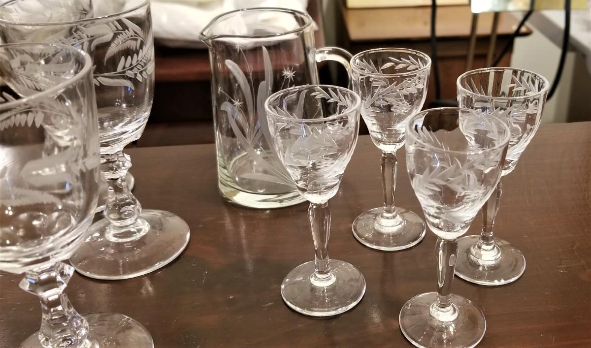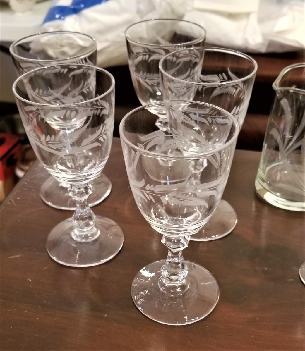 You get all you see here - 5 Claret/Wine glasses, 4 cordial glasses, and a cute little pitcher - all vintage, all acid-etched with a foliate design. All in good condition. The cordials are 3.5" tall, the pitcher is 4" tall, and the clarets are 5" tall.