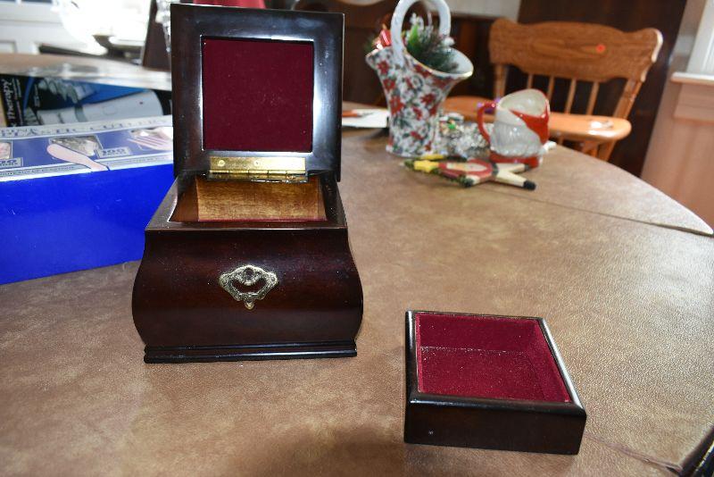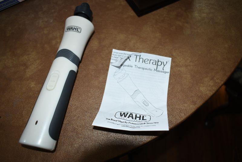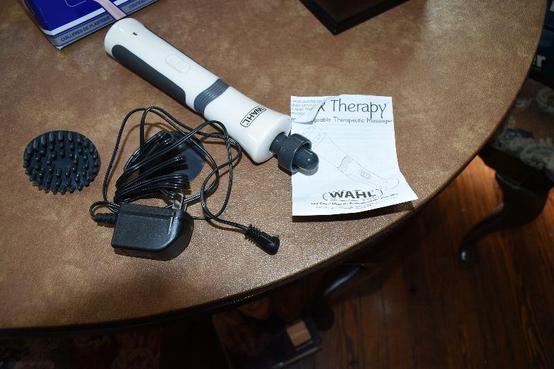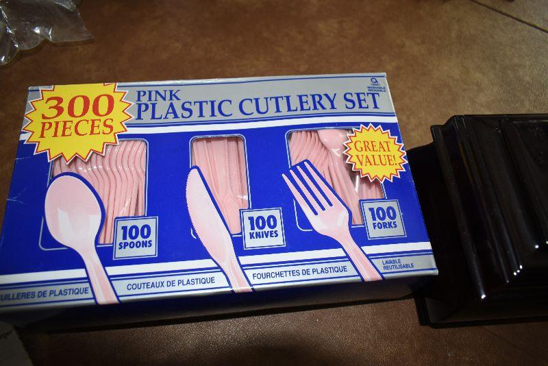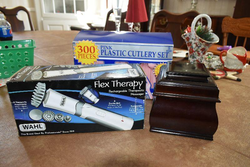Pink plastic cutlery set, small jewelry box, and a Flex Therapy massager, untested