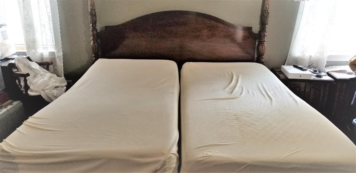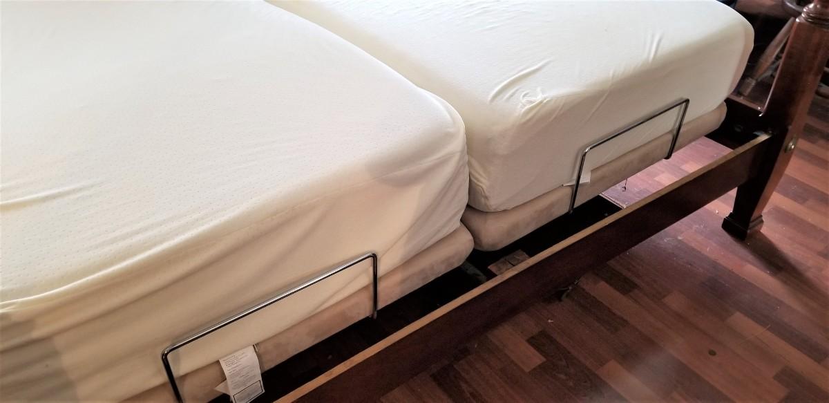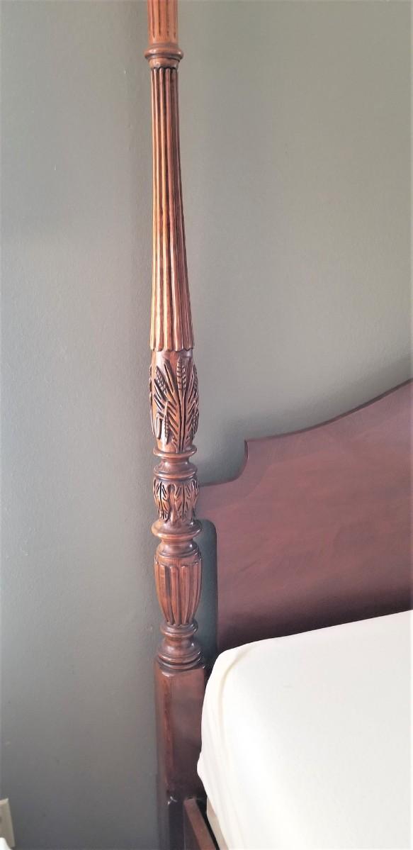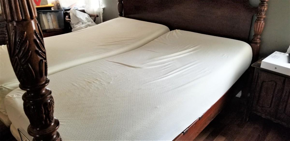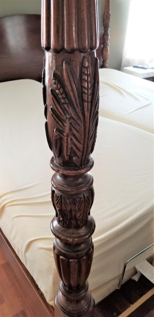 Classic Rice Style 4 poster bed - mahogany finish - with split King Memory Foam mattress. (Sleep Science brand). Bed measures 85" tall (posts), 81" across, and 89" long). Used condition. Note: No remotes. Bed will have to be taken apart and brought downstairs - so you will need help to do that. Good for a guest room, etc.