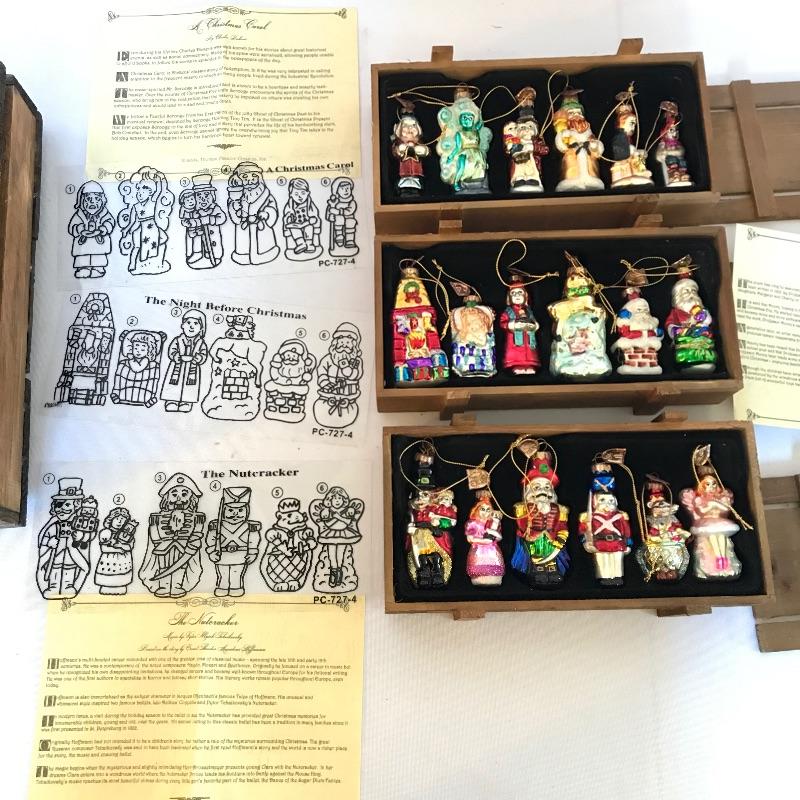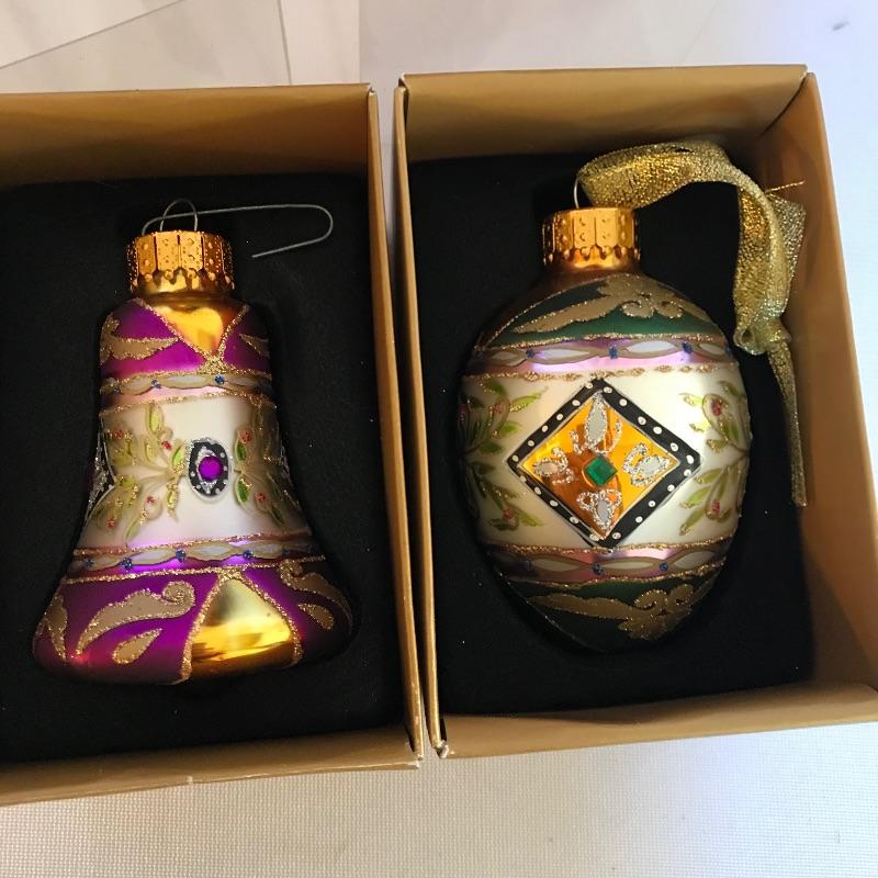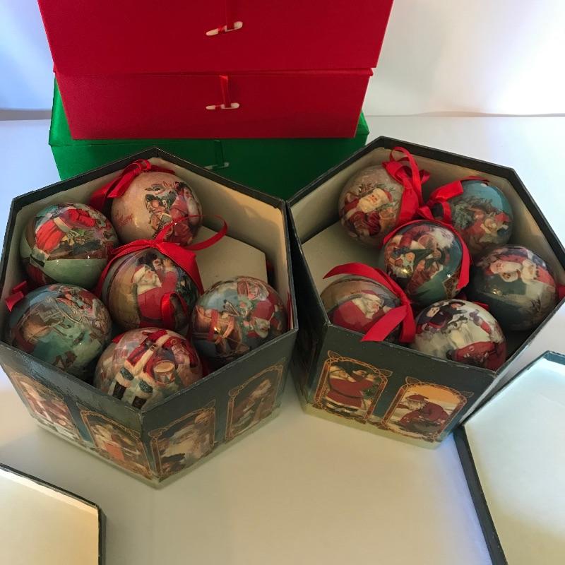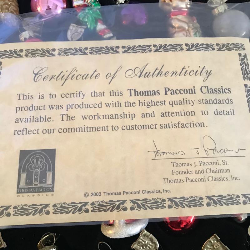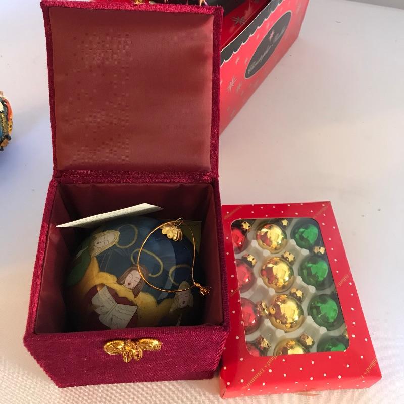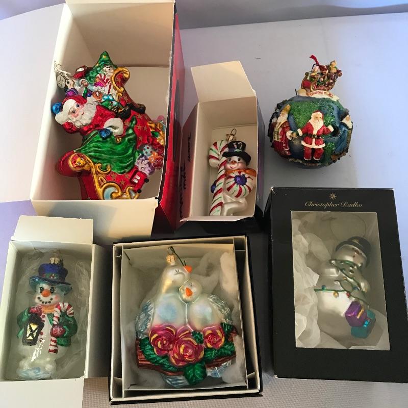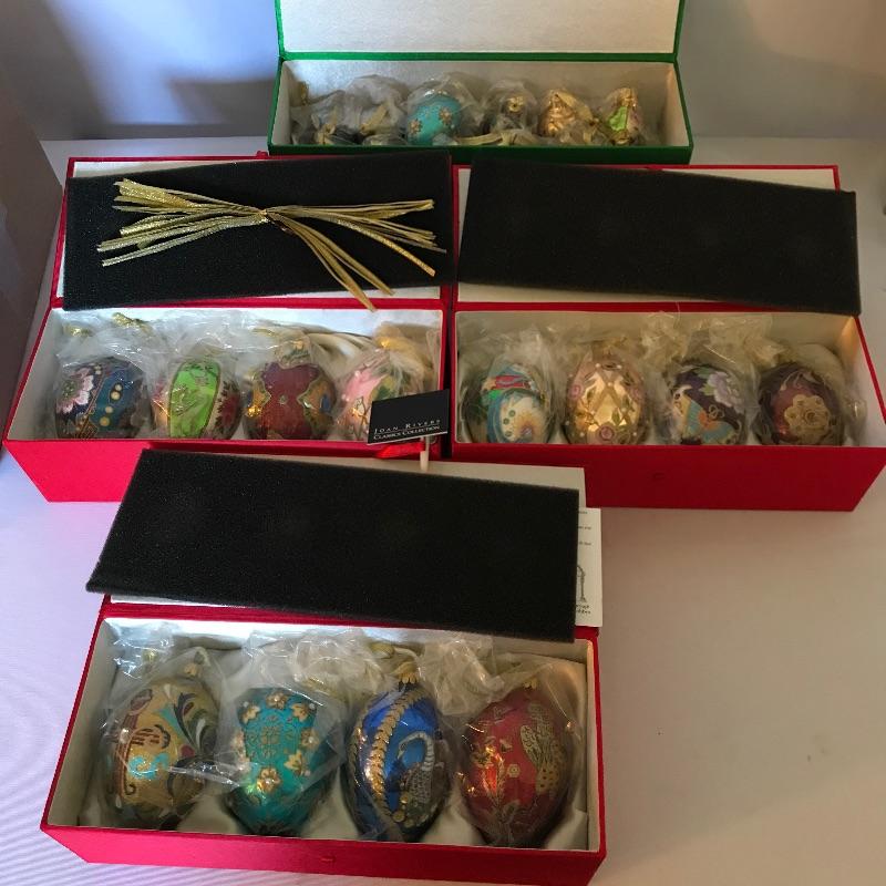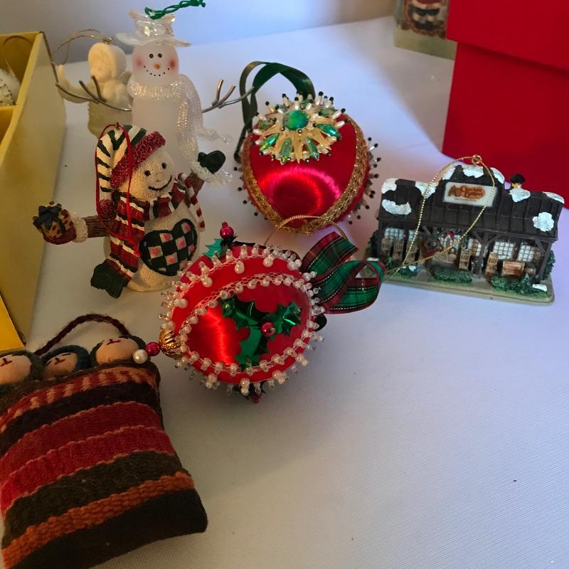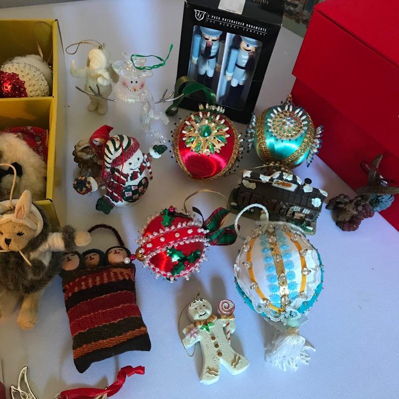 Large collection of ornaments to make this season perfect! High end ornaments and heirlooms adorn the lot. Ornament brands include Fenton, Lenox, Cracker Barrel, The Boyds Co and more. Lot contains two boxes of twelve Santa ornaments each by C & F Enterprises. Three red and one green satiny boxes filled with twelve large and twelve small Joan Rivers egg ornaments. A Fenton hand-painted ornament. One large and three small boxes from Thomas Pacconi Classics with two certificates of authenticity. A small collection of Christopher Radko including a fantastic “Christmas to All” ornament globe. Lot also includes two tantalizing blown glass ornaments. See photos and happy bidding. No shipping.