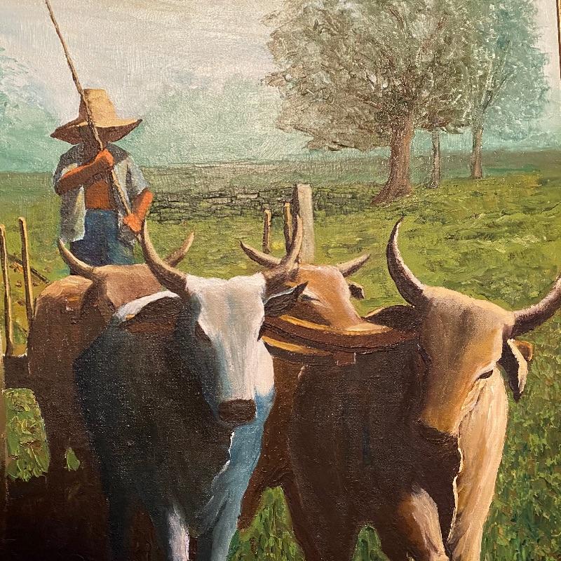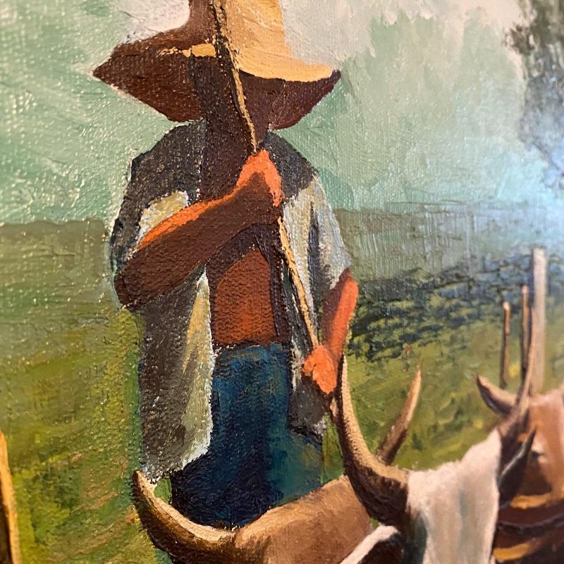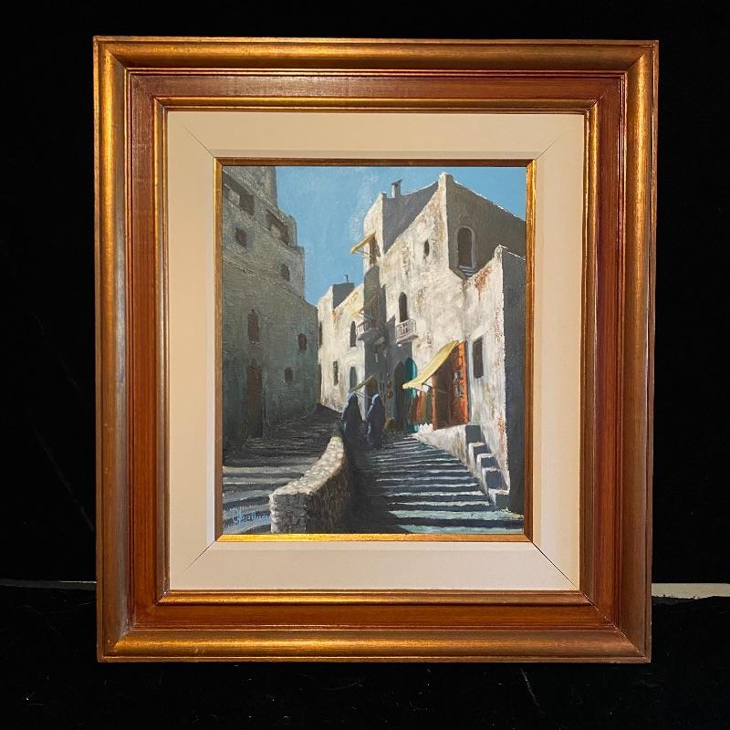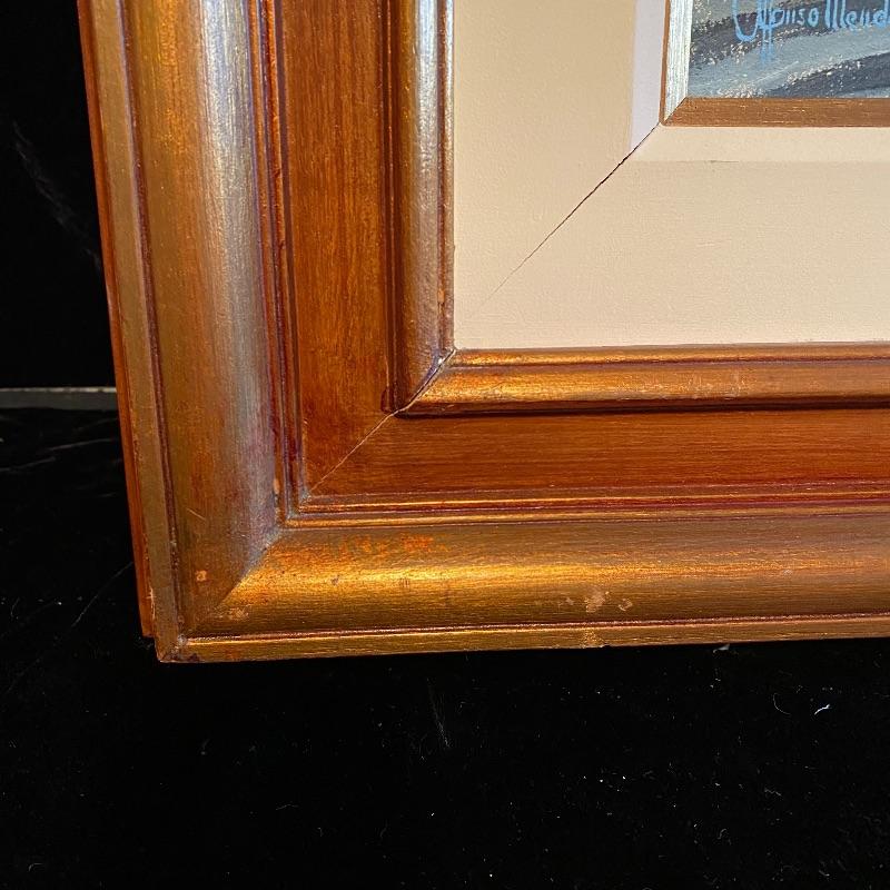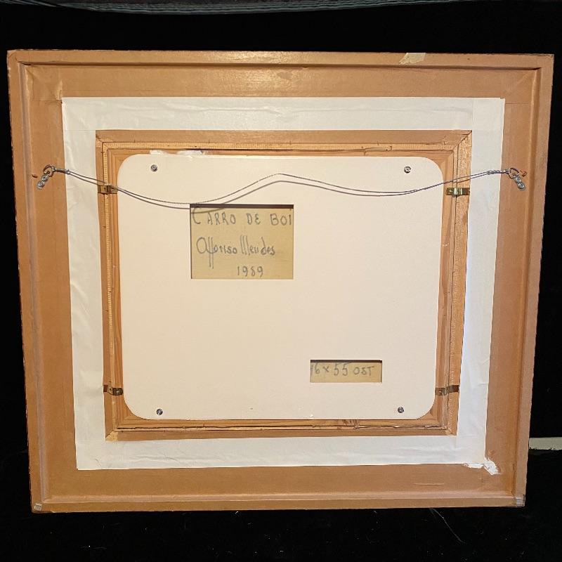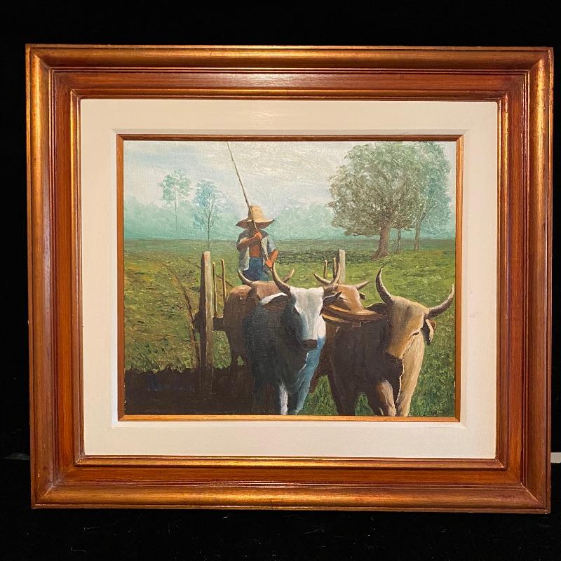 Brazilian artist Alfonso Mendes made these spectacular life like paintings on canvas of village life. One is a farm scene and the other is a downtown scene. Both are signed by the artist and nicely framed and matted with matching frames. No glass. See photos of back for titles and info written on canvas. The farm scene measures 32.5” x 29.5”. The town scene measures 30” x 27.5” Frames have small scratches that are barely noticeable and have some bronze painted highlights. Shipping Available. Shipping art can be costly please call UPS store at (828-252-6930) for quote.