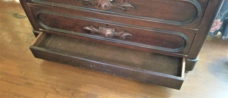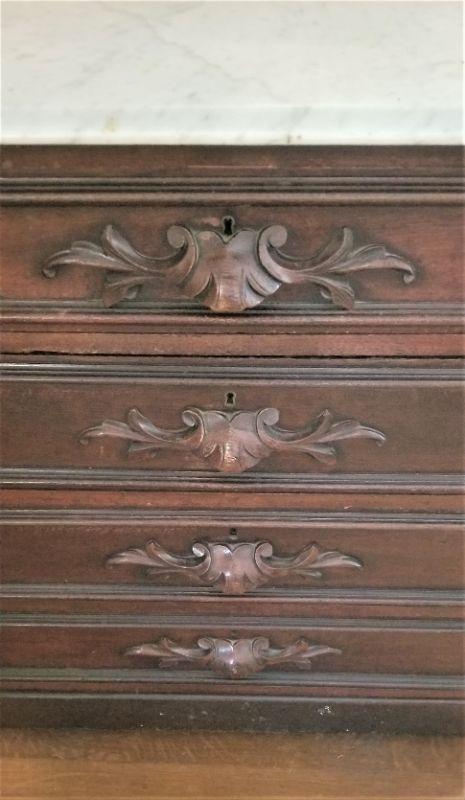 I love these old Victorian dressers - this one is circa 1870 or so - has four roomy drawers, plus a secret drawer at the bottom. Marble top is beveled and in good condition. Nice carving on the pulls. Measures 41" wide, 19" deep and 36.5" tall. Good antique condition.