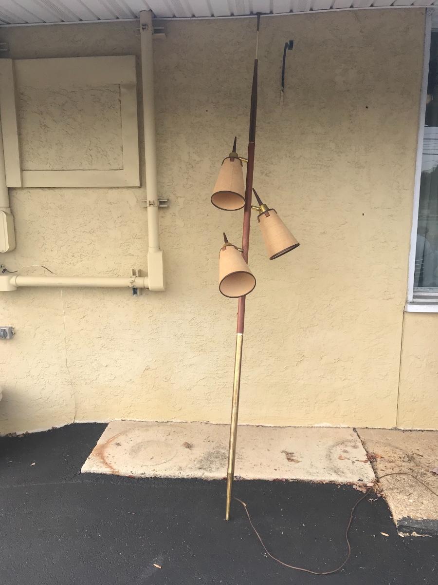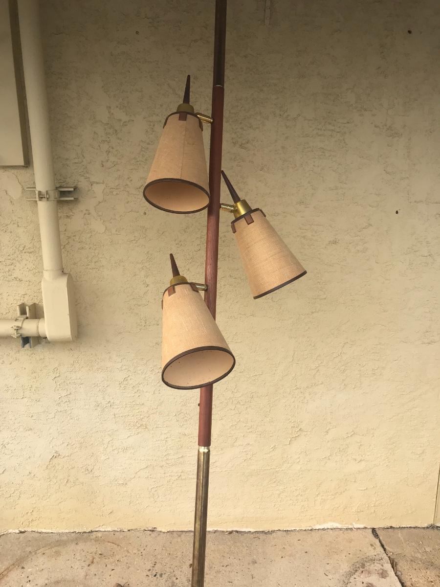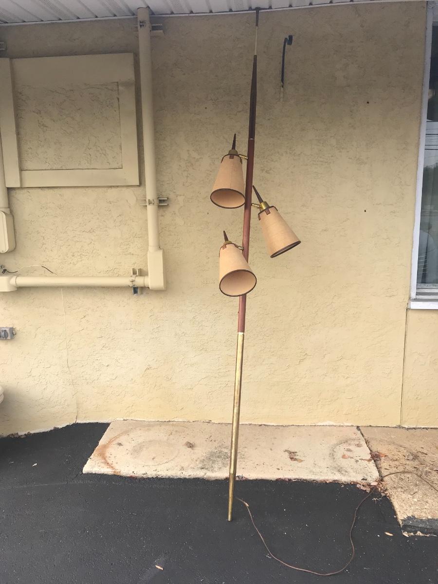 Vintage Mid-Century Modern Tension Pole Lamp. Tested. All three lights work. Fits snuggly with 8-foot ceiling. Bottom foot is broken off. Please see all pictures as they are the best representation of the items. The pictures show condition, measurements if taken, and what is included in the lot. Due to the large amount that we photograph and the time frame, we are not always able to take measurements. All items unless noted, are pre-owned and have been used. Please bring packing materials for your items. If you purchased furniture, you must bring help. We do not allow one person to carry large furniture out on their own. Bring help, tools and a truck for your personal safety. Company policy. Thank you.
