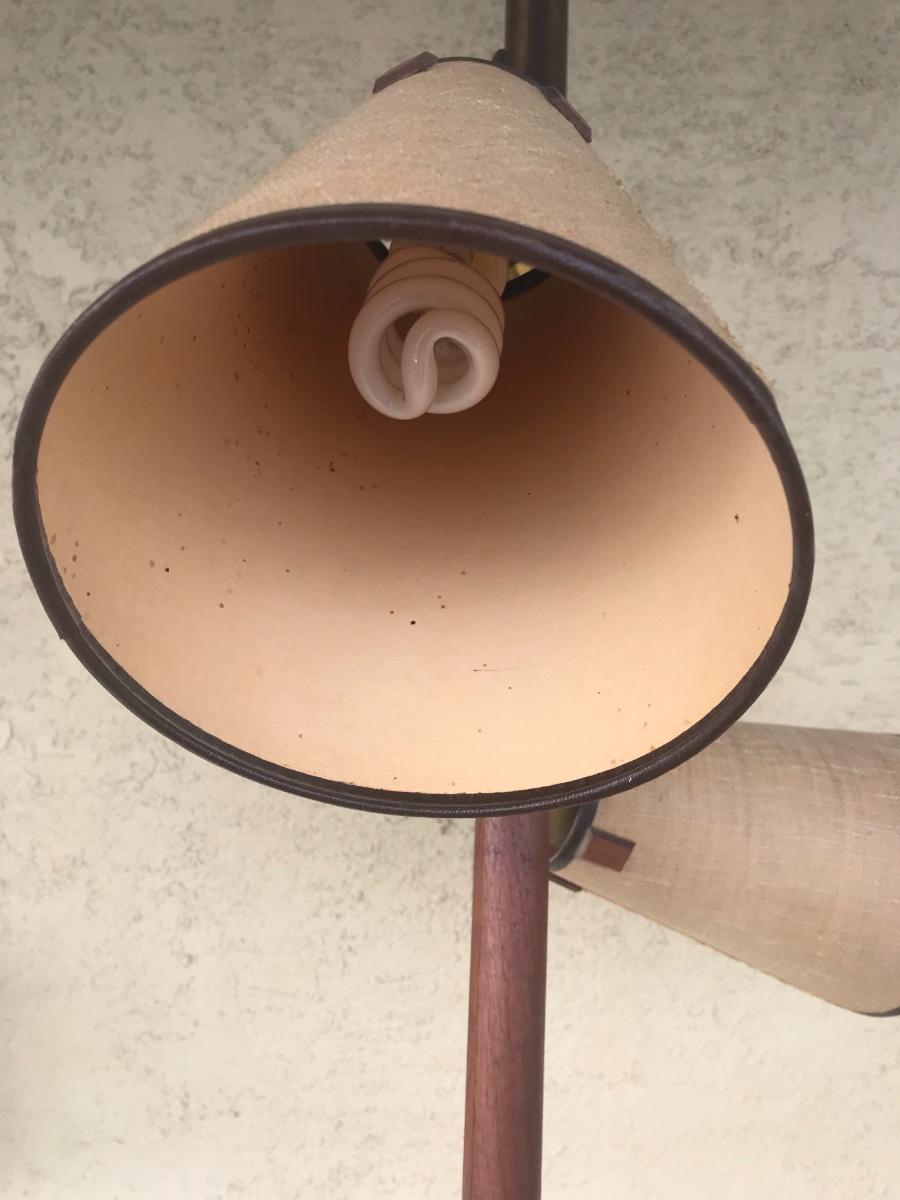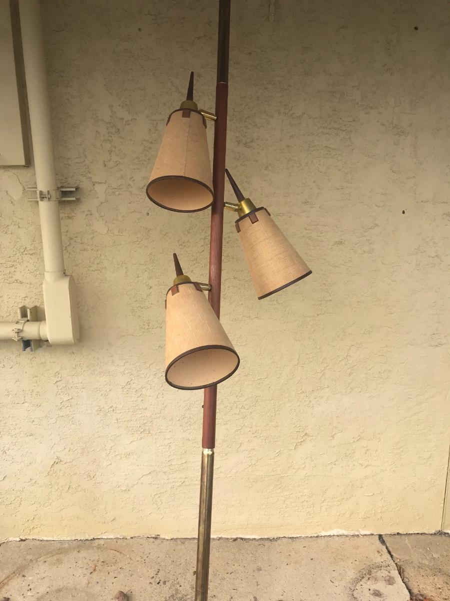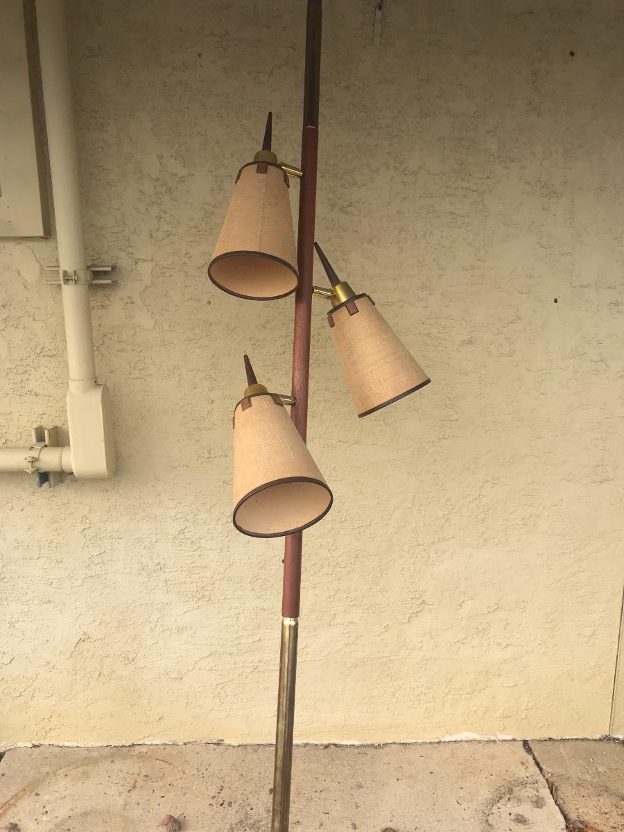 Vintage Mid-Century Modern Tension Pole Lamp. Tested. All three lights work. Fits snuggly with 8-foot ceiling. Bottom foot is broken off. Please see all pictures as they are the best representation of the items. The pictures show condition, measurements if taken, and what is included in the lot. Due to the large amount that we photograph and the time frame, we are not always able to take measurements. All items unless noted, are pre-owned and have been used. Please bring packing materials for your items. If you purchased furniture, you must bring help. We do not allow one person to carry large furniture out on their own. Bring help, tools and a truck for your personal safety. Company policy. Thank you.
