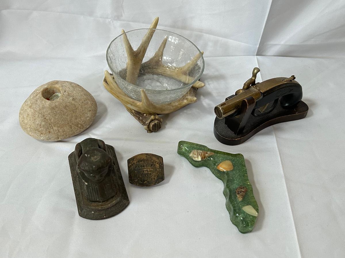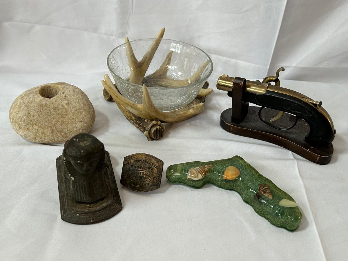 Lot 249: Vintage Unique Finds -Gun Lighter, Antler Bowl, Paperweight And More