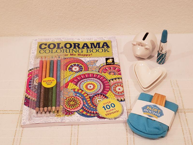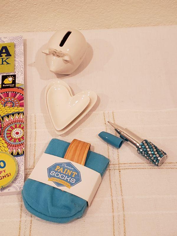 Lot 249: New Coloring book, Pen, Piggy bank, Socks & Dresser Jewelry Dishes