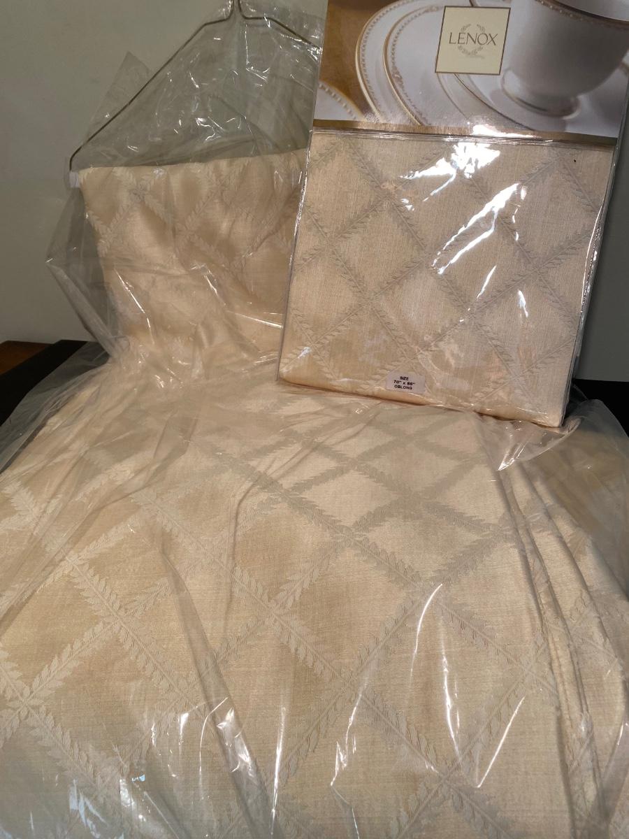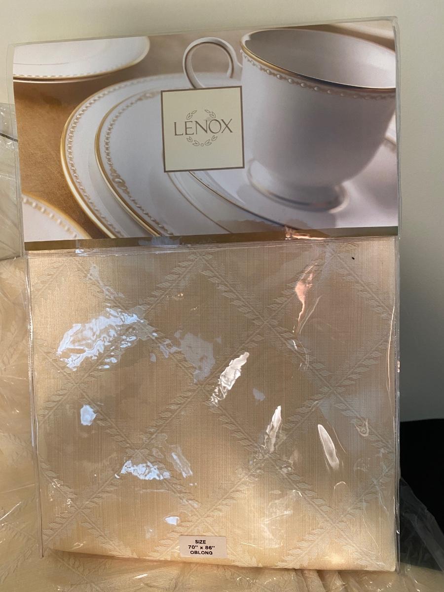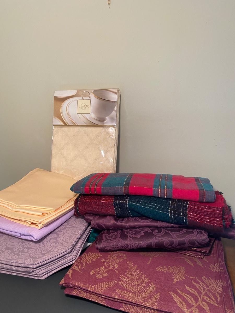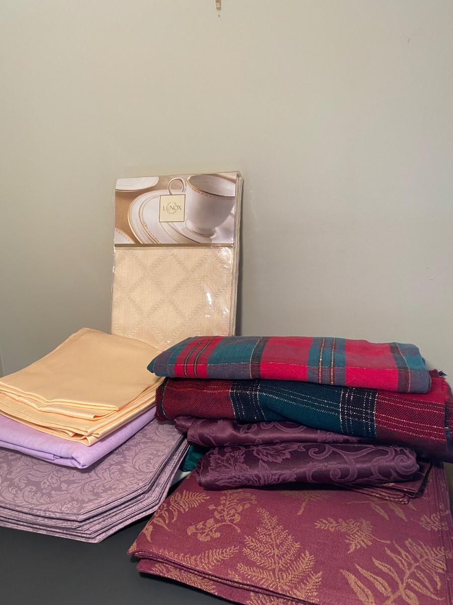 Mixed lot of tablecloths and place mats. Lenox tablecloth new in package.