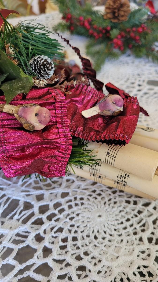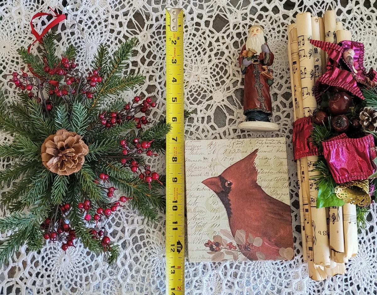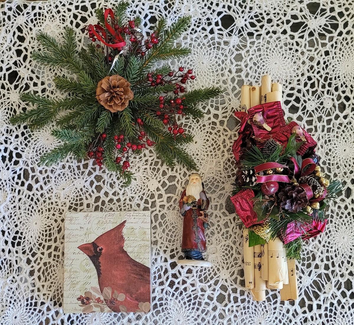 Lot 249: Christmas Decor - Red Bird Art, Hanging Greenery, Santa and Antique Sheet Music Deco