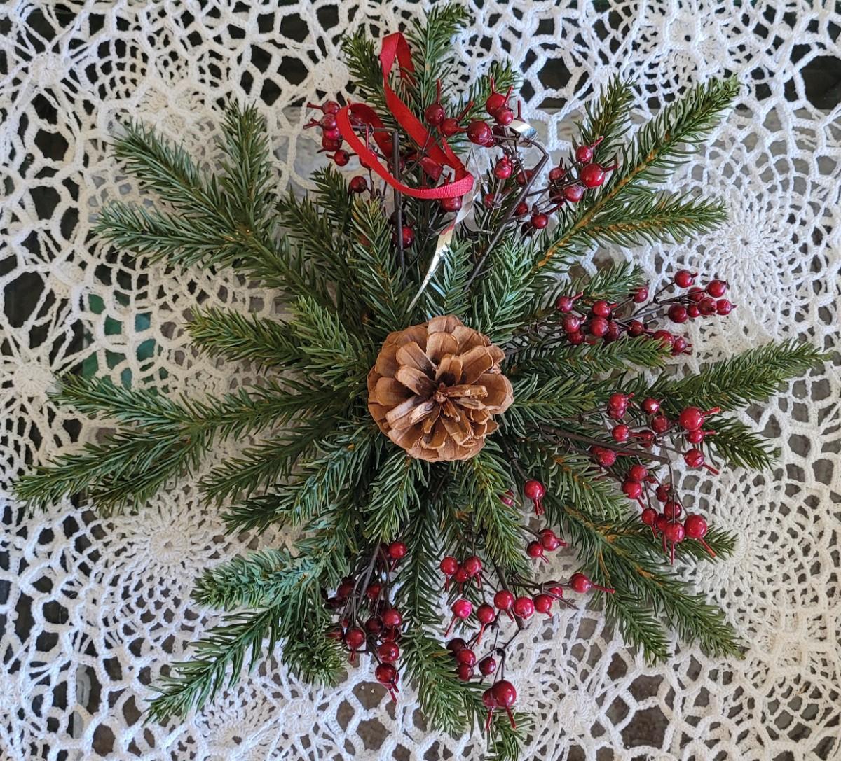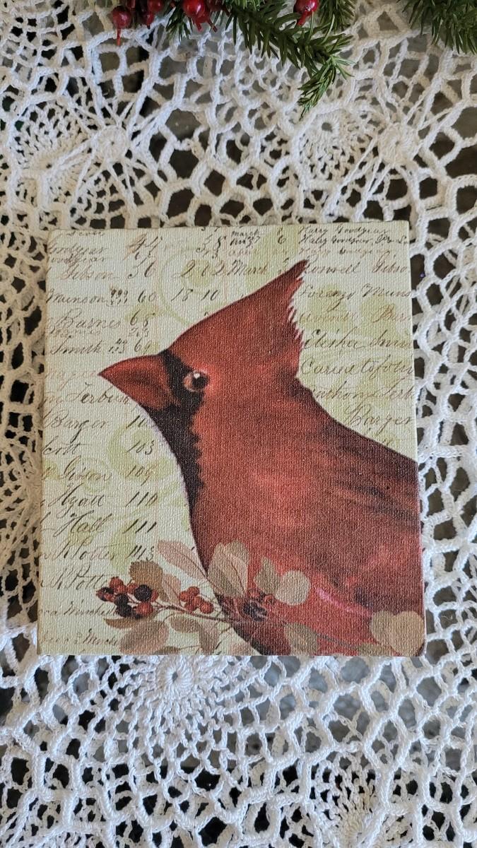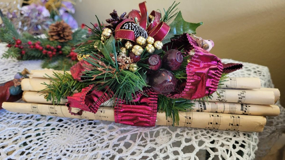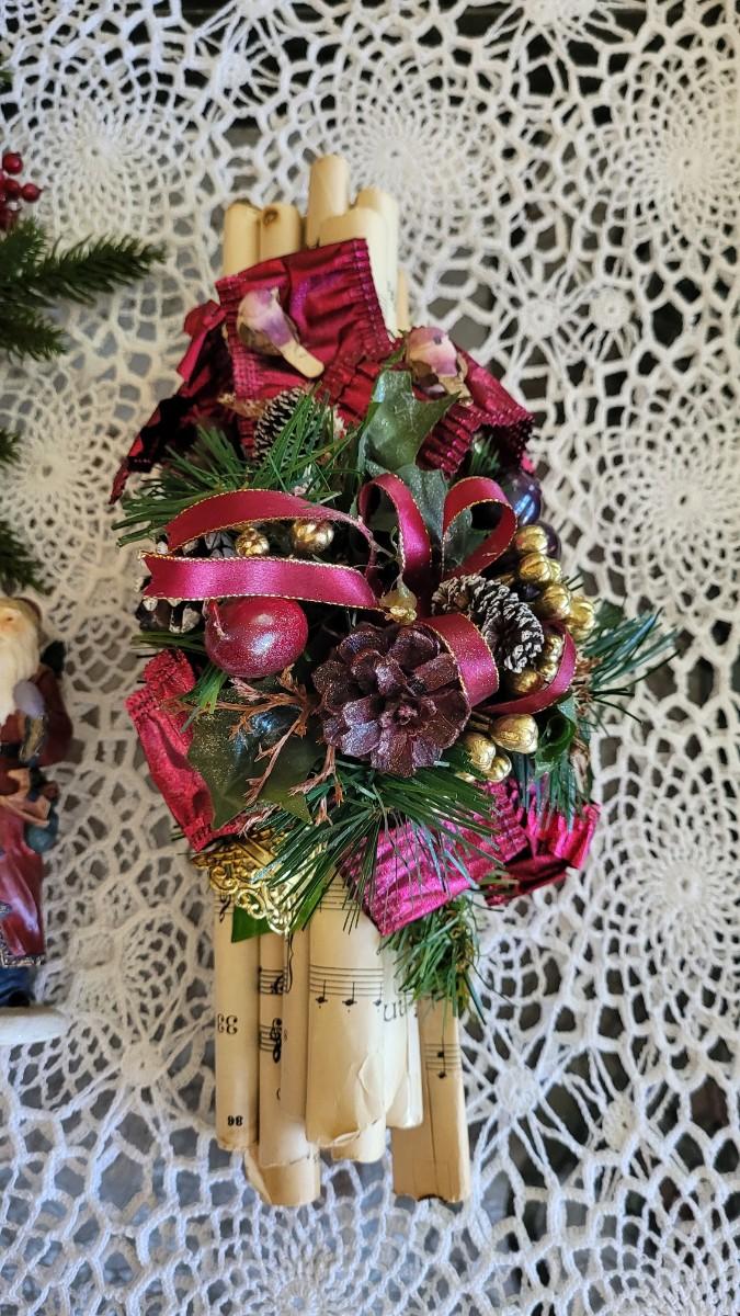 Lot 249: Christmas Decor - Red Bird Art, Hanging Greenery, Santa and Antique Sheet Music Deco