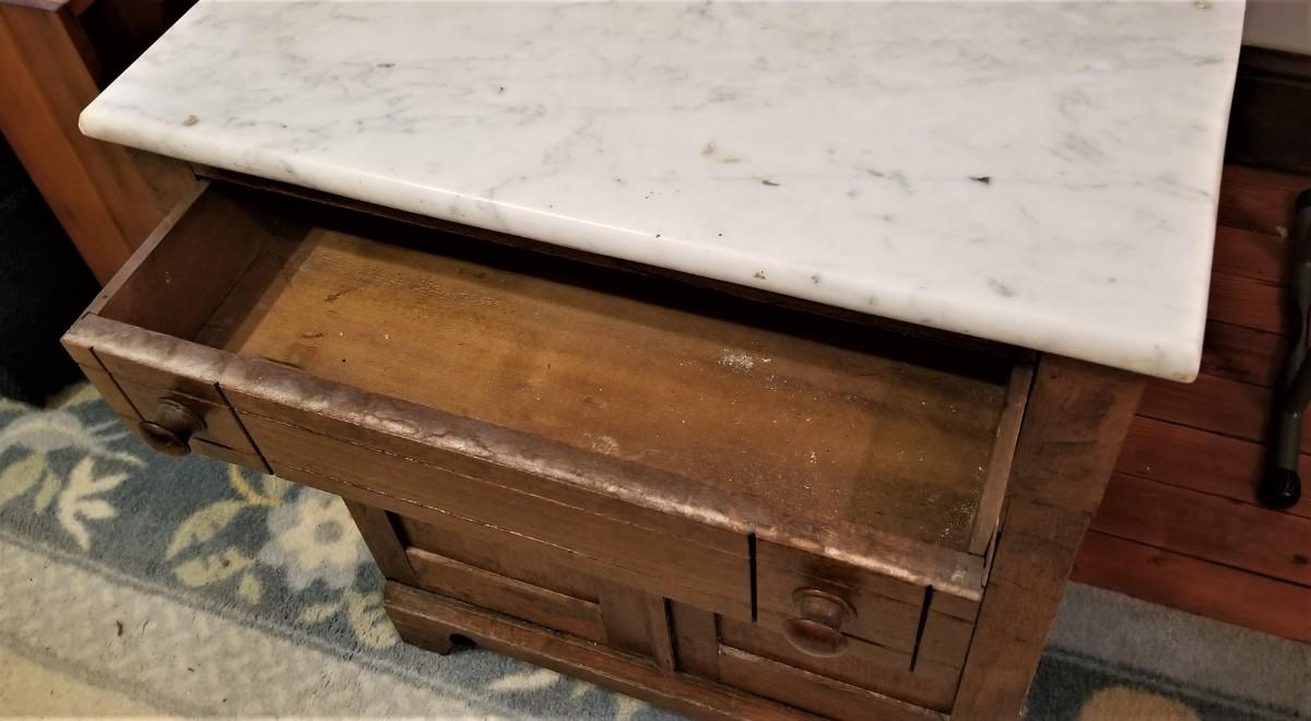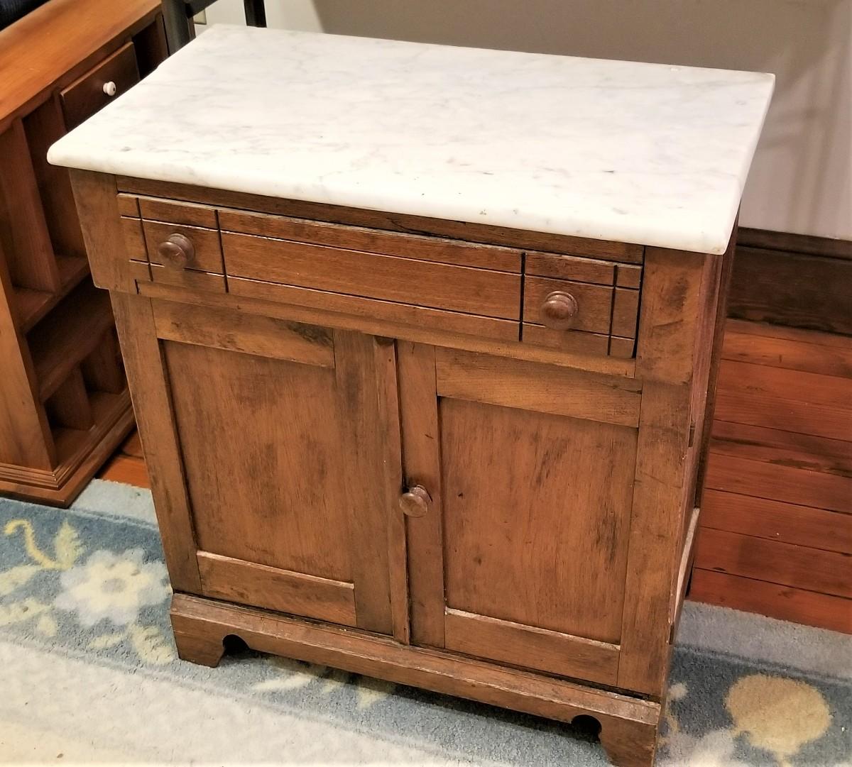 Antique Washstand/commode with marble top (lifts off). On the "primitive" side. Door shuts but no latch. Needs a bit of TLC. Marble top looks pretty good. 25" across, 14" deep, 27.5" tall. Solid.