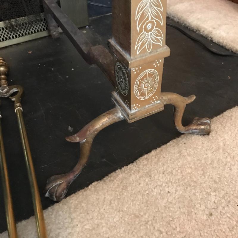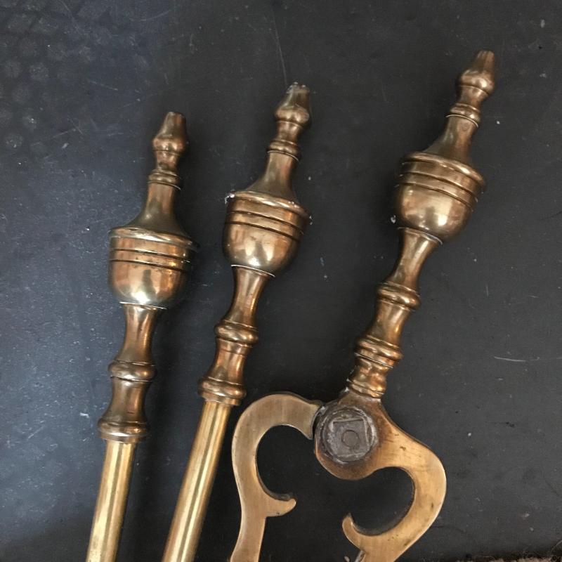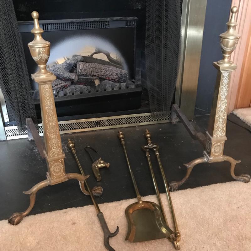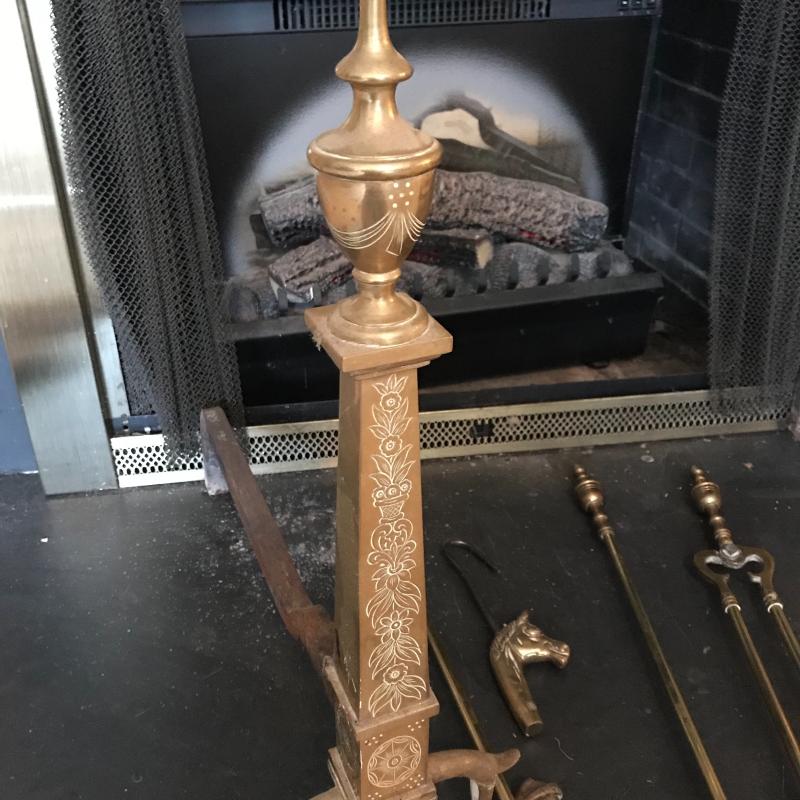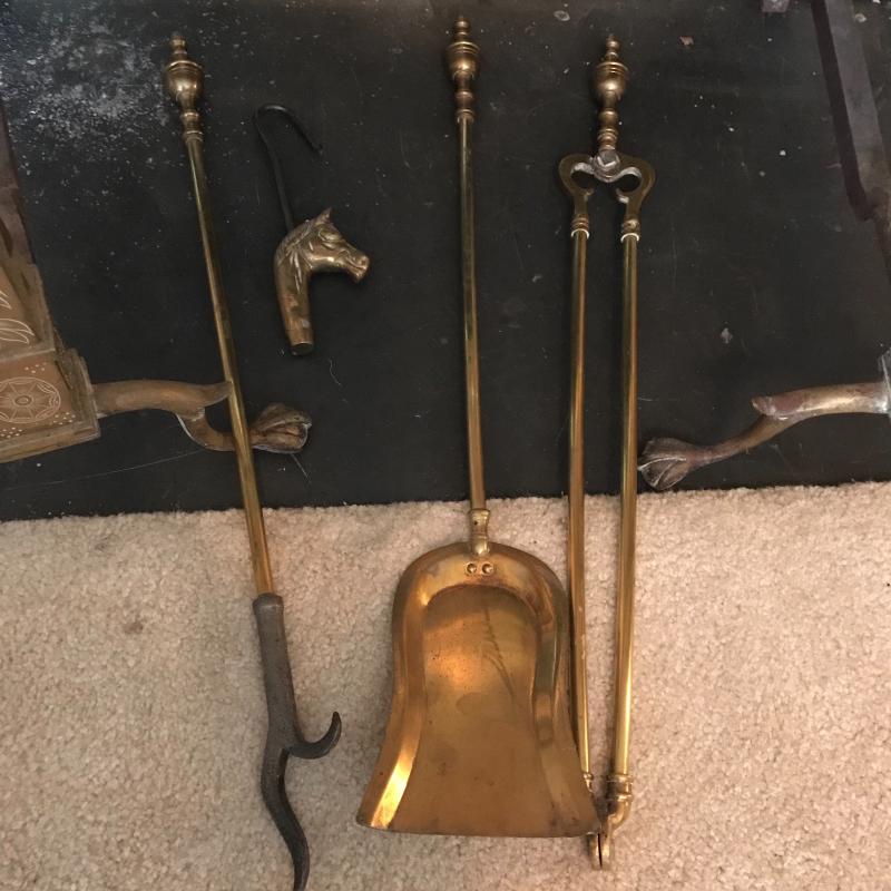 Beautiful brass tools to accent your fireplace. Complete with poker, tongs, shovel, stands and a unique horse bust hook. Stands are approx. 12x20.5x24” with ornate white flowered accents. See photos. No shipping.