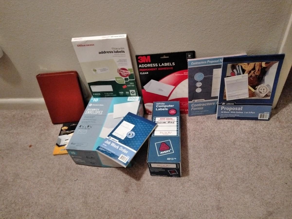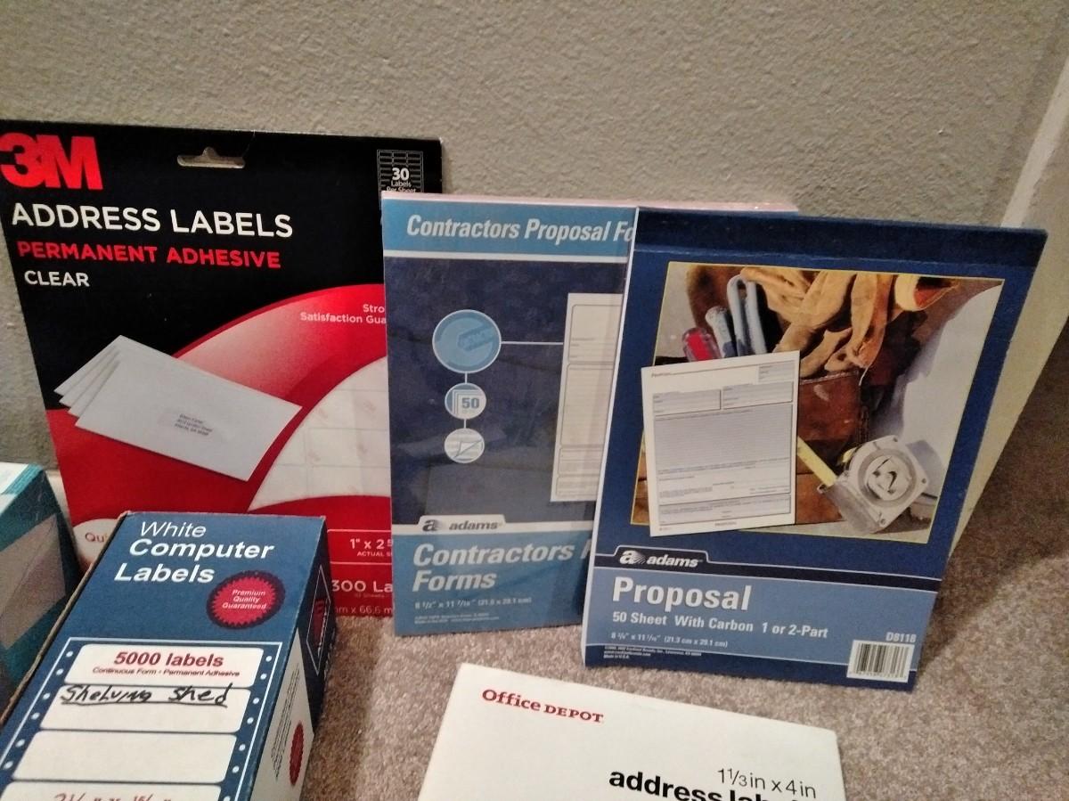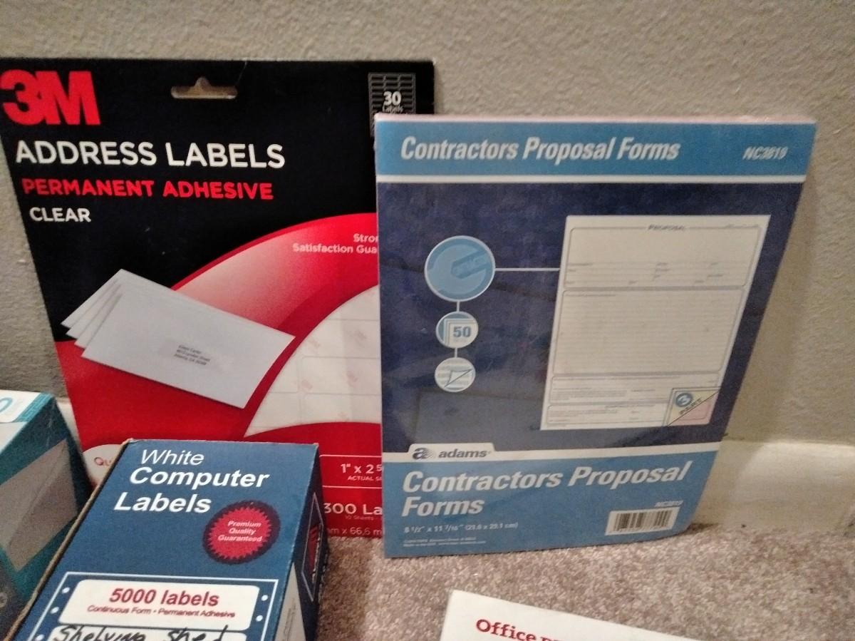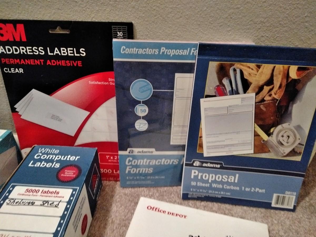 CONTRACTORS PROPOSAL FORMS, ADRESS LABLES, ADDRESS BOOK, JOB WORK ORDER PAPERS, LARGE BOX OF ENVELOPES, AND MORE