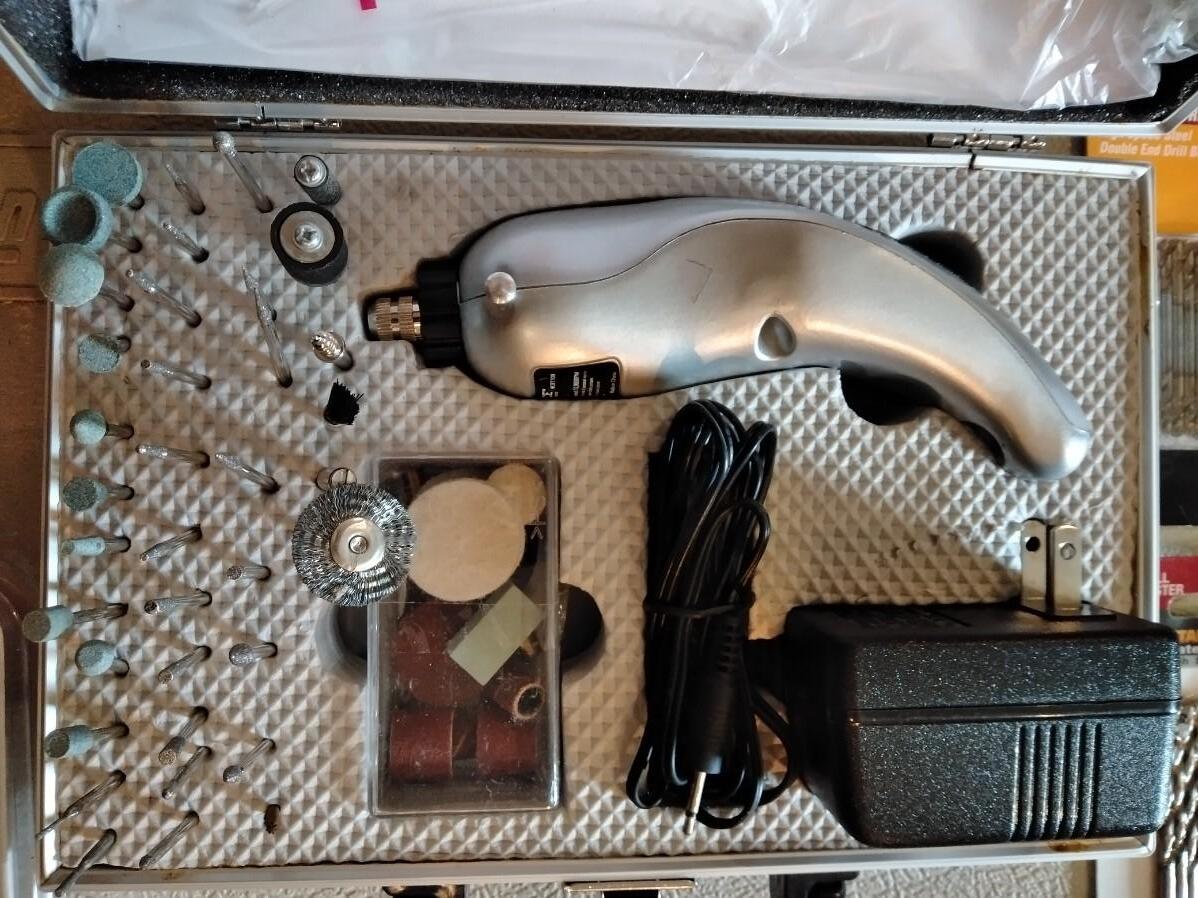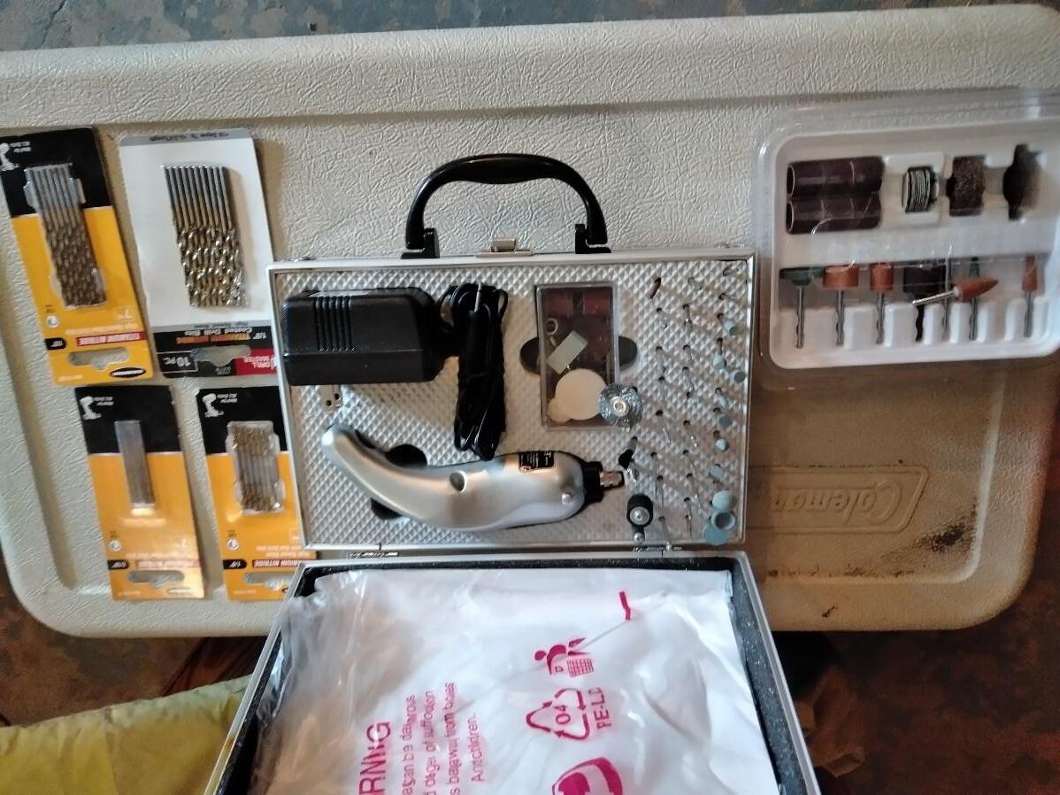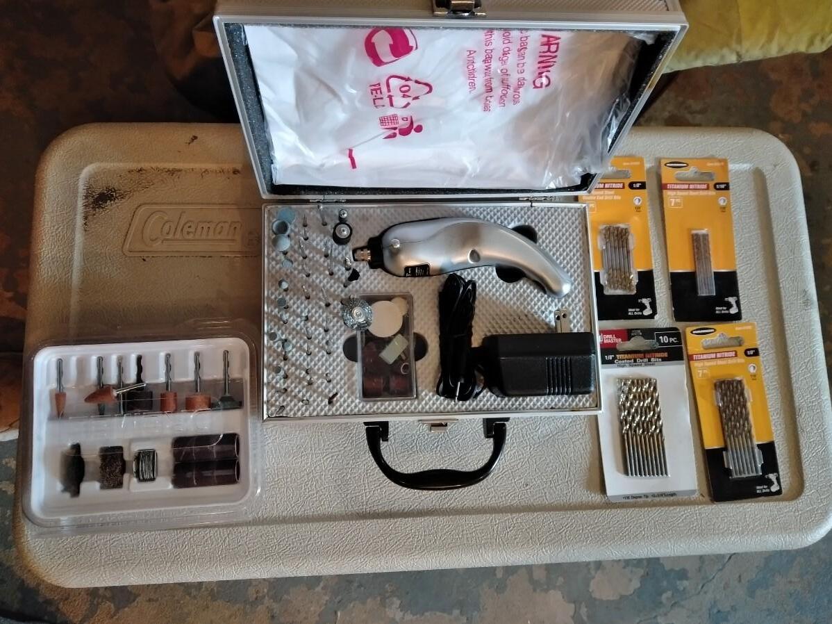 DREMMEL TOOL WITH BITS AND STORAGE BOX.