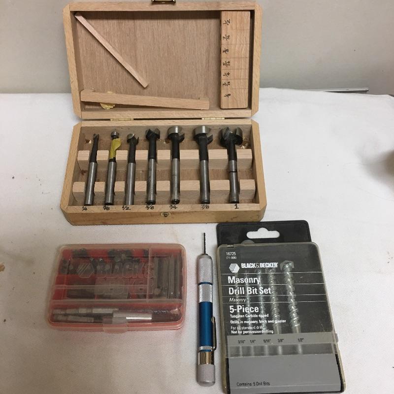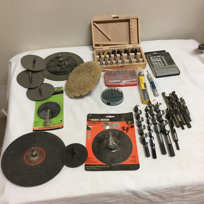 Lot includes Forstner bits, auger bits, cut off discs, cutting blades, screw driver bits and more. For all your drilling and cutting needs.