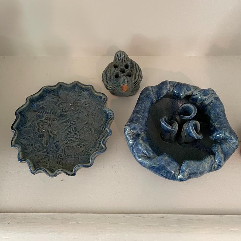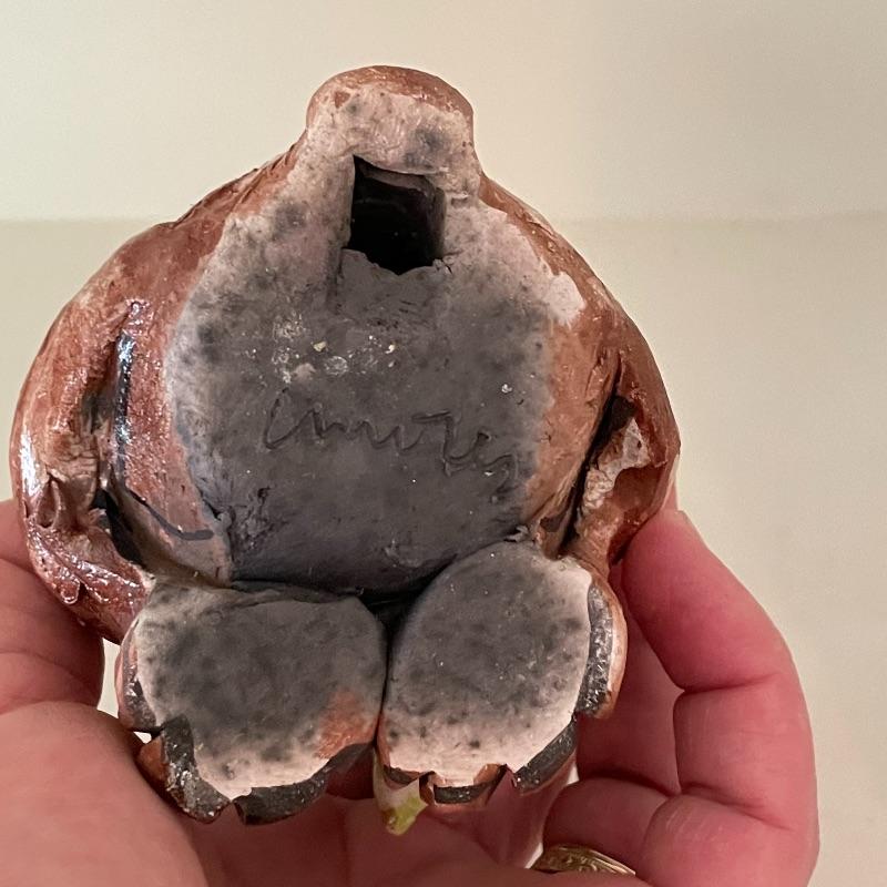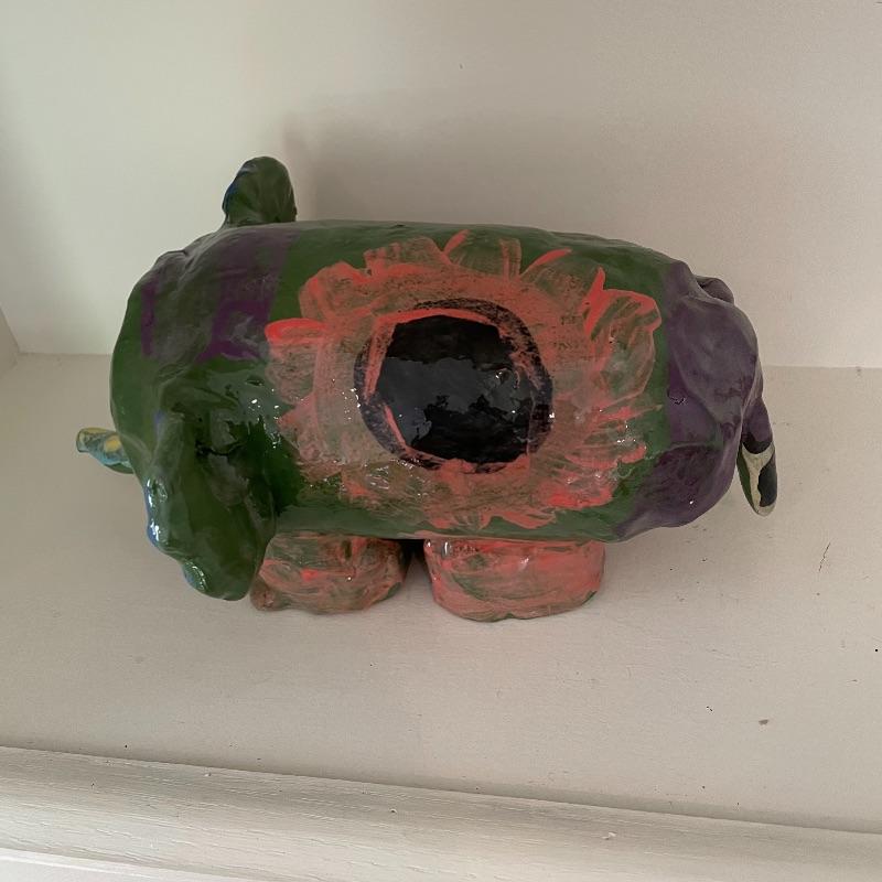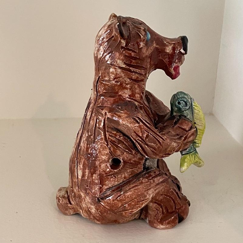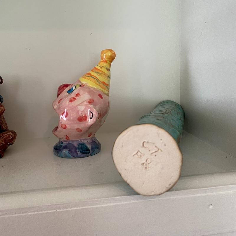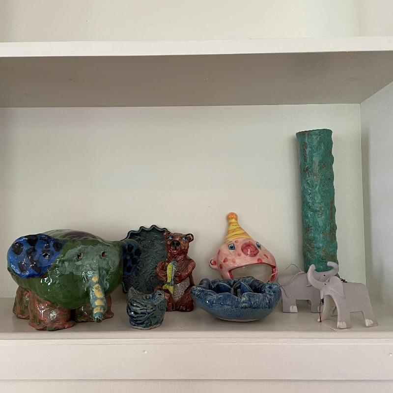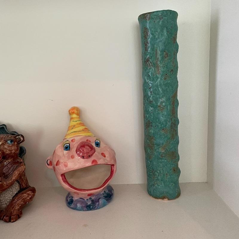 Here’s such a fun mix of professional and amateur pottery decor. There’s a beautiful 11” cylinder chime that makes music when moved and an adorable bear figuring that doubles as a whistle! Lot also includes two Evening Star Studio elephants, two small bowls, clown sponge bowl, and a bird frog. Lastly, lot features a big funky solid elephant. Show that funky side with this neat lot. Local pick up only.