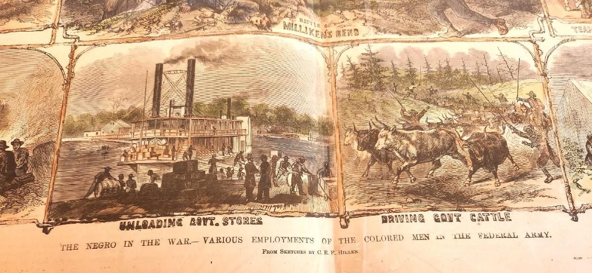 "The Negro in the War - various employments of Colored Men in the Federal Army" - Harper's Weekly, measures 23" x 18" . Hand-colored.