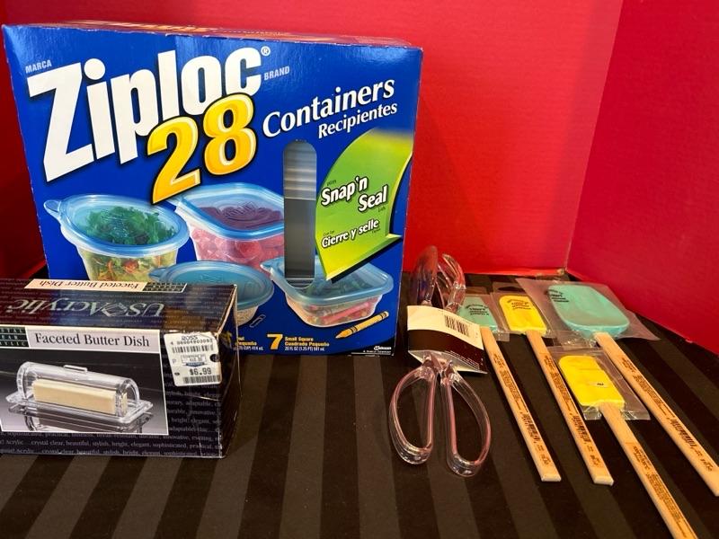 Ziploc food containers,1 butter dish, salad tongs,