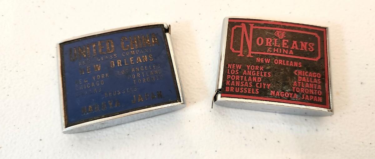 Lot of two identical Ione red, one blue) vintage advertising measuring tapes - New Orleans China Company. Each 2" x 1.5". Vintage condition.
