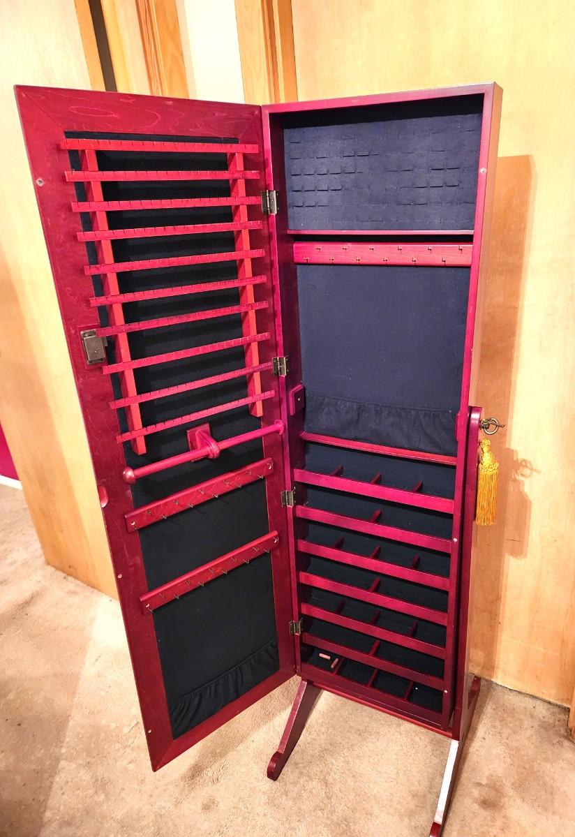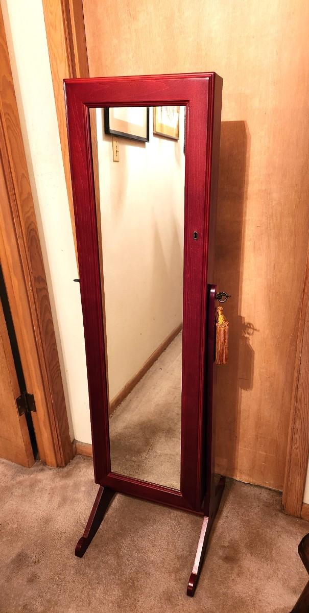 Standing Jewelry Armoire with mirror - has key. 56.5" tall, 18" across, 18" deep. Very clean. Mahogany finish.