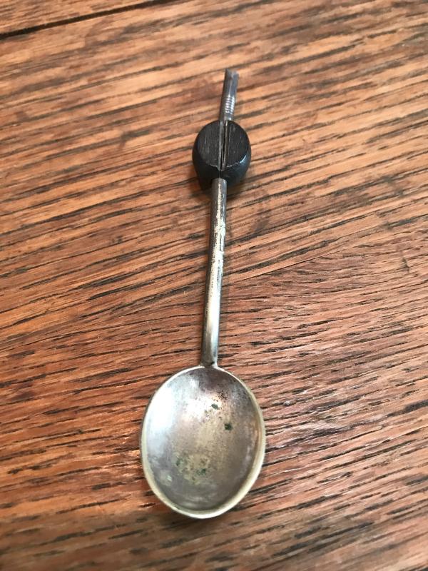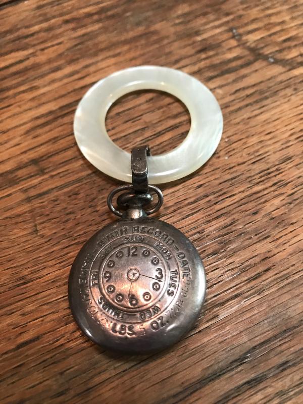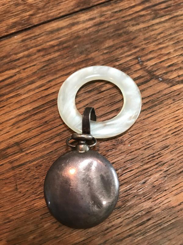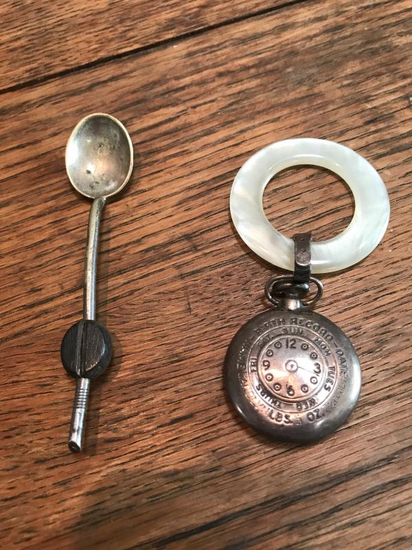 Baby teething rattle and small sugar spoon with coffee bean on it. Small dent in baby piece. Spoon is 4” long. This lot is available for shipping or local pick up in Asheville, NC.