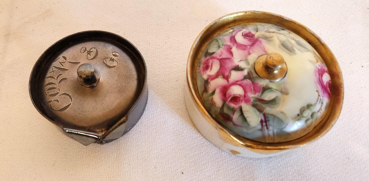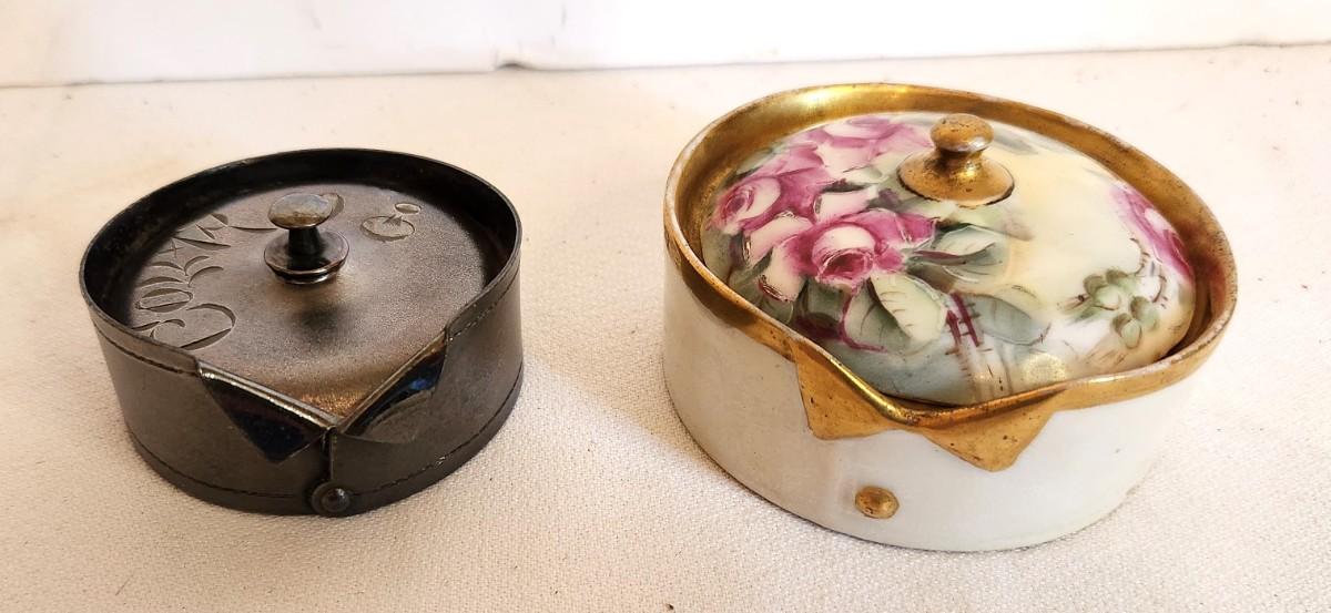 Sweet pairing of men's/women's collar stuff holders - antique, turn of the century. The gentleman's is metal, the lady's painted porcelain. Good antique condition.
