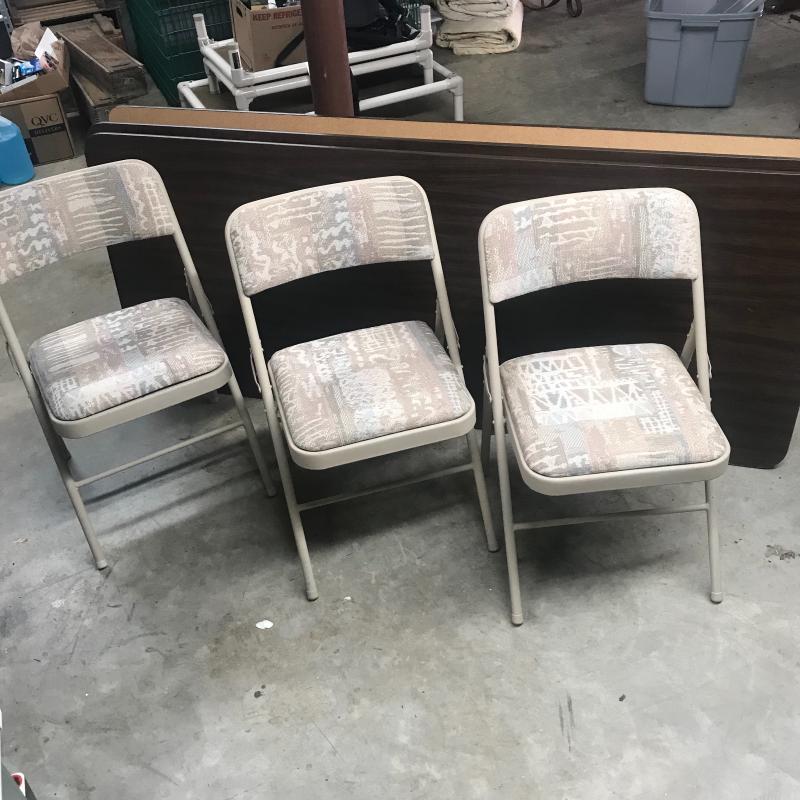 Three cushioned COSCO folding chairs and three heavy folding tables that measure 72” x30” x29”. Local pick up only.