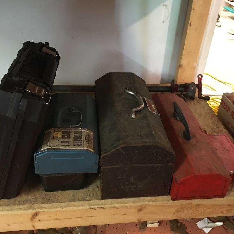 Buy this lot and organize your garage or shop! Lot includes five metal boxes in a variety of shapes and sizes and one plastic Dewalt box. Largest toolbox measures 7.5” x 16” x 8”, all empty and waiting for your tools. You can never have too many boxes.