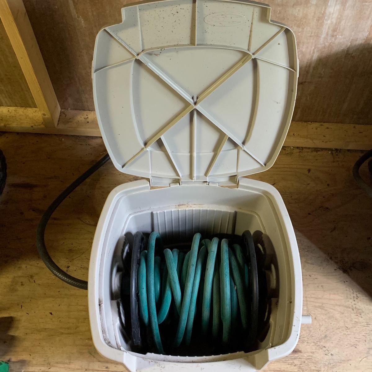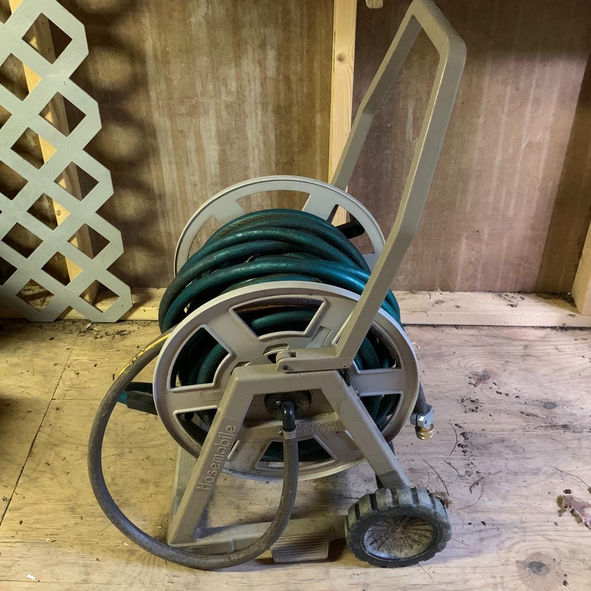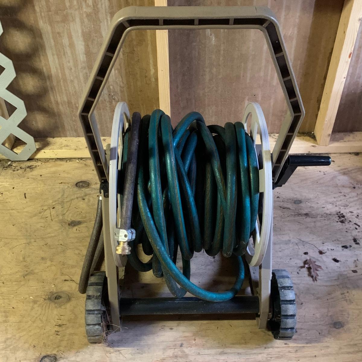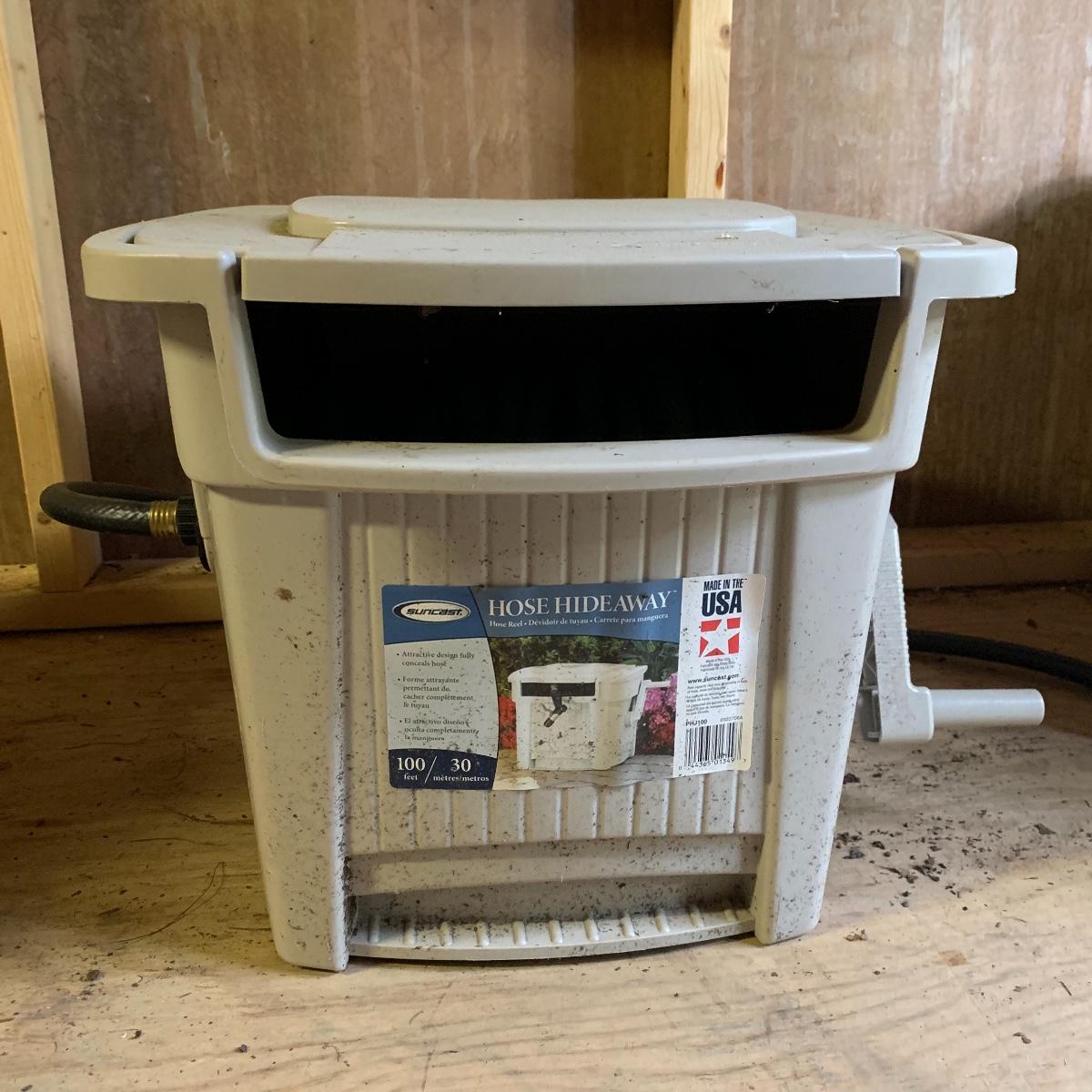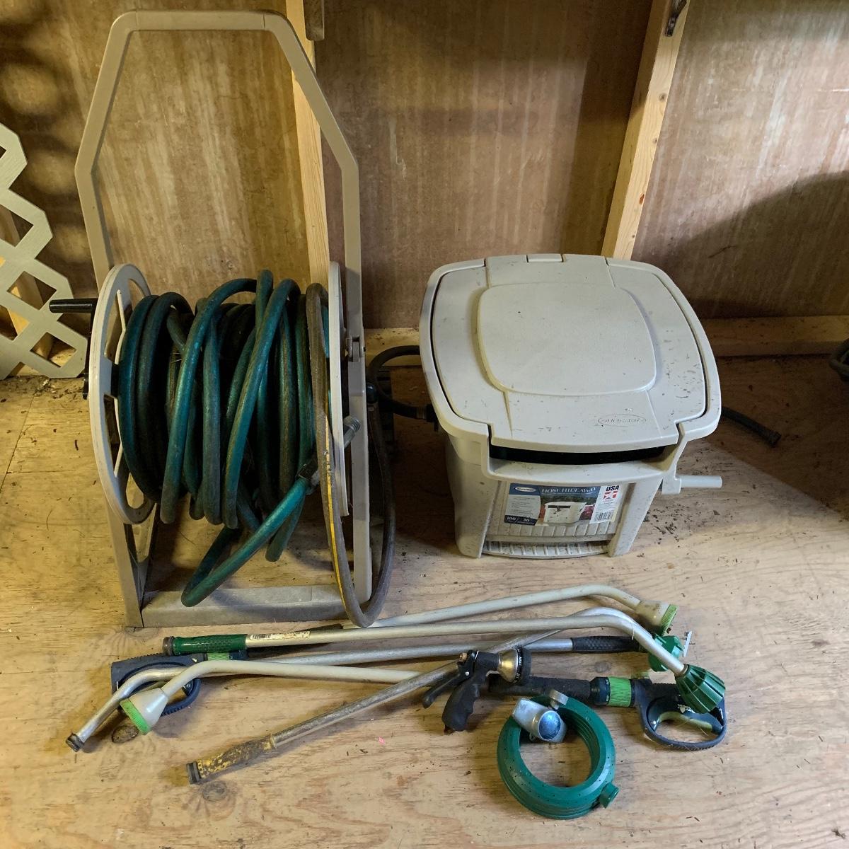 Water your garden with ease with the hose items found in this lot. Included are two hose reels with hoses, five long watering wands, and some sprinkler items. One hose reel is a Suncast Hose Hideaway hose reel that will hold 100 feet of hose. It is a light tan colored plastic tub with a lid that intends to fully conceal your hose. It measures about 19” x 19” x 16”. The other is a Suncast Hosemobile. It is a light tan plastic base that has two wheels and a handle. It measures about 19” x 19” x 22” with the handle height of 33”. Both hose reels are fully equipped with hoses. The watering wands are around 30-35” long. Two are Ray Paula brand that have a handle to control the wand and various stream settings. See photos for details. Local pickup only.