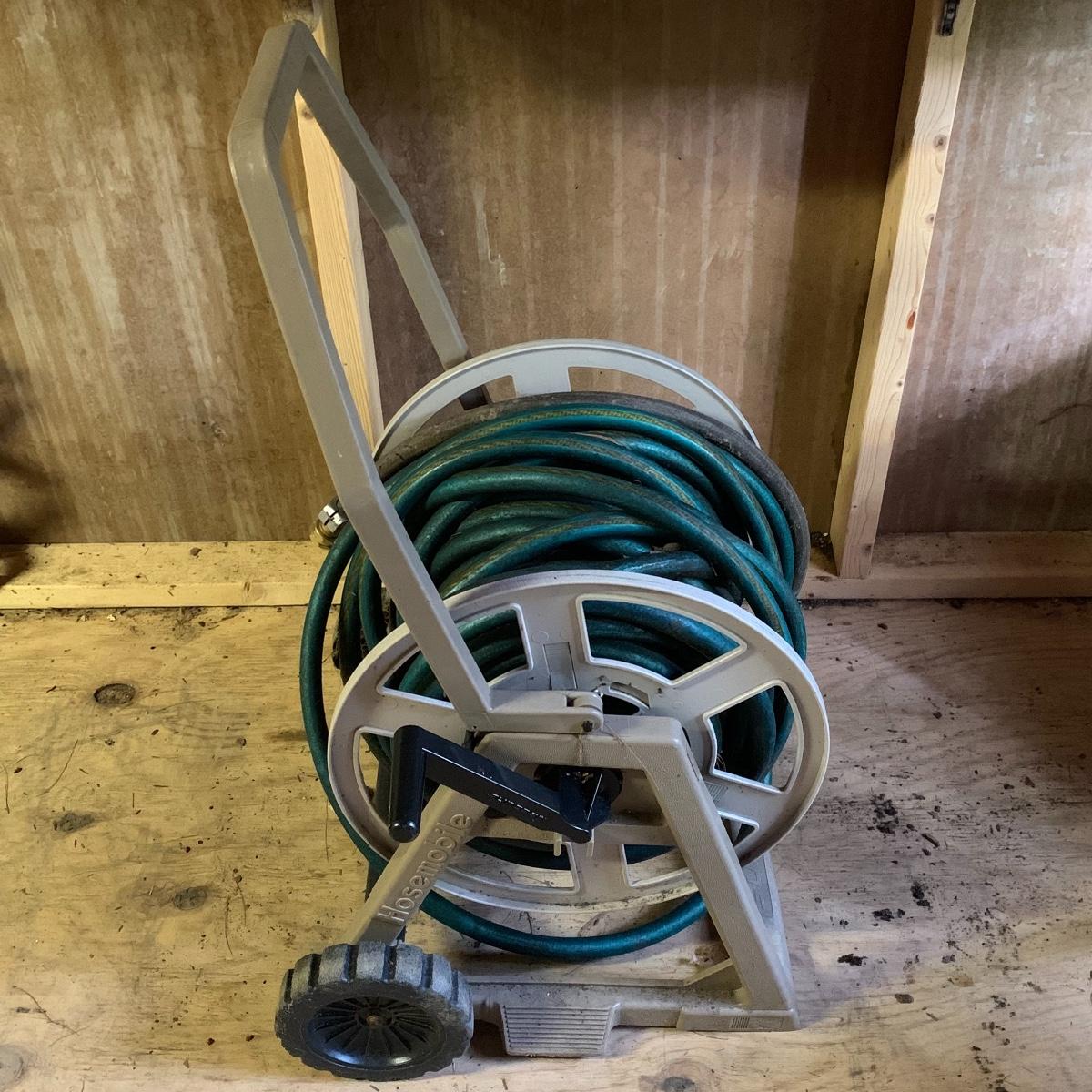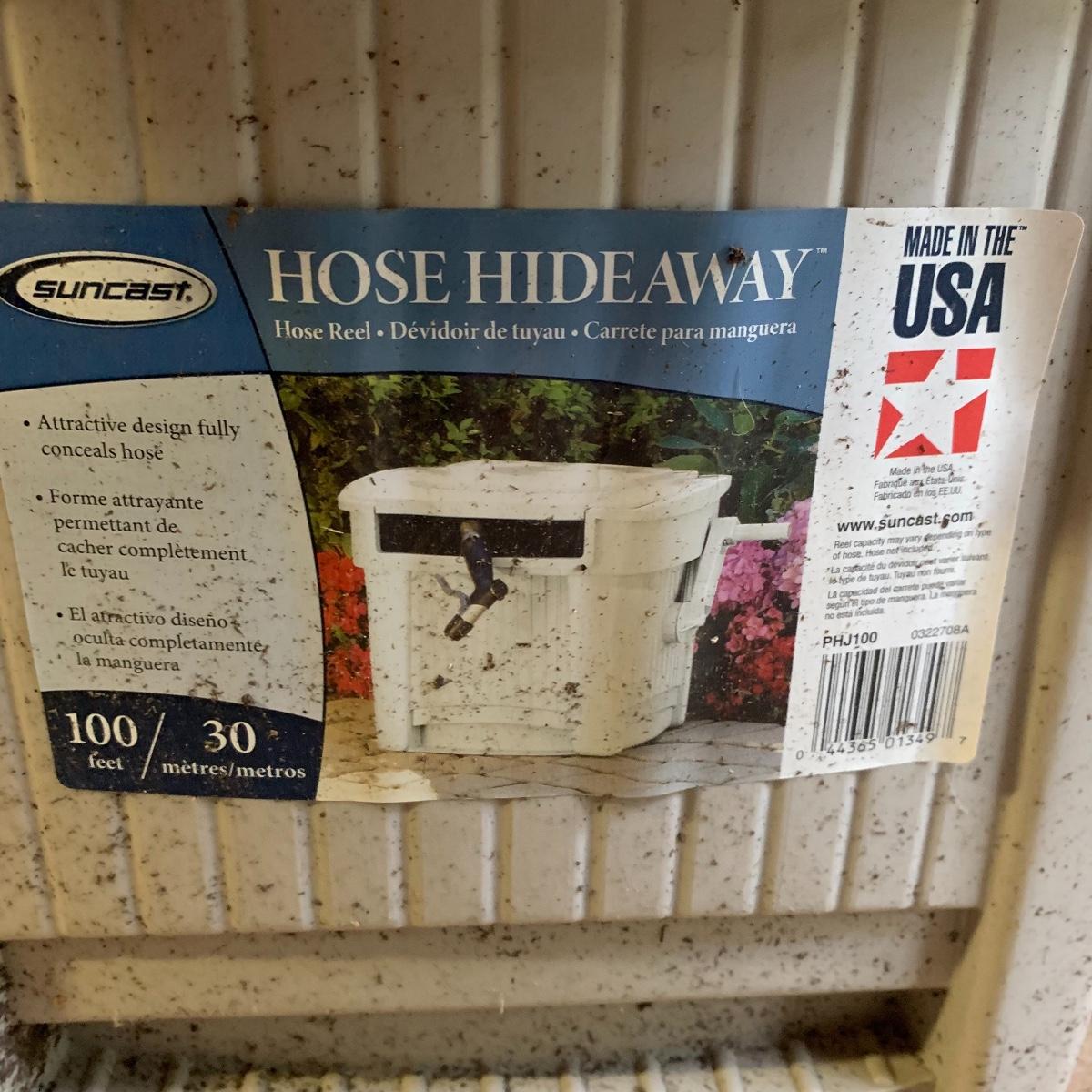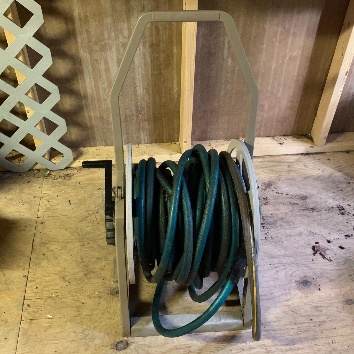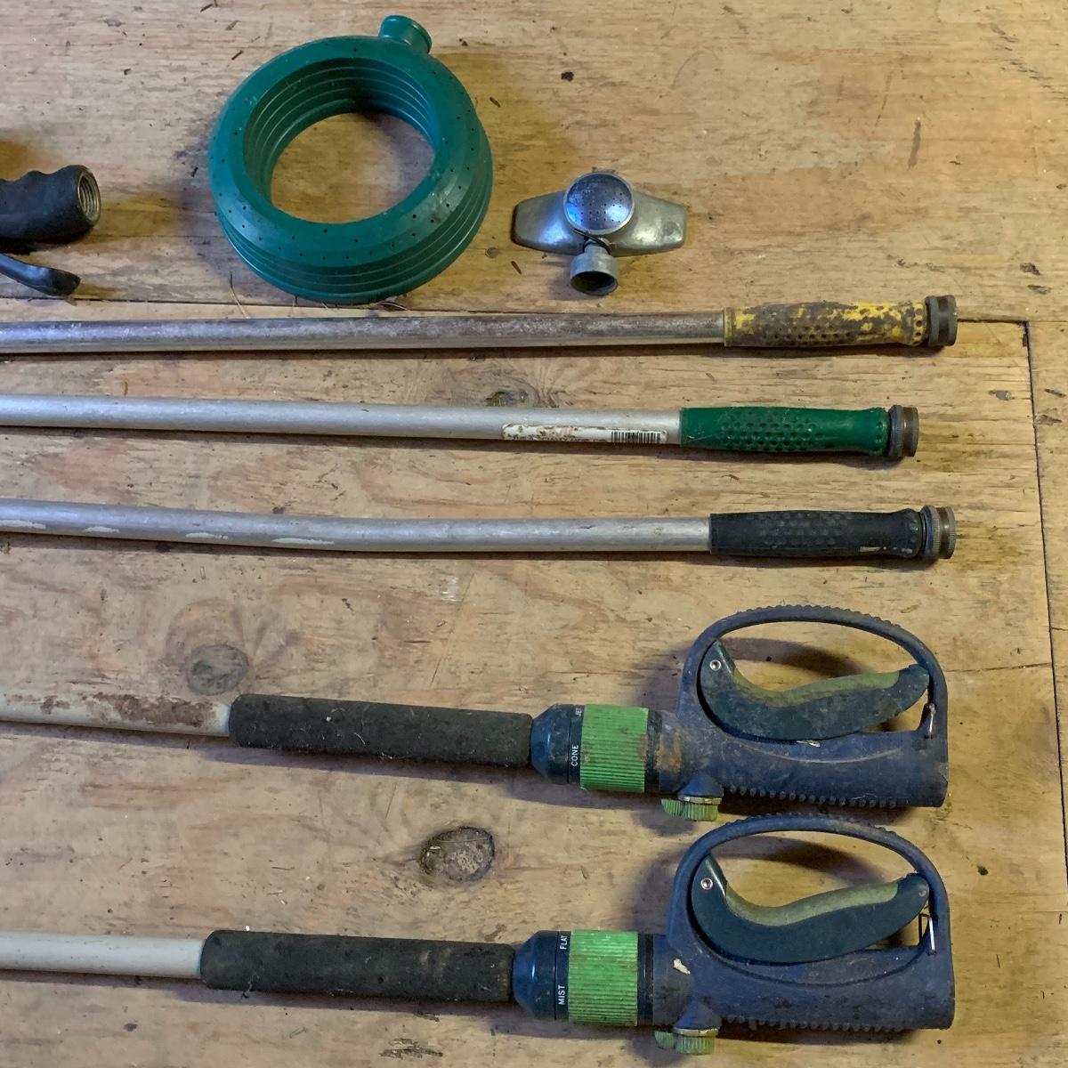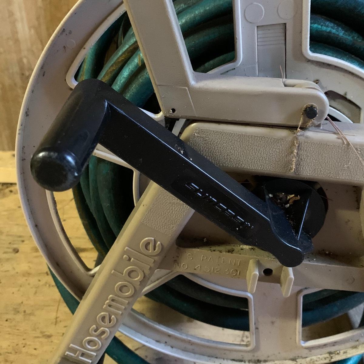 Water your garden with ease with the hose items found in this lot. Included are two hose reels with hoses, five long watering wands, and some sprinkler items. One hose reel is a Suncast Hose Hideaway hose reel that will hold 100 feet of hose. It is a light tan colored plastic tub with a lid that intends to fully conceal your hose. It measures about 19” x 19” x 16”. The other is a Suncast Hosemobile. It is a light tan plastic base that has two wheels and a handle. It measures about 19” x 19” x 22” with the handle height of 33”. Both hose reels are fully equipped with hoses. The watering wands are around 30-35” long. Two are Ray Paula brand that have a handle to control the wand and various stream settings. See photos for details. Local pickup only.