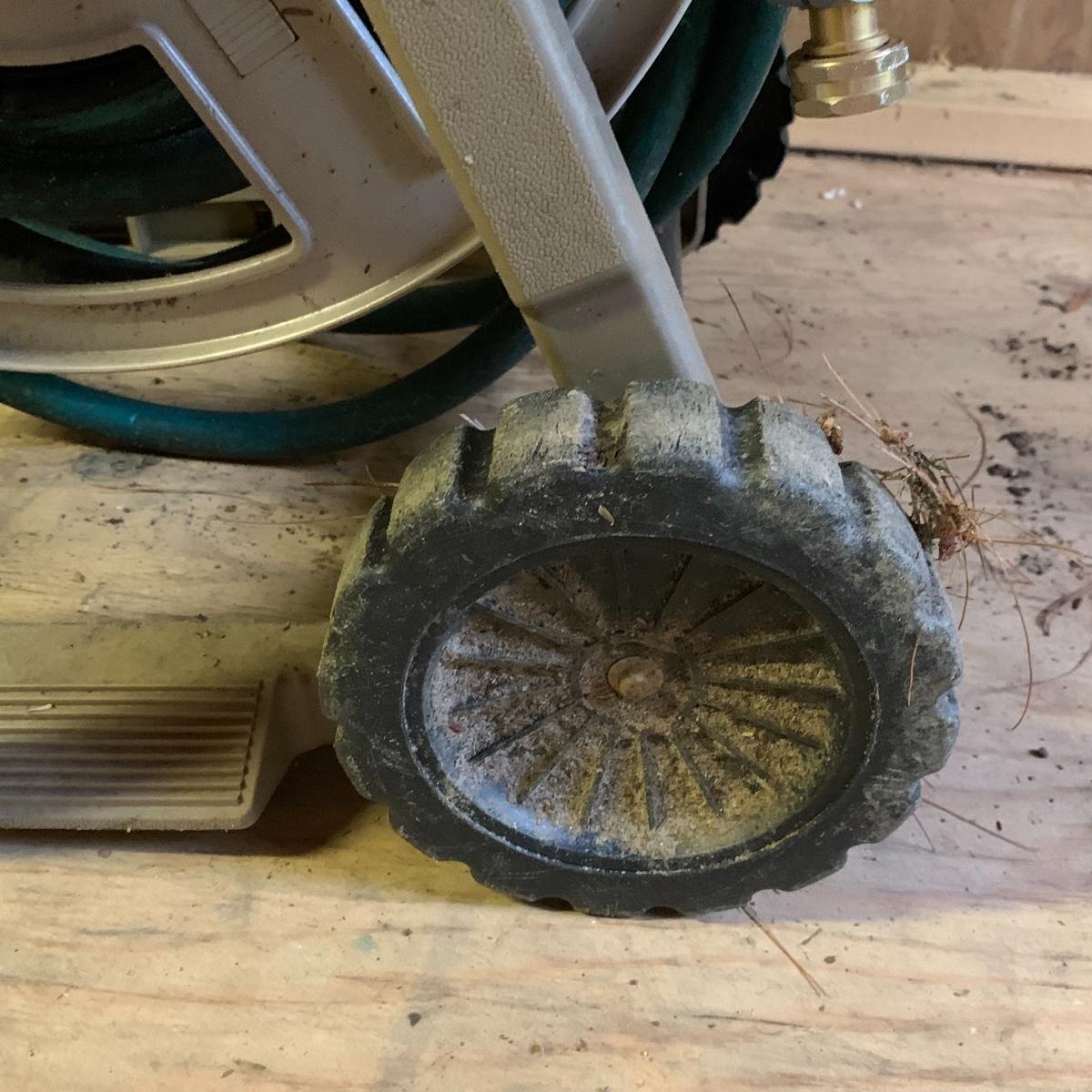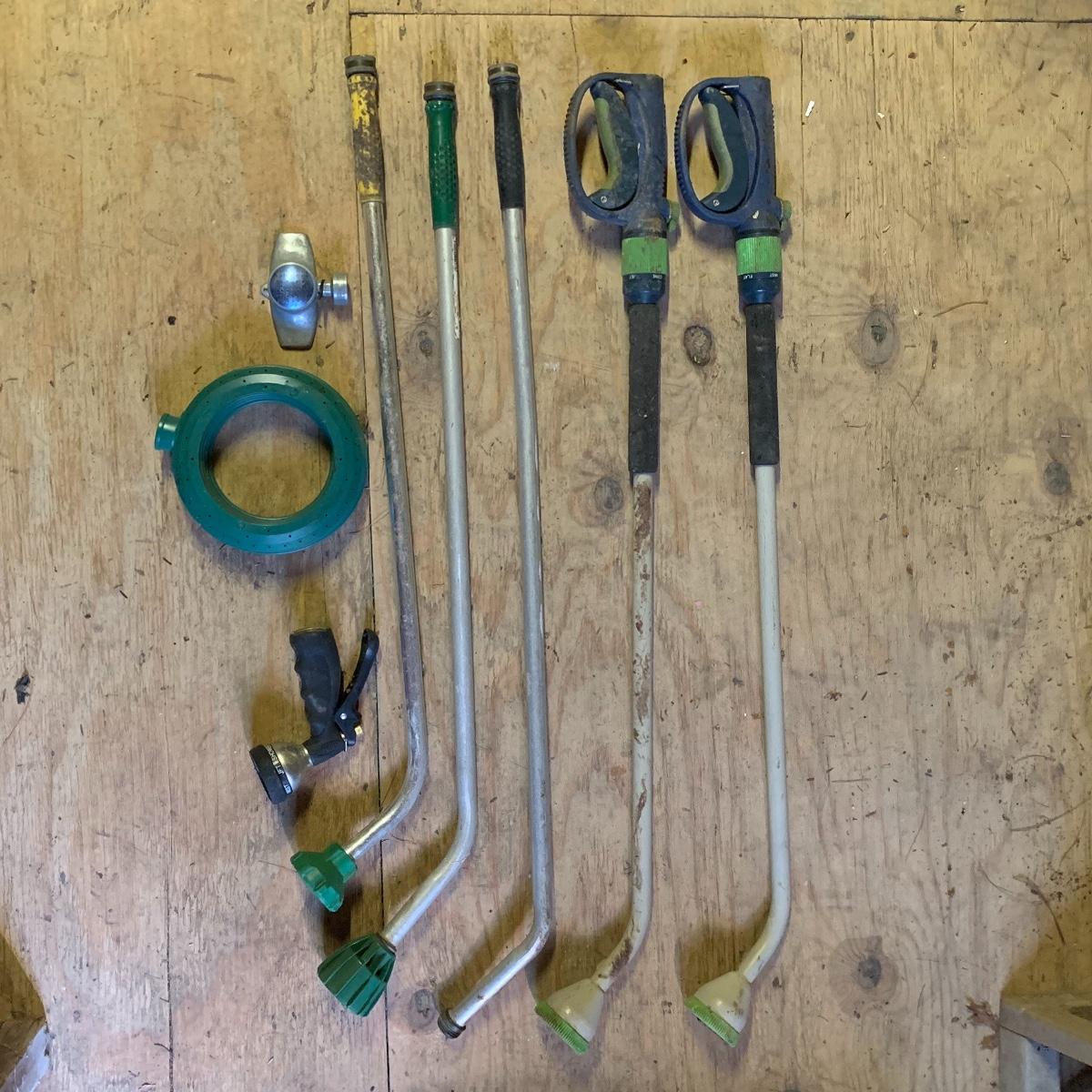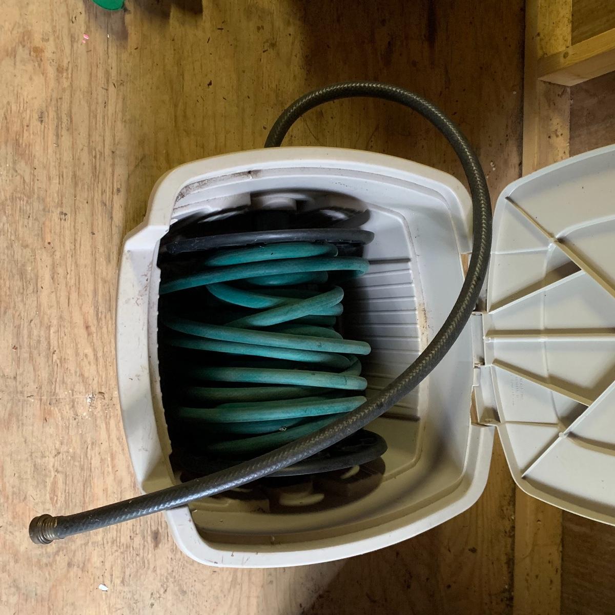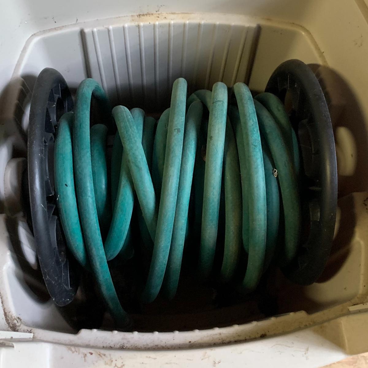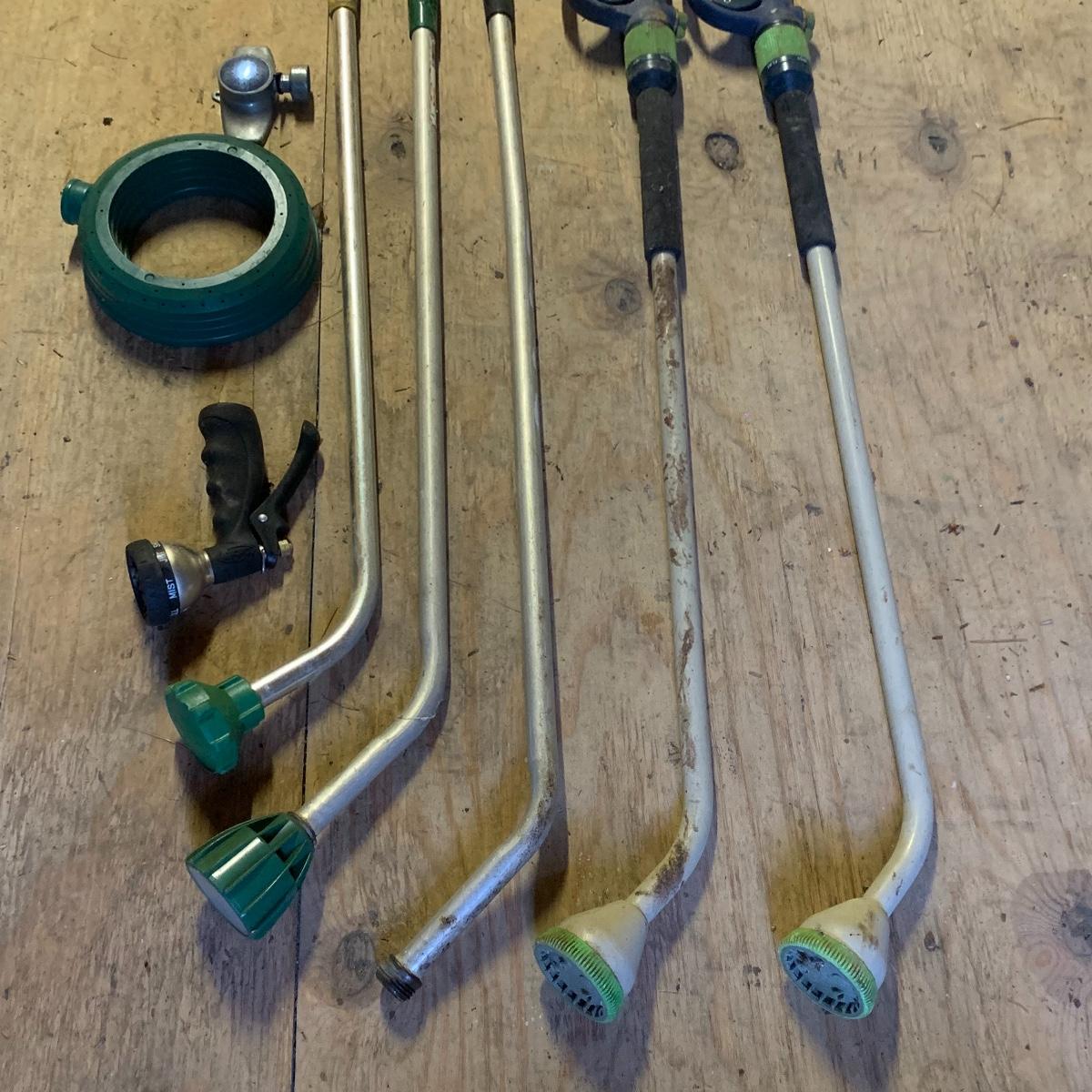 Water your garden with ease with the hose items found in this lot. Included are two hose reels with hoses, five long watering wands, and some sprinkler items. One hose reel is a Suncast Hose Hideaway hose reel that will hold 100 feet of hose. It is a light tan colored plastic tub with a lid that intends to fully conceal your hose. It measures about 19” x 19” x 16”. The other is a Suncast Hosemobile. It is a light tan plastic base that has two wheels and a handle. It measures about 19” x 19” x 22” with the handle height of 33”. Both hose reels are fully equipped with hoses. The watering wands are around 30-35” long. Two are Ray Paula brand that have a handle to control the wand and various stream settings. See photos for details. Local pickup only.