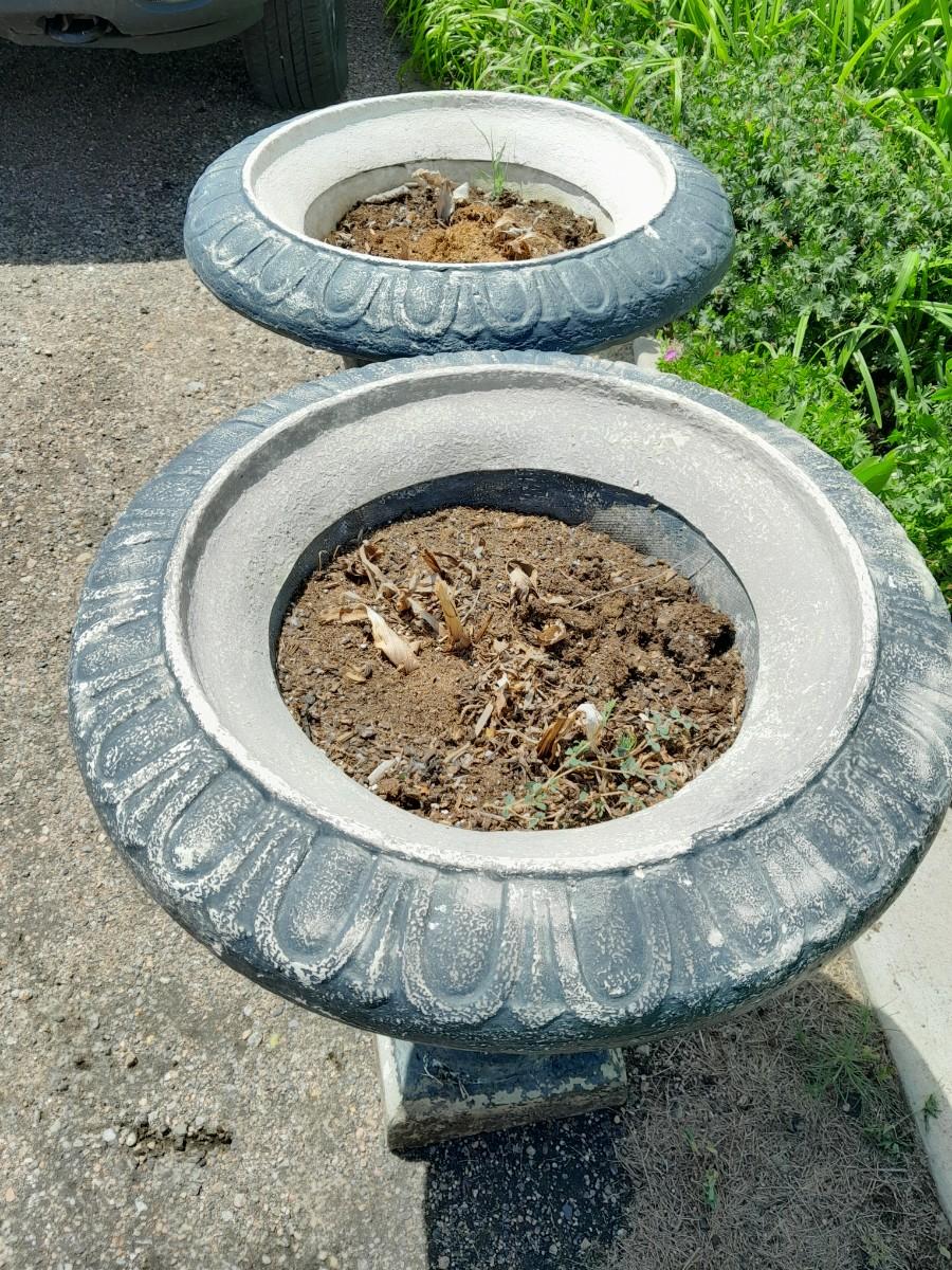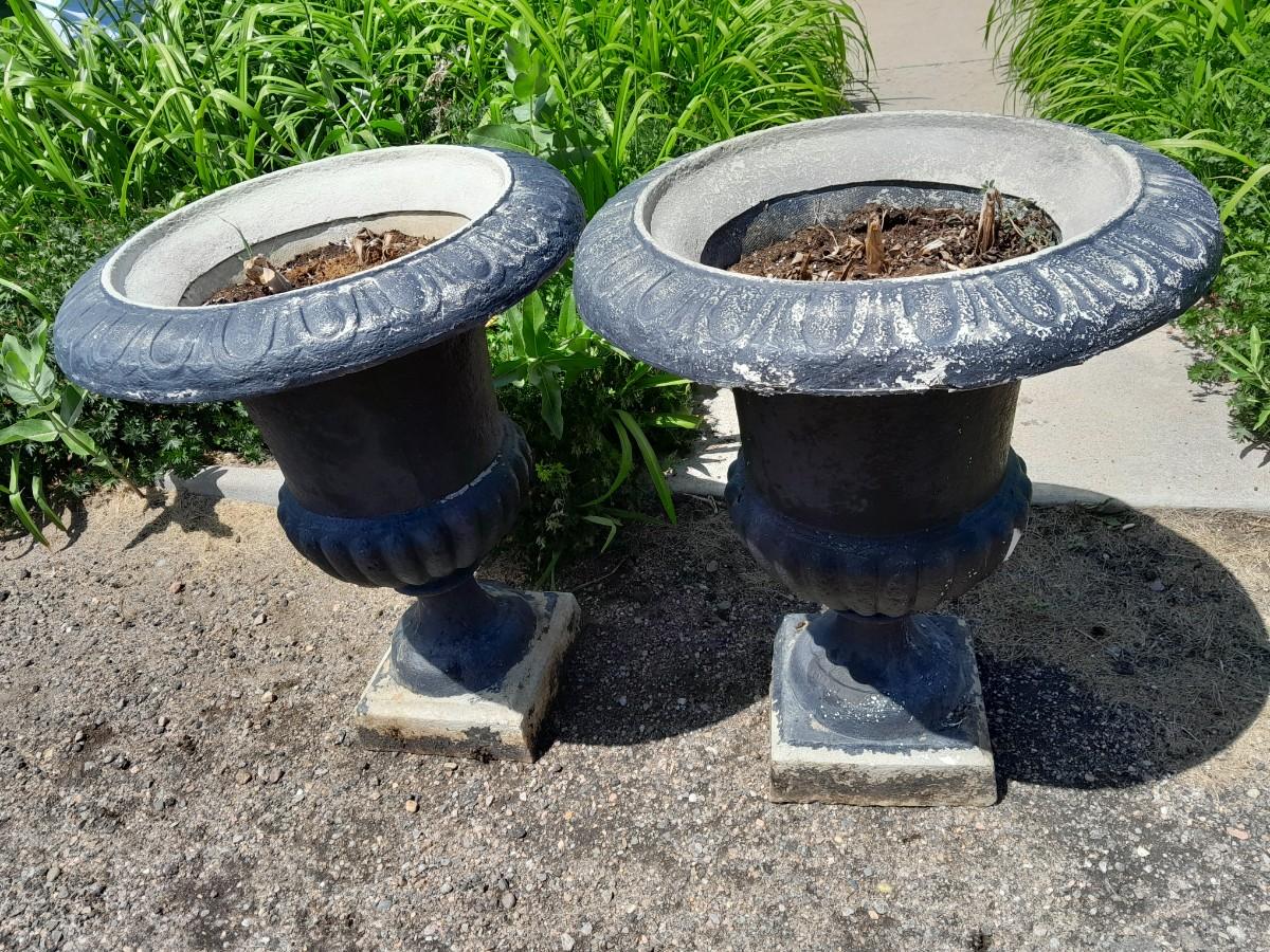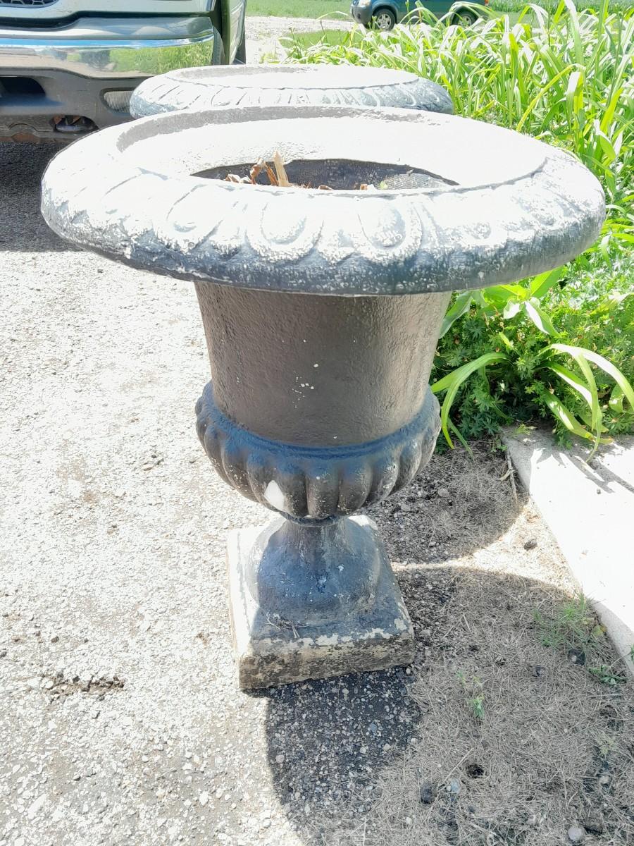 TWO URN STYLE PEDESTAL FLOWER POTS (one has damage as shown) 26" X 23"