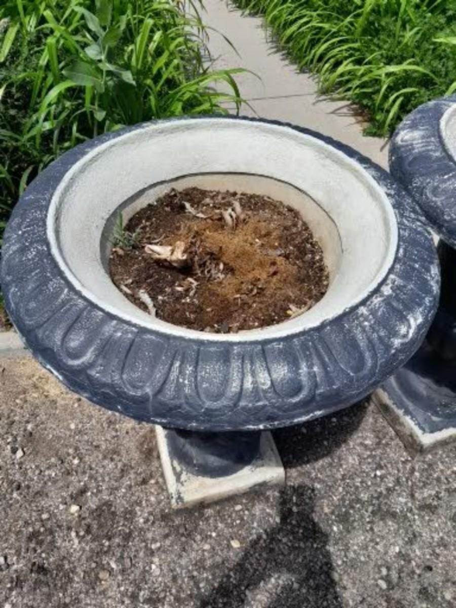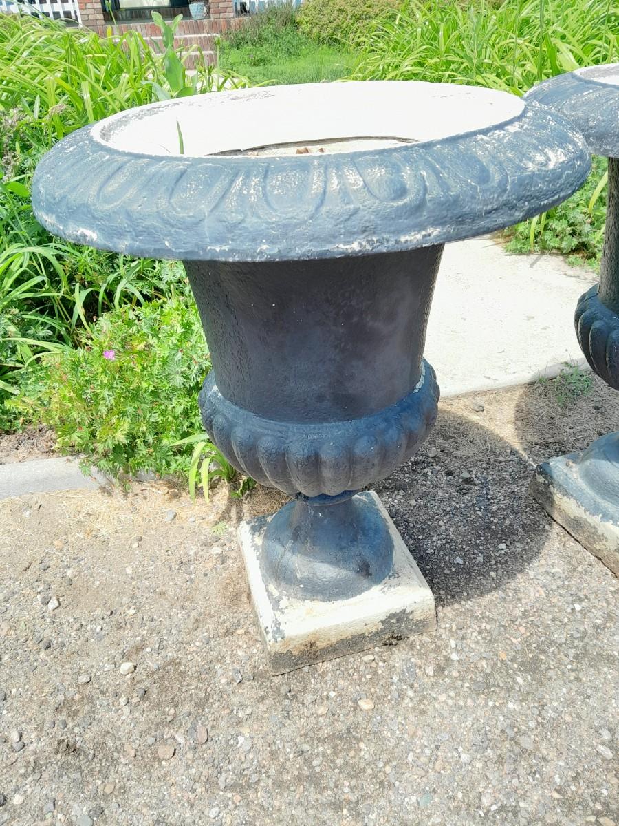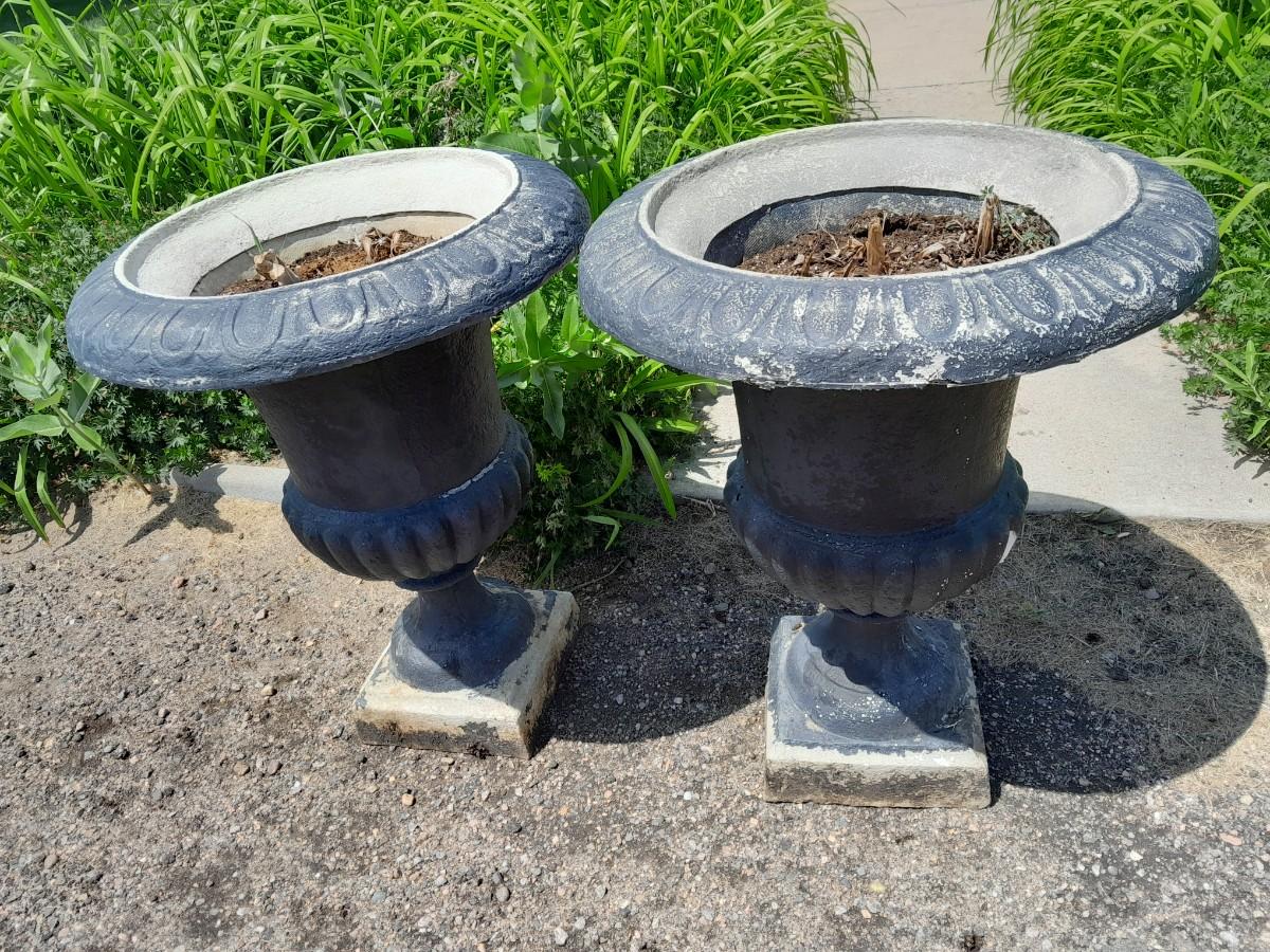 TWO URN STYLE PEDESTAL FLOWER POTS (one has damage as shown) 26" X 23"