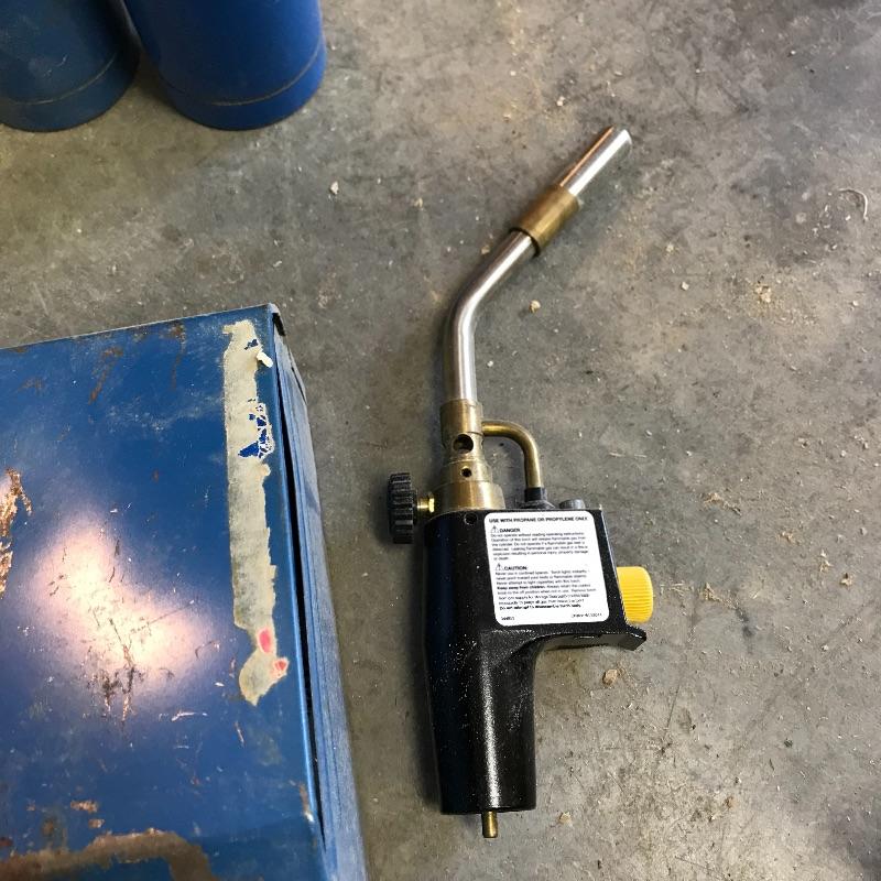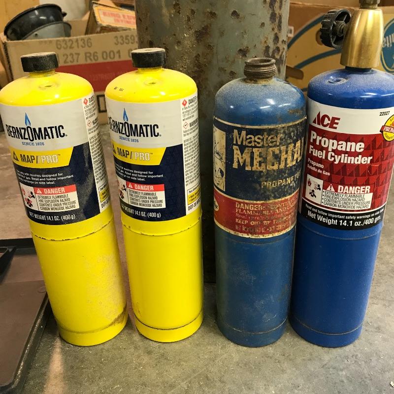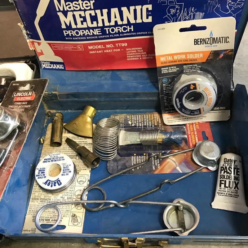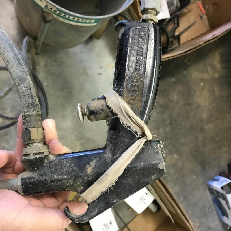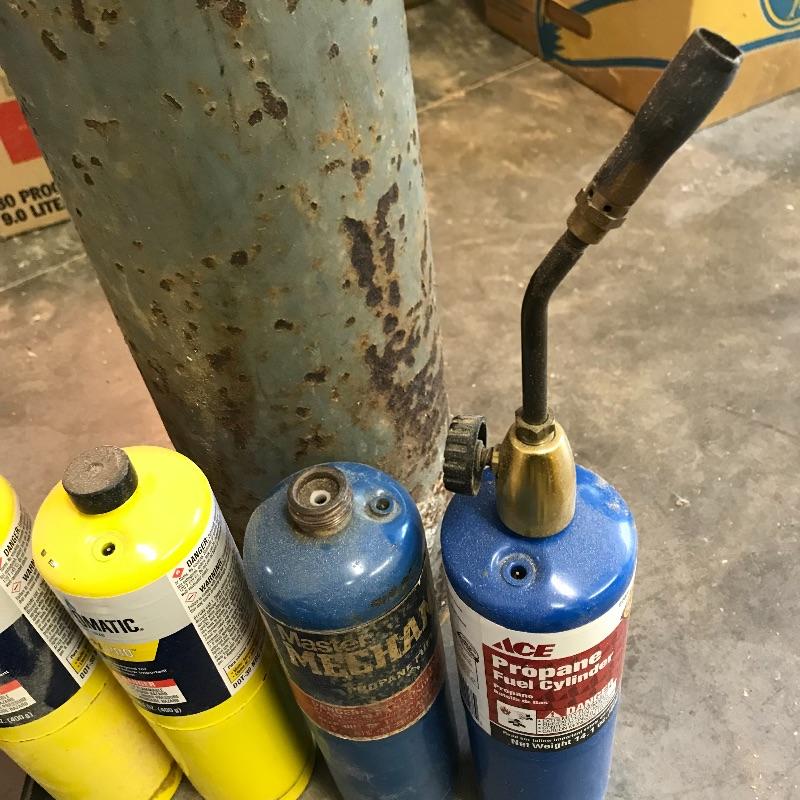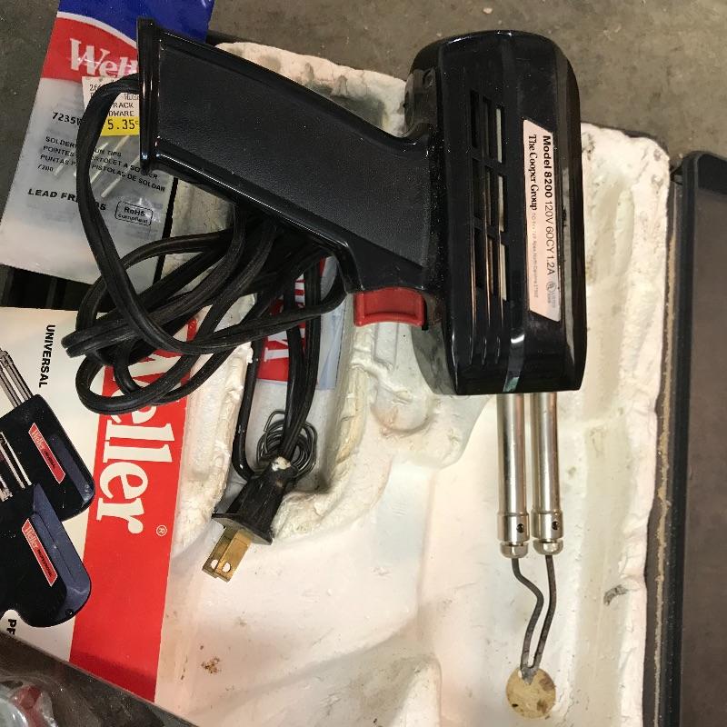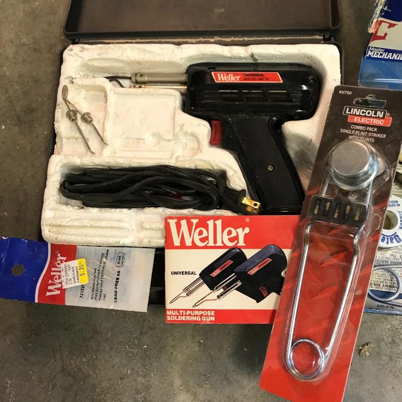 Weller Heavy Duty Soldering Gun model 8200. Two benzomatic cylinders with a torch of the same name. Lot includes two blue propane cylinders and a large acetylene tank. Sears Utility sandblaster set. We cannot verify any contents or gas quantity of cylinders. Other accessories noted in photos. No shipping.