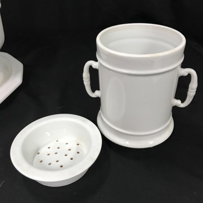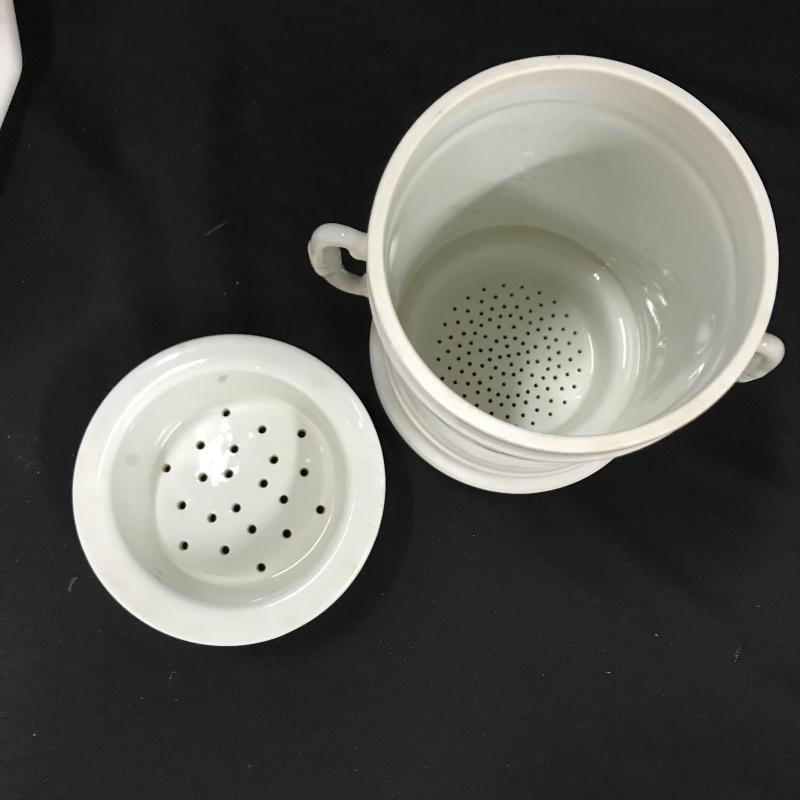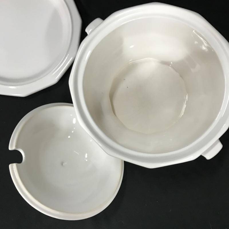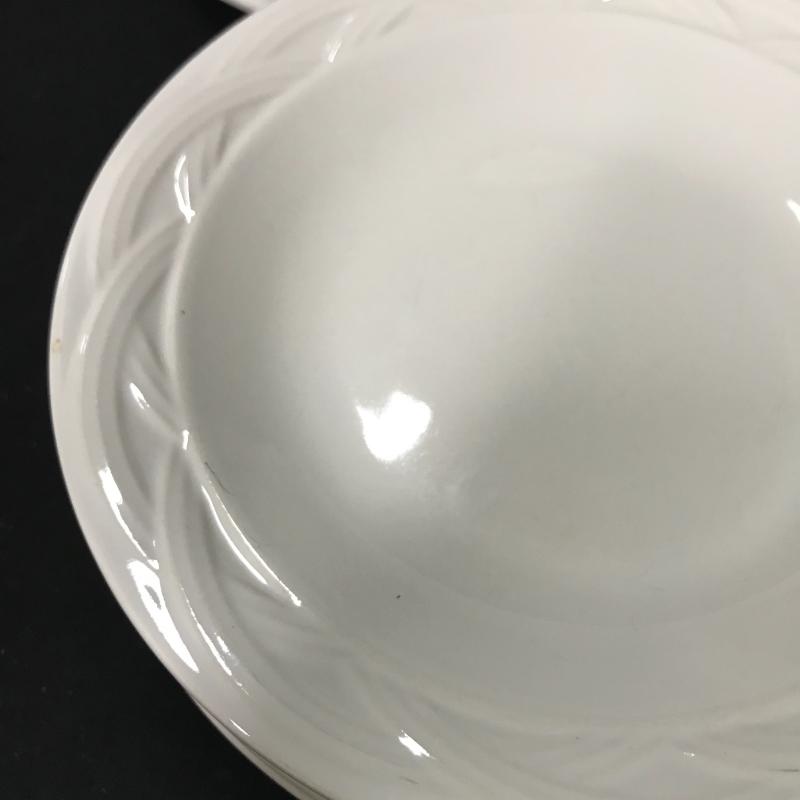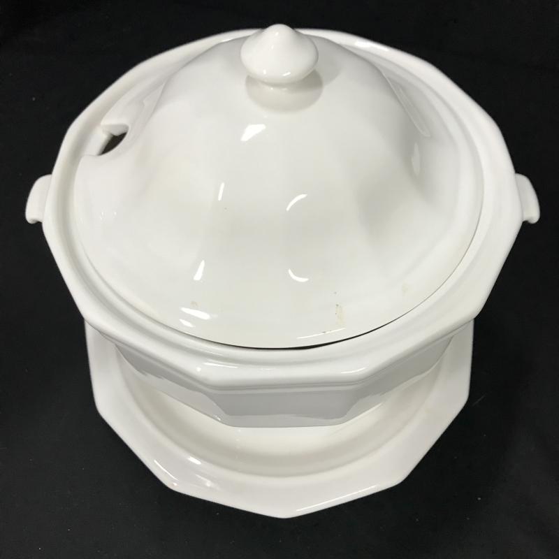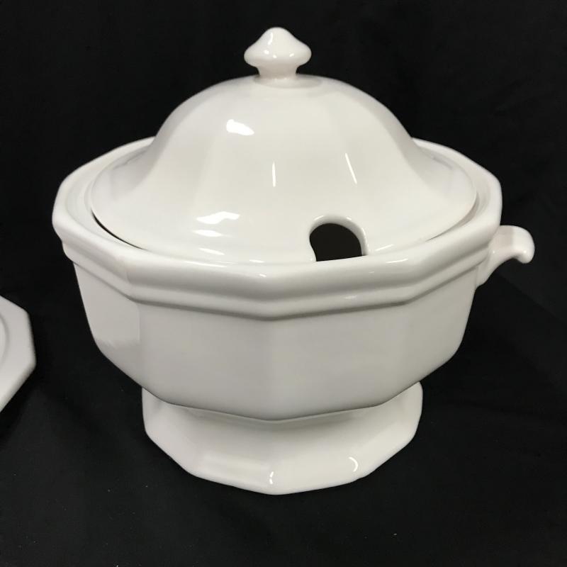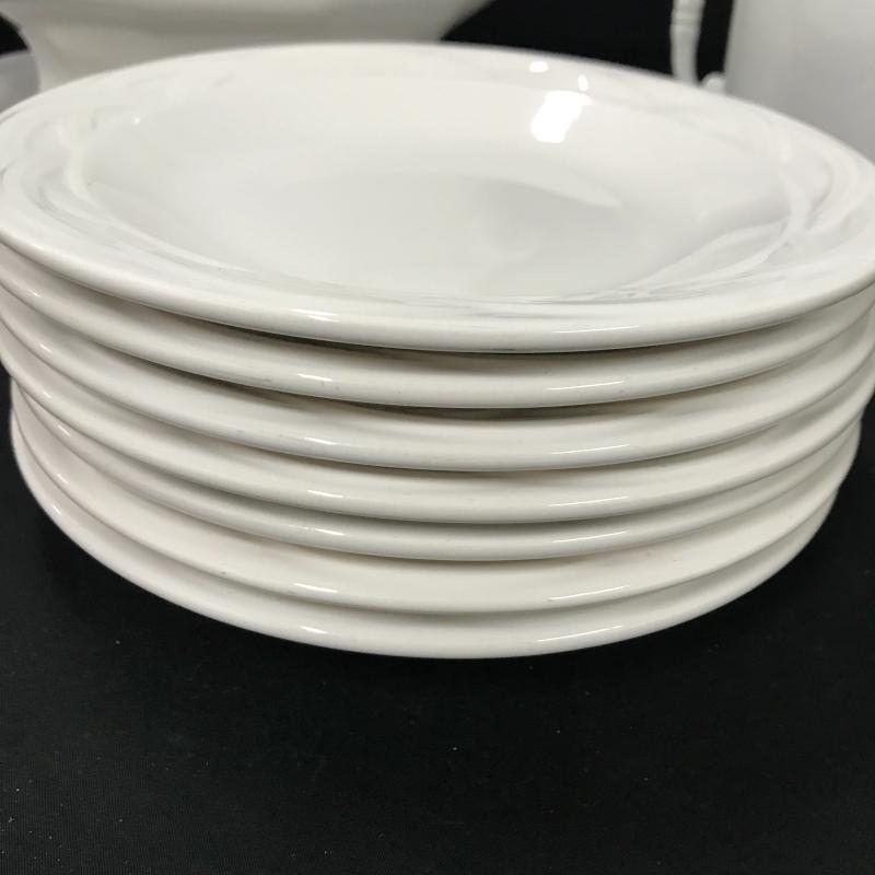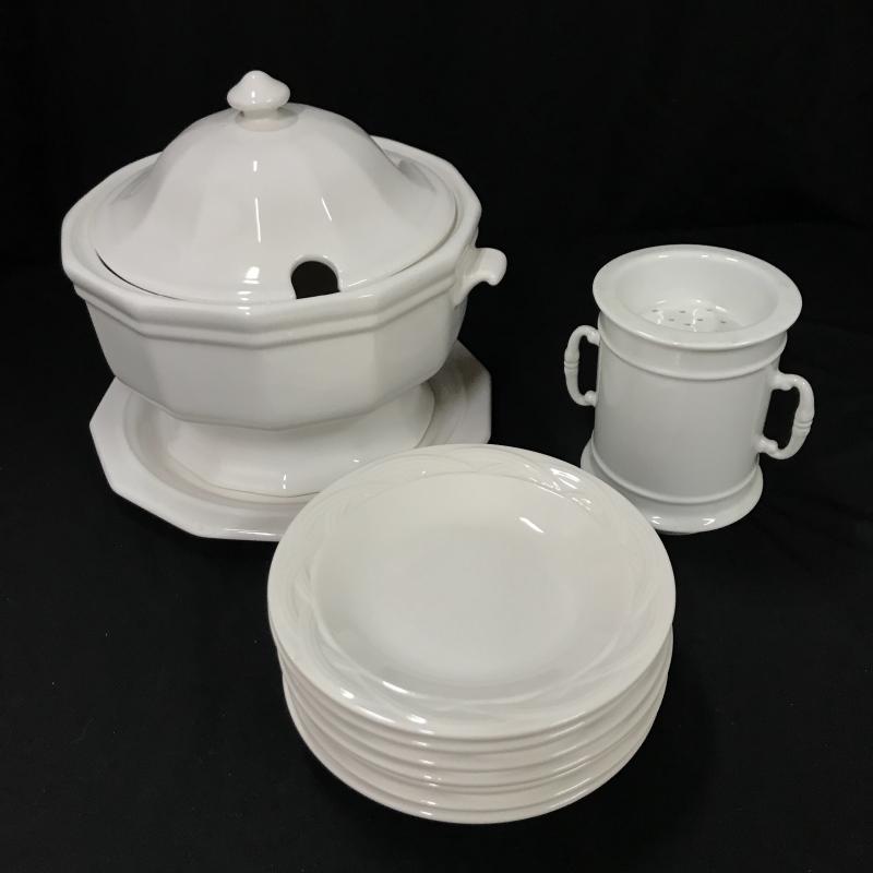 Variety of White dishes. 7 Bowls by Pfaltzgraff are 7.5”d. Large Soup Tureen is approximately 11”d by 9.5”h. Top is not a solid fit and may not be original. No spoon. Plate under Tureen is 10.5”d. Shipping or local pick up in Asheville